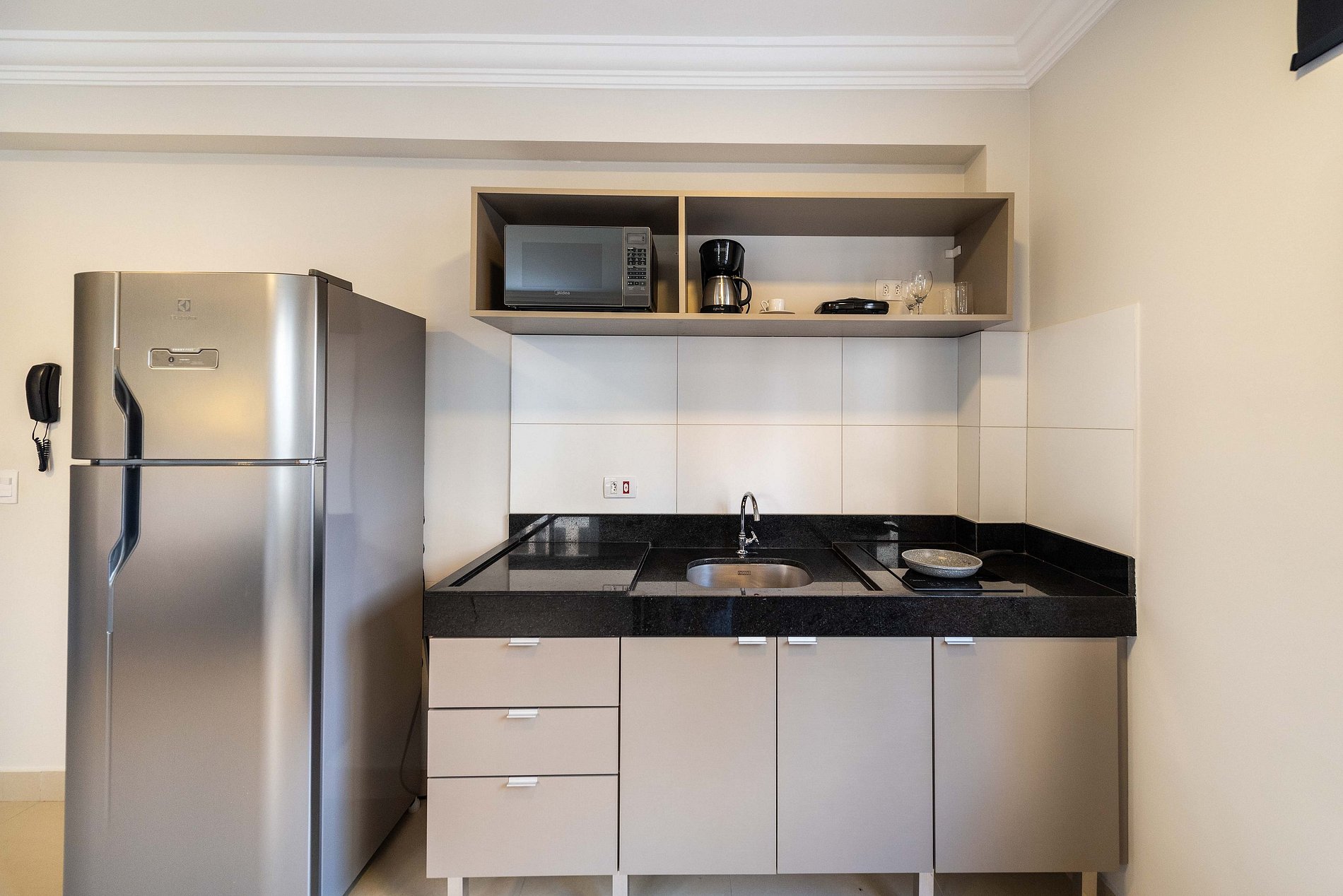 ・Cozinha completa: equipada com geladeira, fogão de indução, micro-ondas etc.