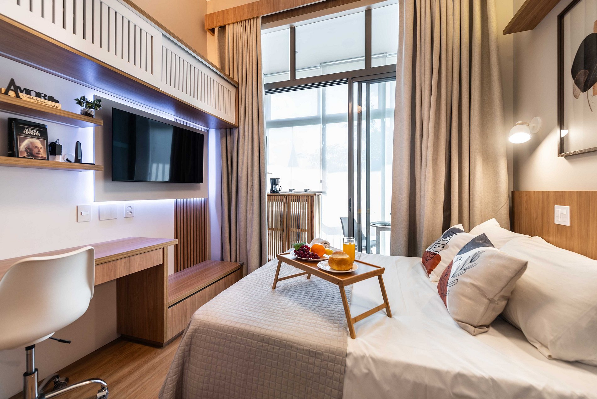 Desfrute de uma estadia agradável em nosso studio bem planejado, ideal para acomodar até 3 pessoas. O espaço conta com tudo o que você precisa para uma experiência confortável: uma cama de casal, um sofá-cama, uma cozinha compacta equipada com eletrodomésticos essenciais, um banheiro moderno e uma área de estar funcional. Perfeito para quem busca praticidade e conforto em um ambiente aconchegante.