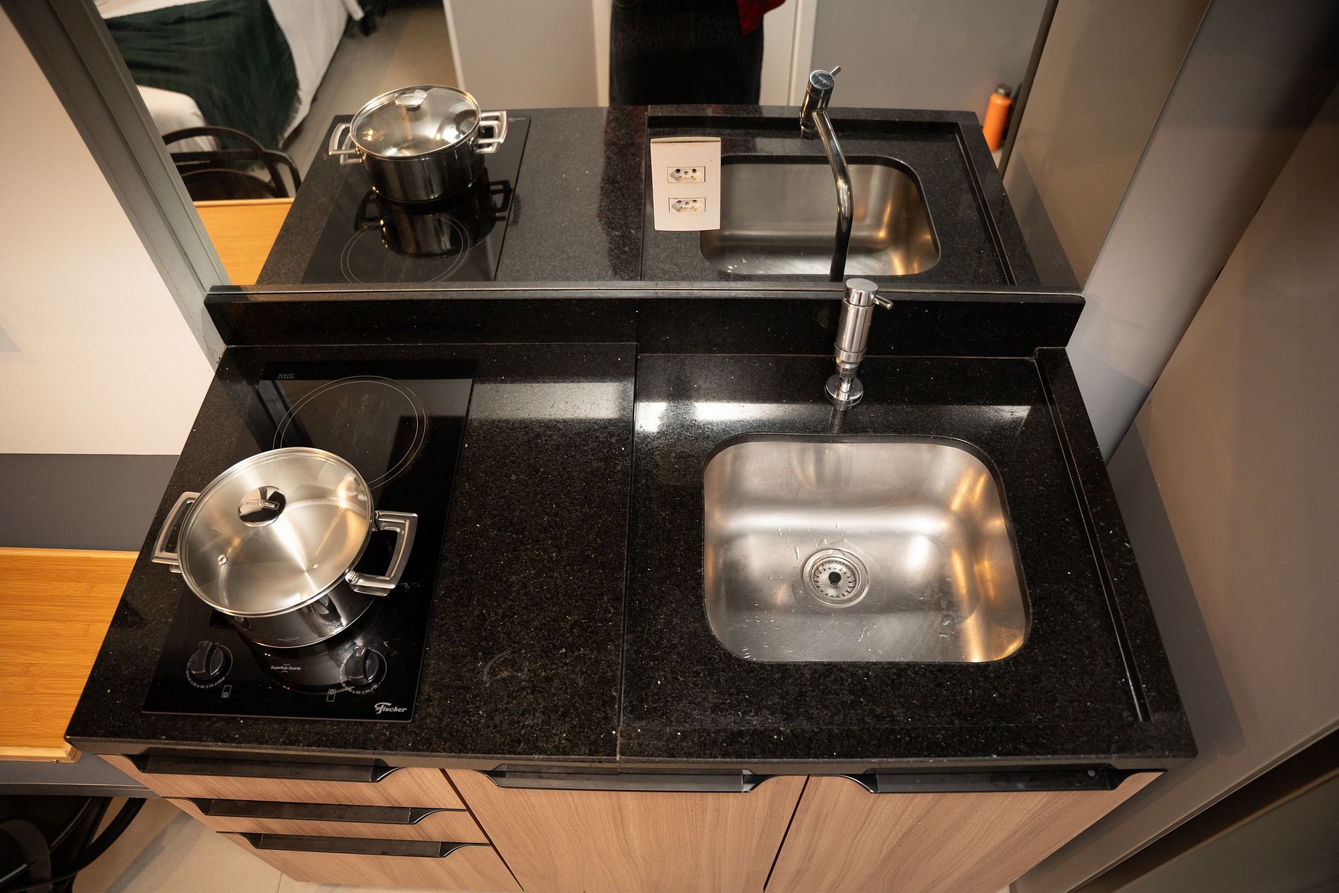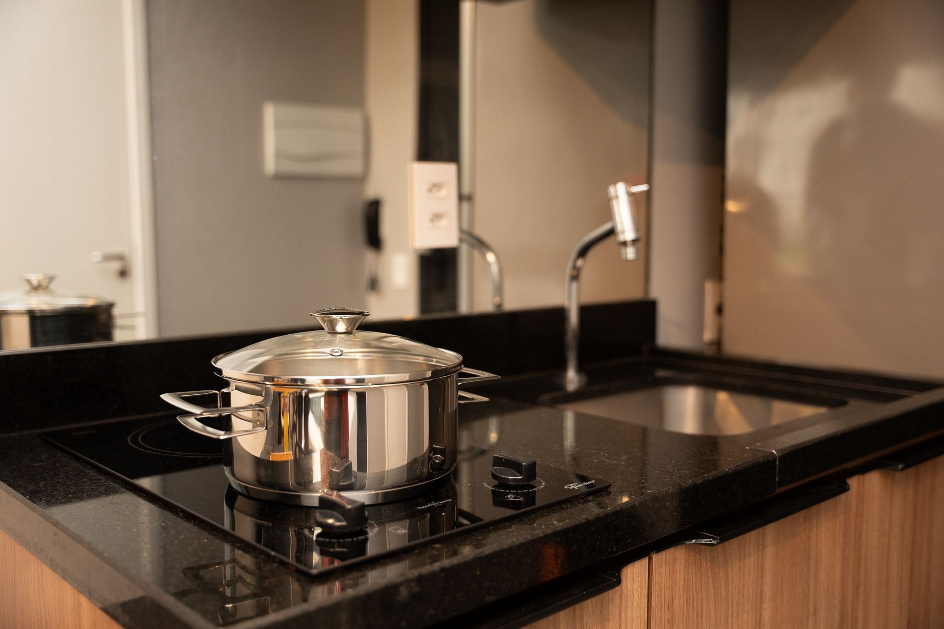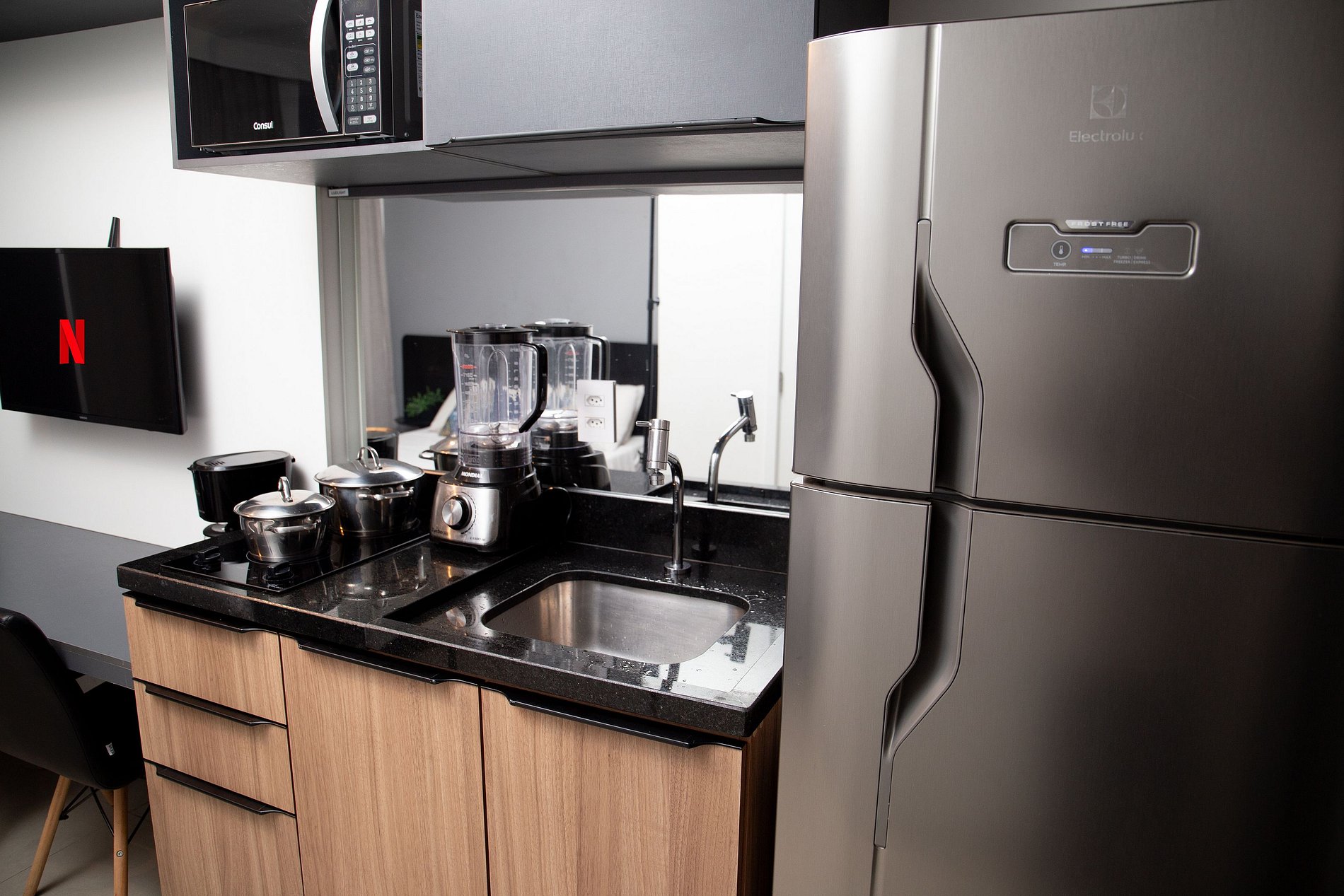 ・Cozinha completa: equipada com geladeira, fogão de indução, micro-ondas etc.
