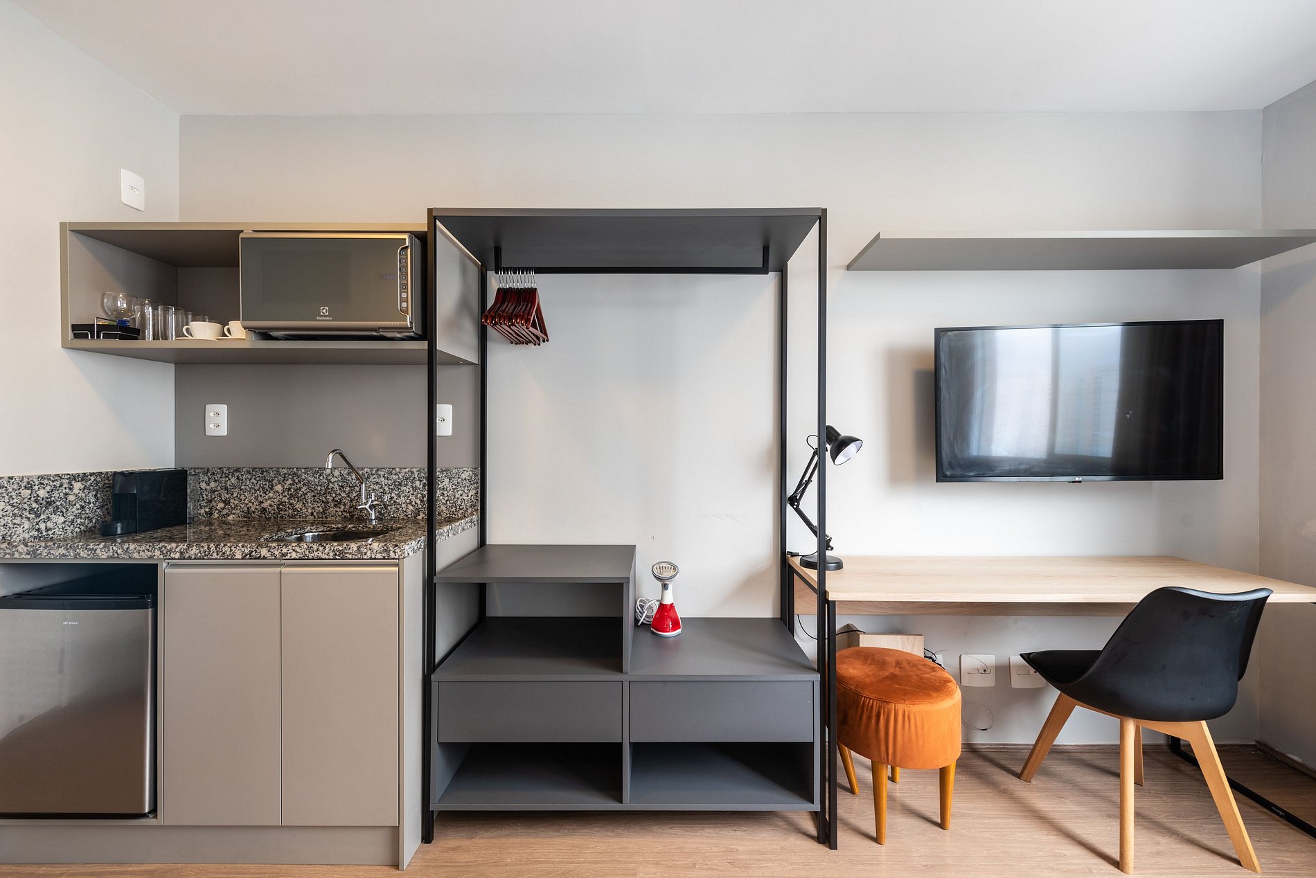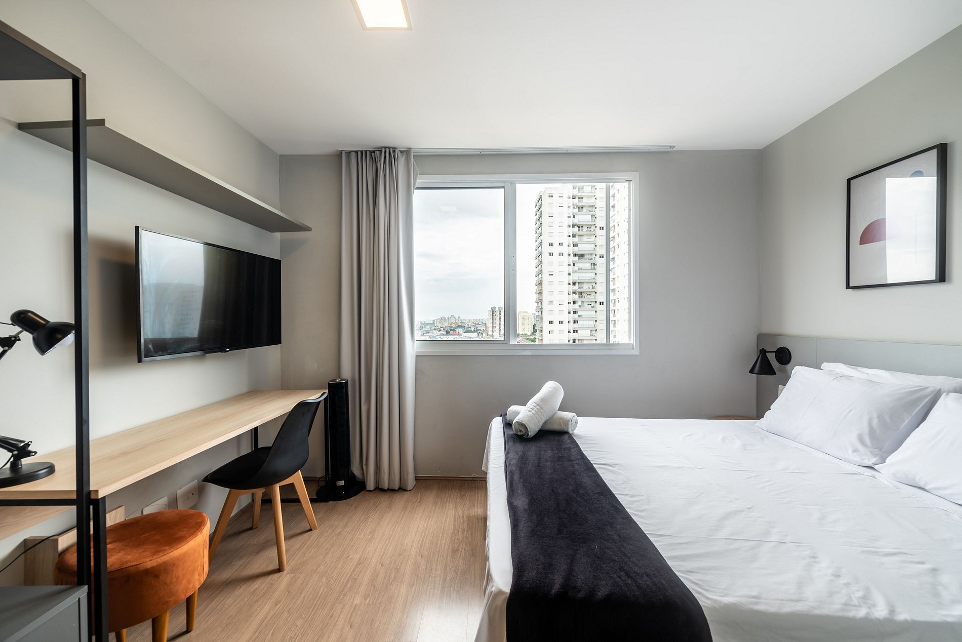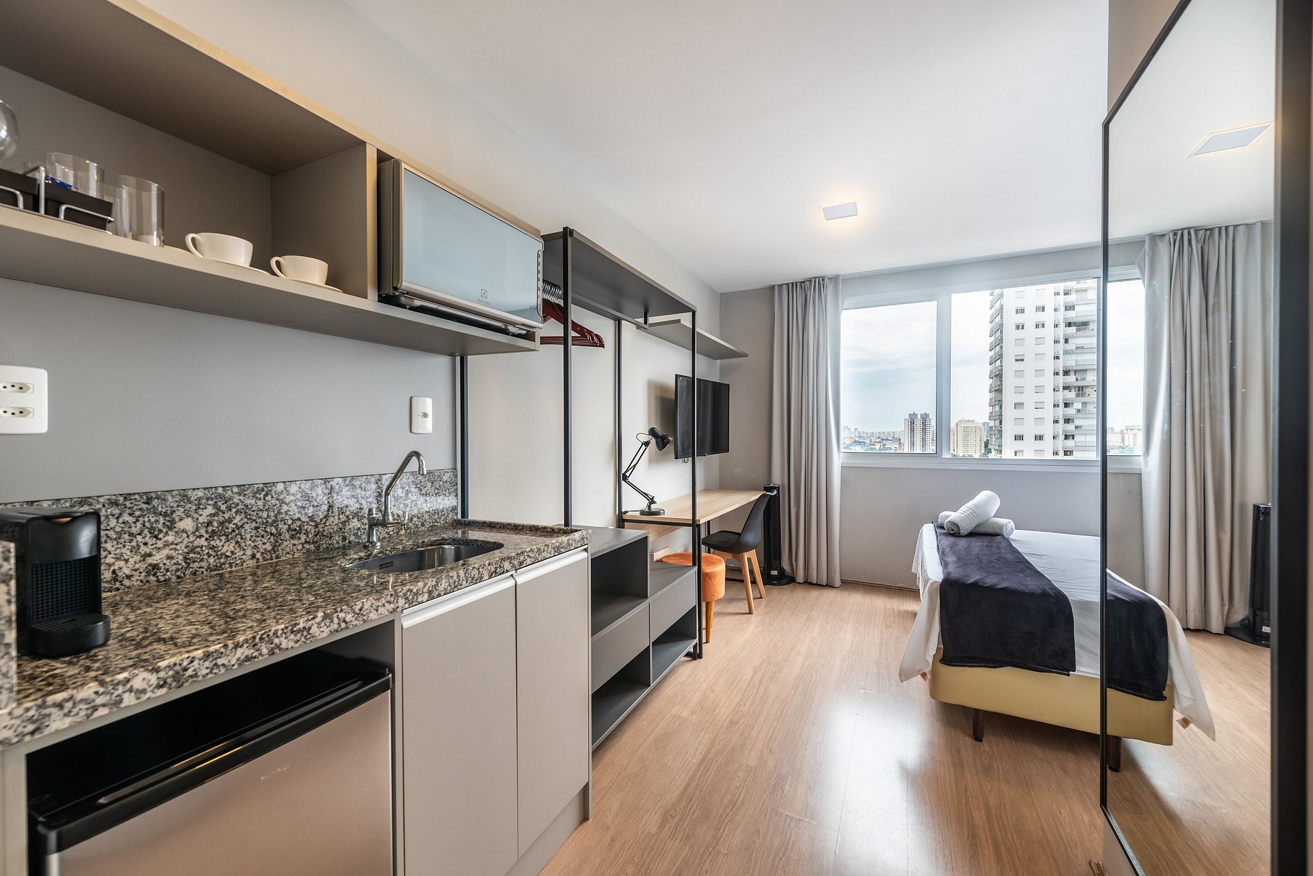 Studio completo e aconchegante, ideal para quem busca conforto e praticidade. O espaço conta com cama confortável, cozinha funcional e banheiro moderno, oferecendo tudo o que você precisa para uma estadia tranquila.