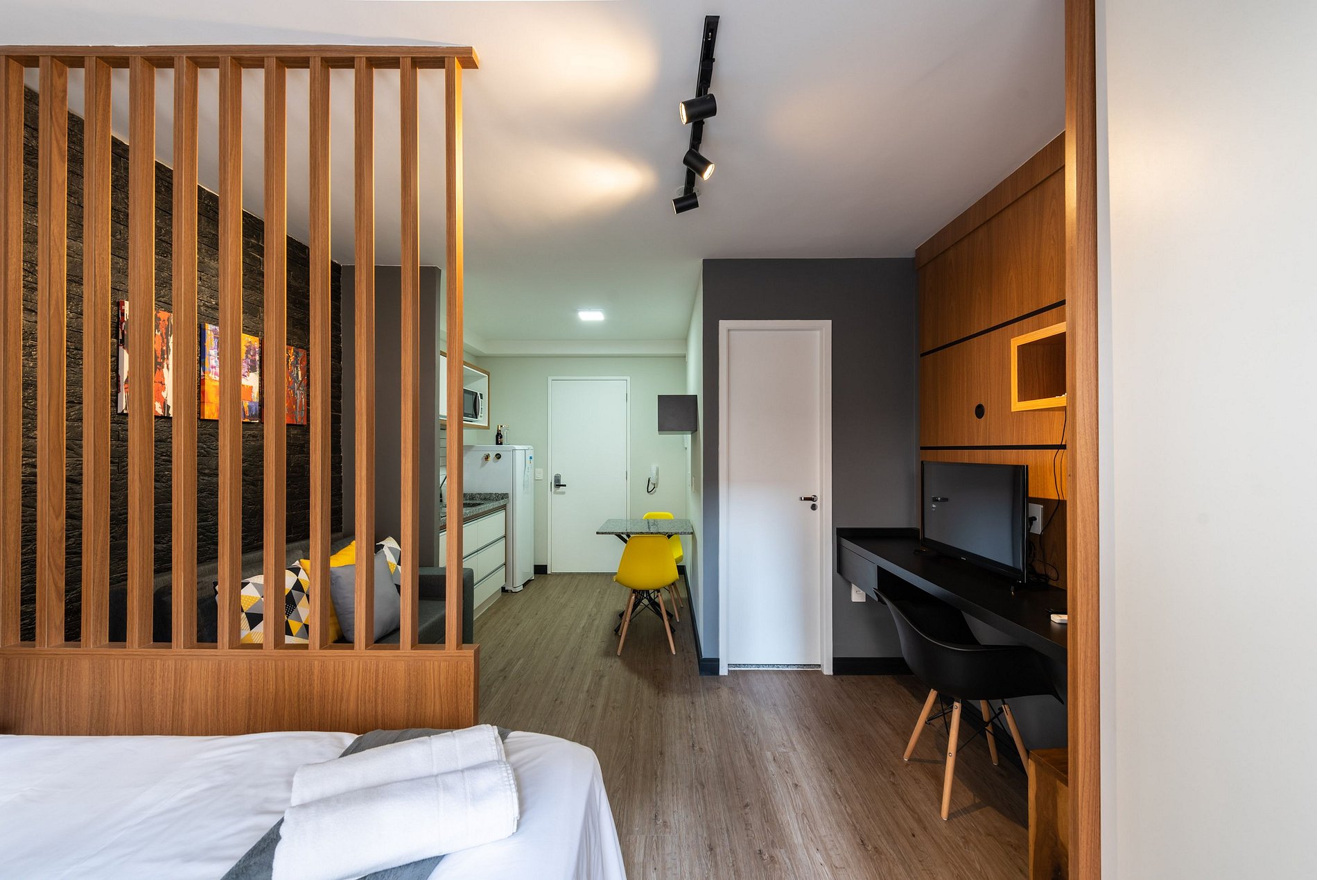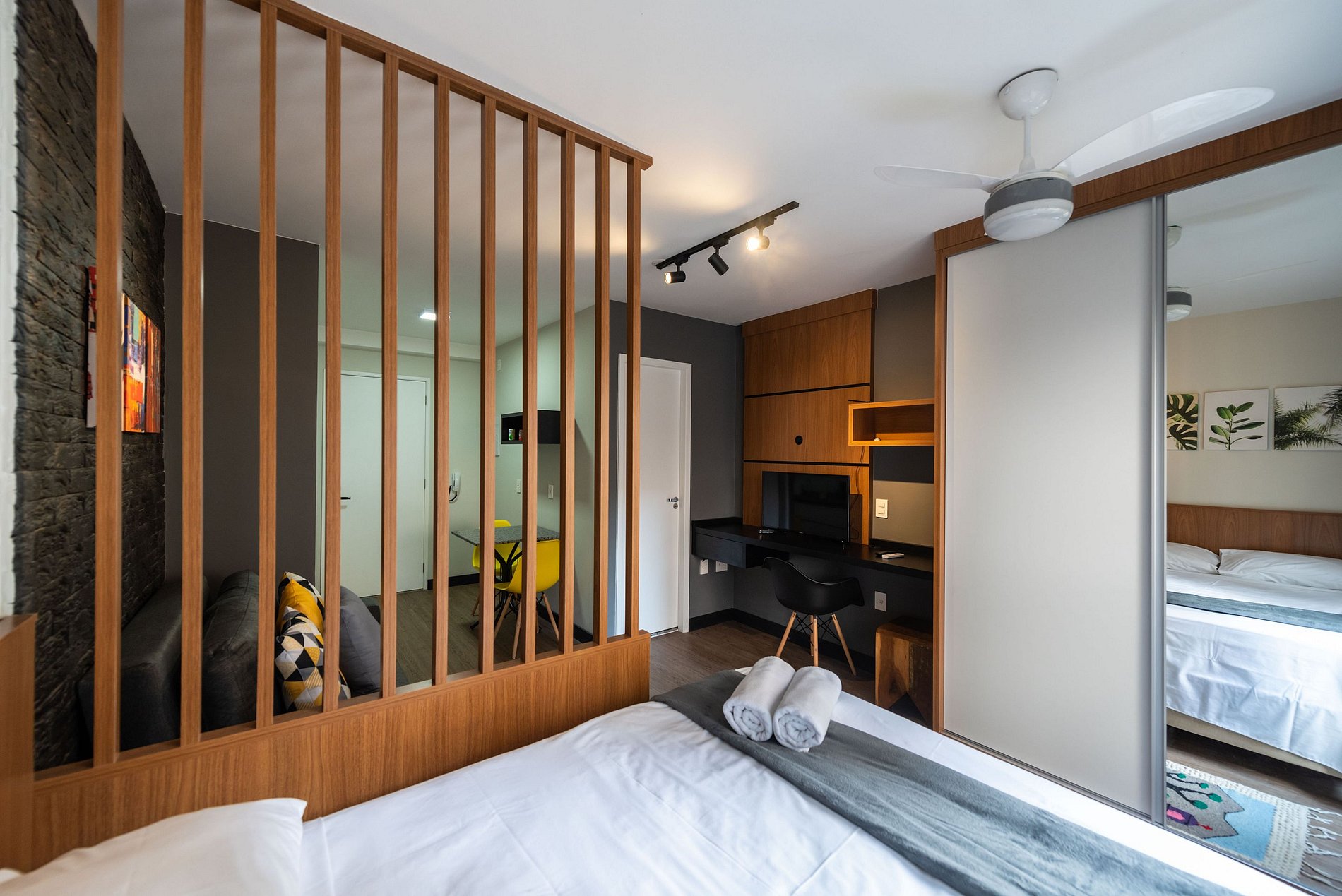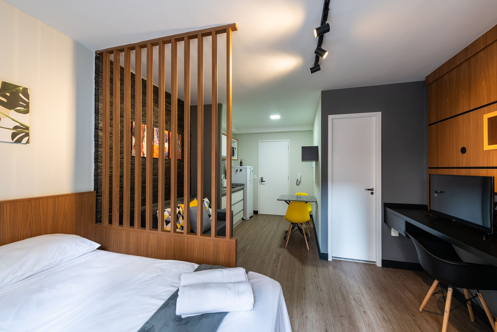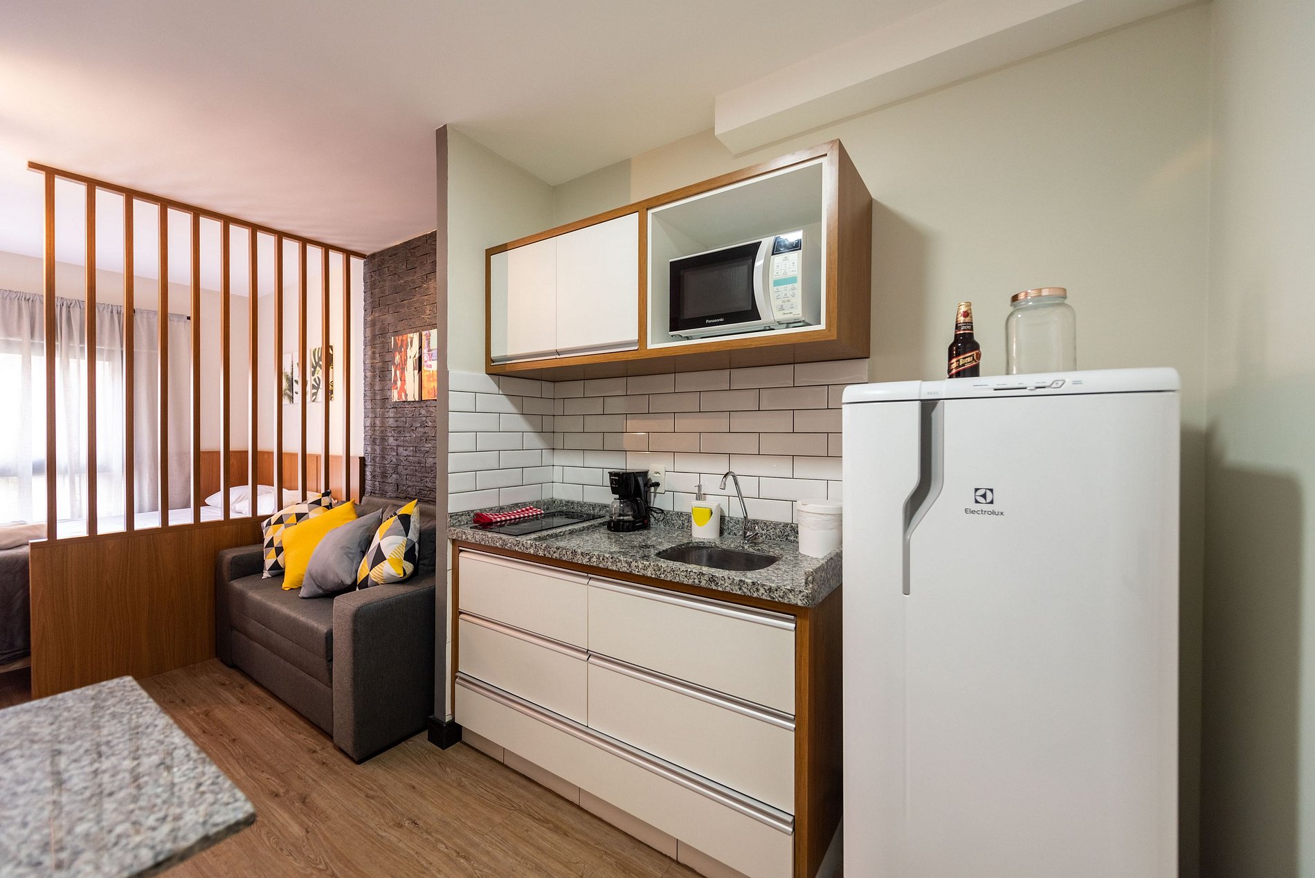 Nosso estúdio funcional acomoda até 4 pessoas. Este espaço inteligente oferece comodidades modernas para uma estadia confortável. Com uma área integrada que inclui uma cozinha completa, área de estar e dormir, este estúdio é perfeito para quem procura praticidade e conforto durante sua estadia na cidade.