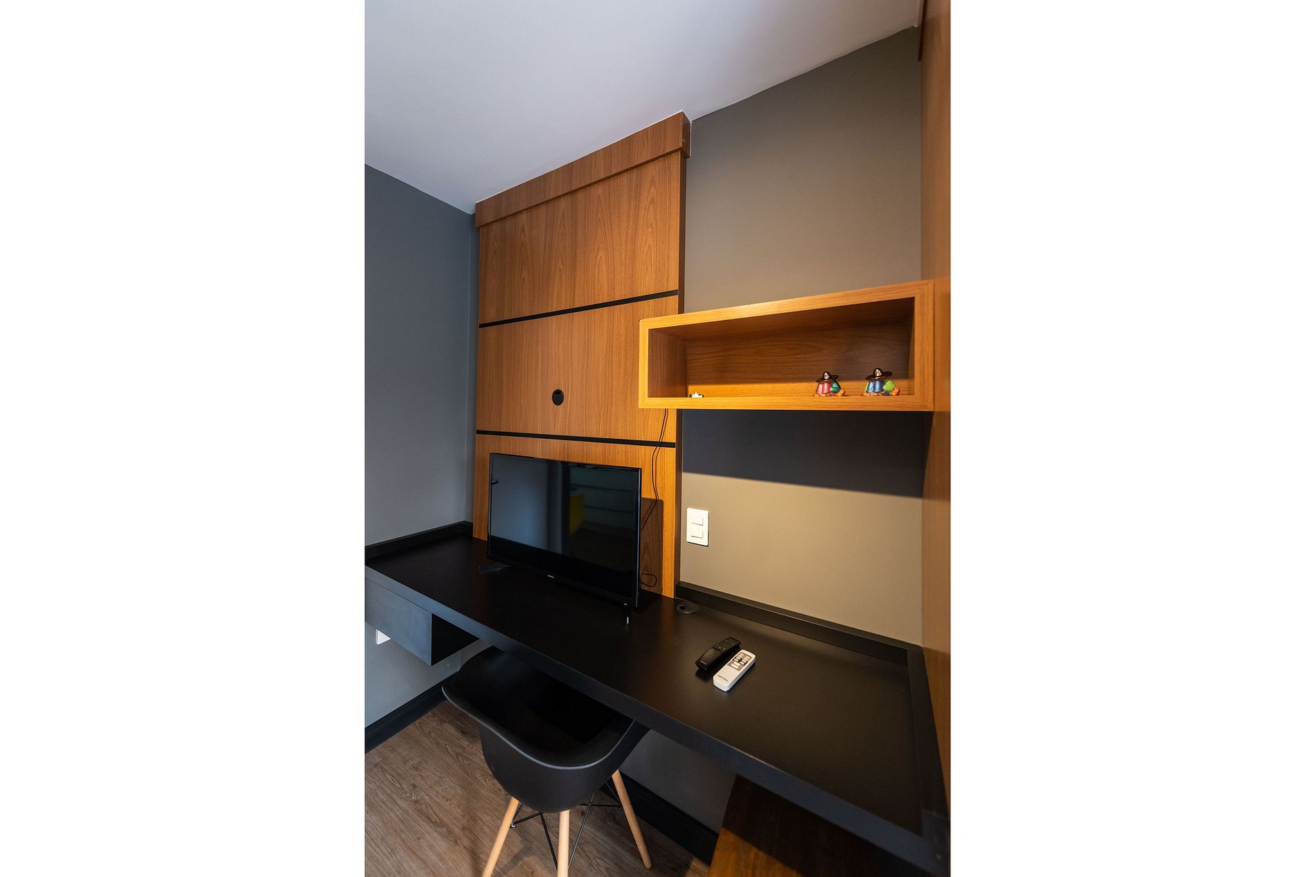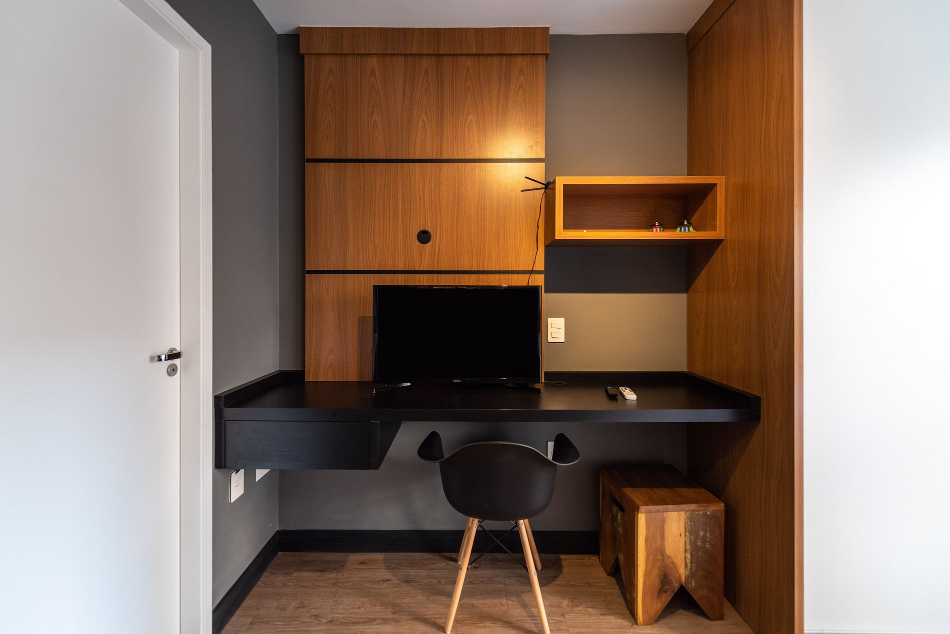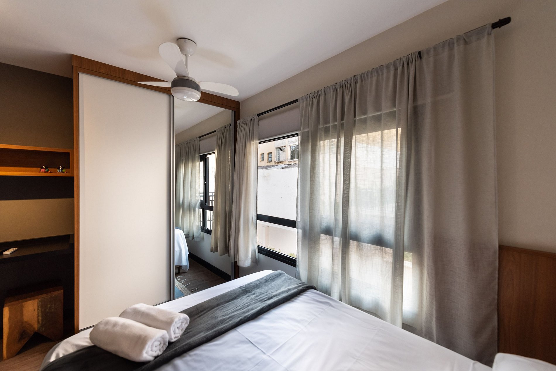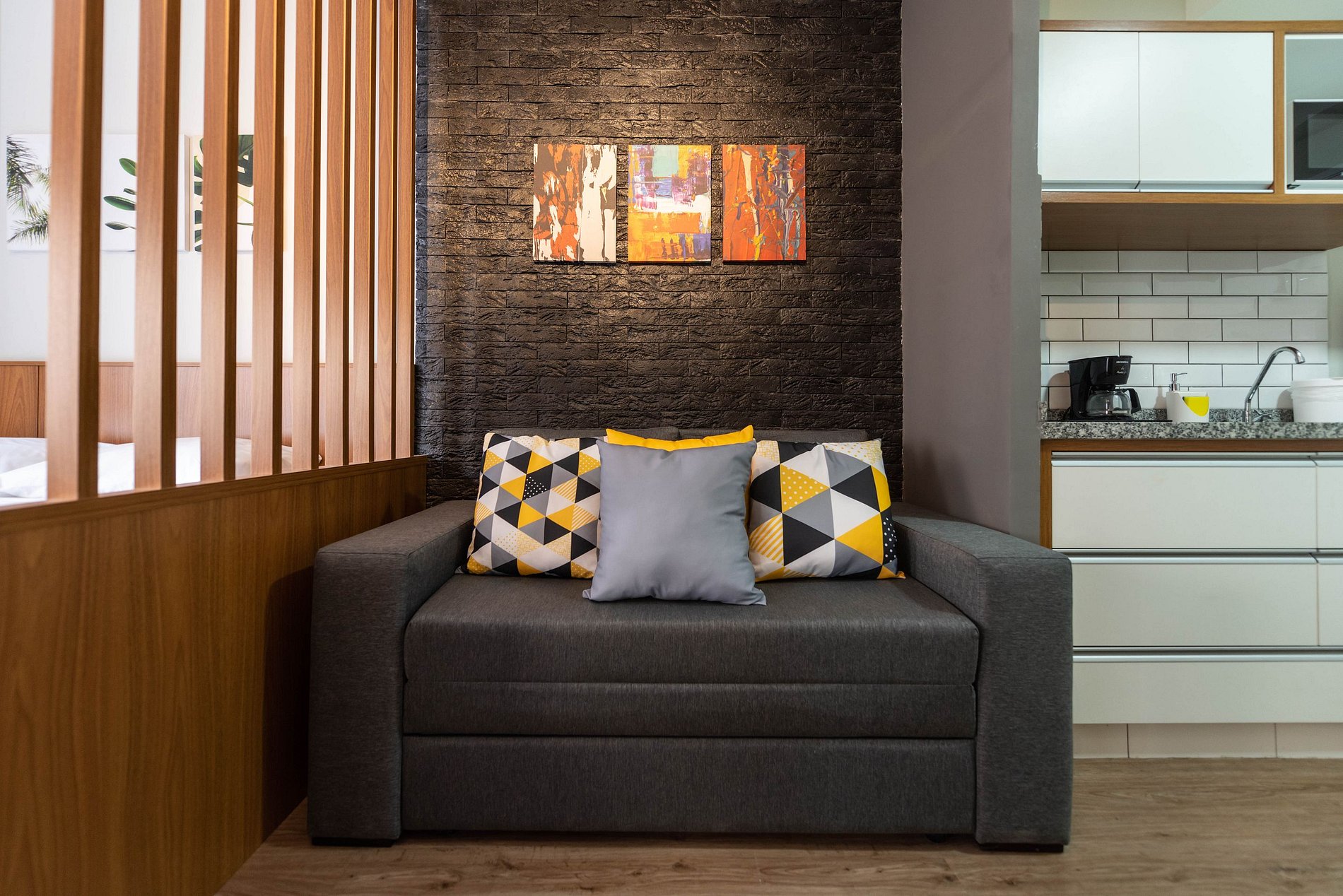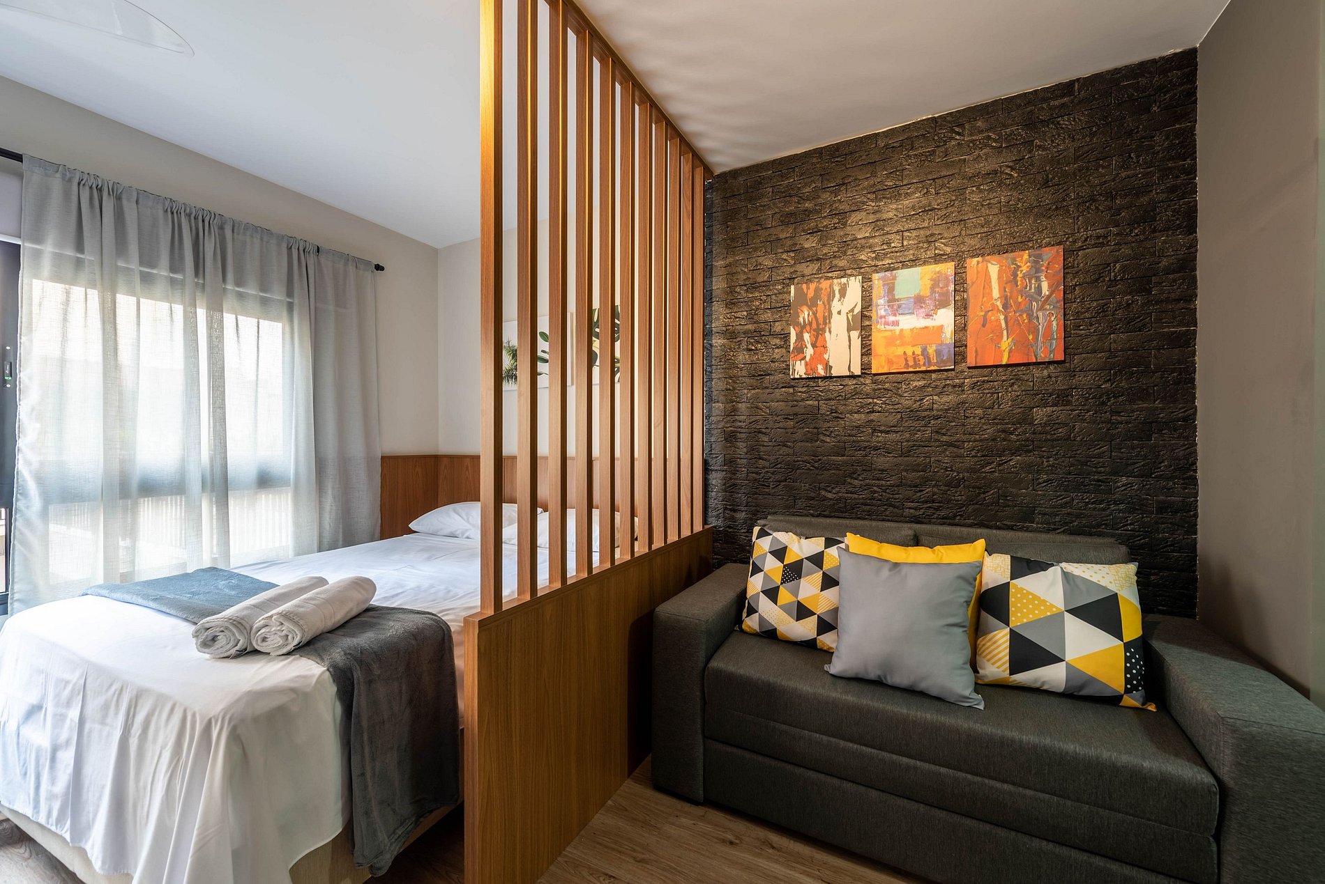 Nosso estúdio funcional acomoda até 4 pessoas. Este espaço inteligente oferece comodidades modernas para uma estadia confortável. Com uma área integrada que inclui uma cozinha completa, área de estar e dormir, este estúdio é perfeito para quem procura praticidade e conforto durante sua estadia na cidade.