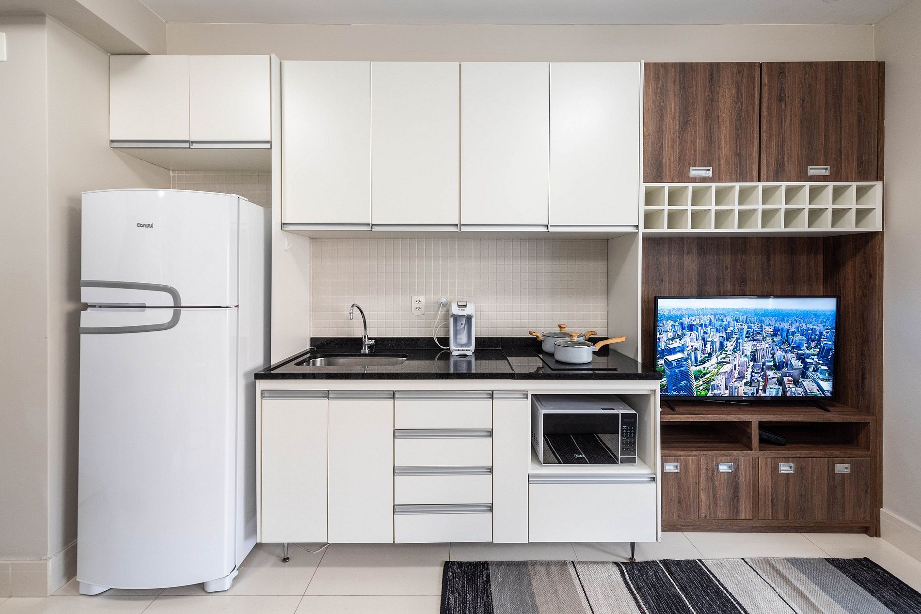 ・Cozinha completa: equipada com geladeira, fogão, micro-ondas, filtro de agua, etc.