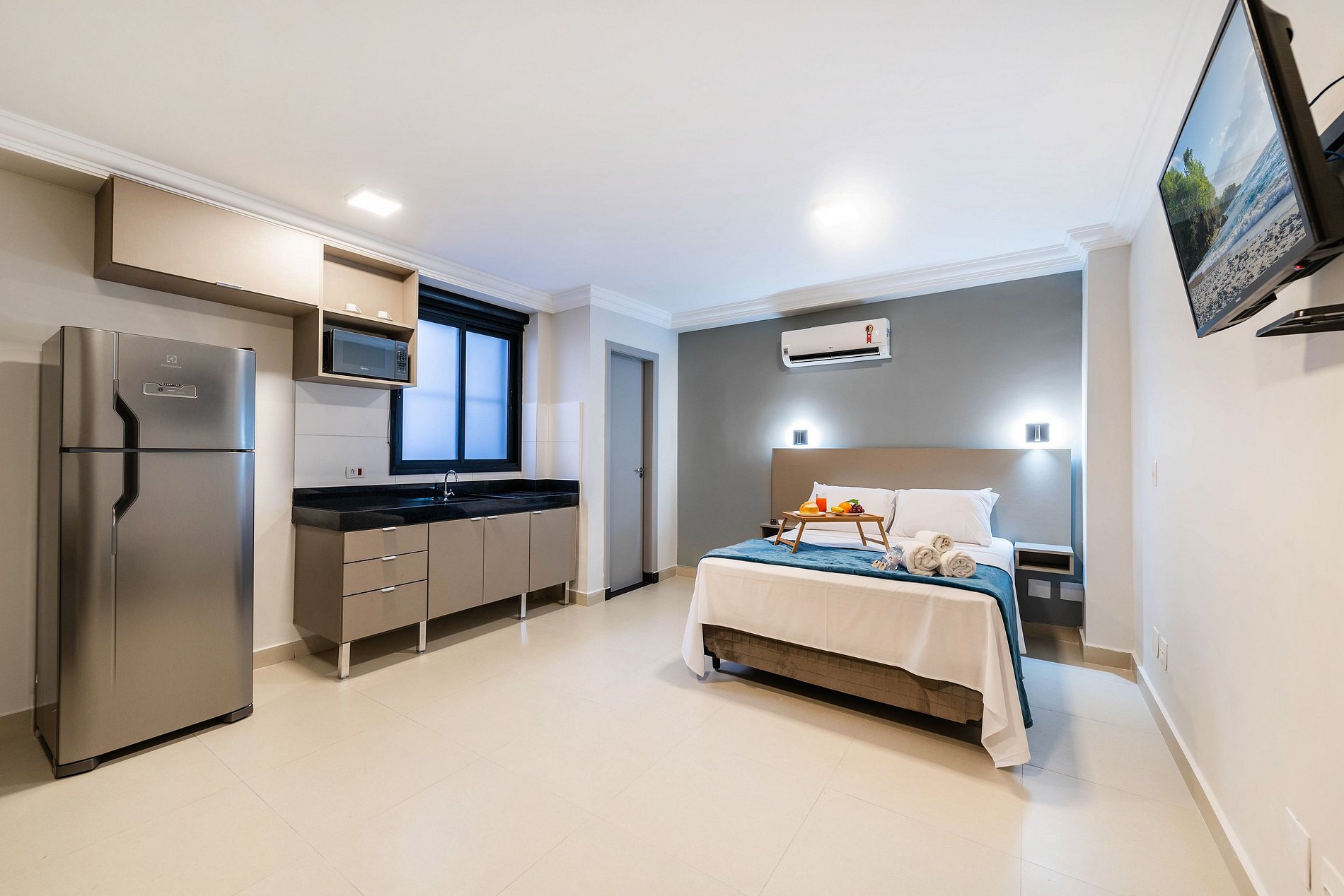 ・Cozinha completa: equipada com geladeira, fogão de indução, micro-ondas etc.