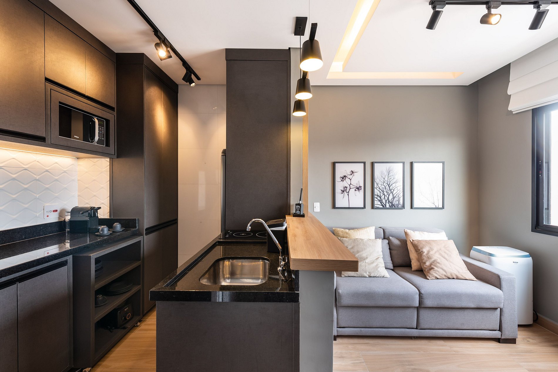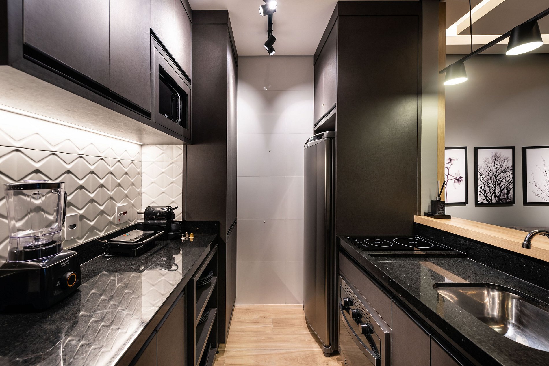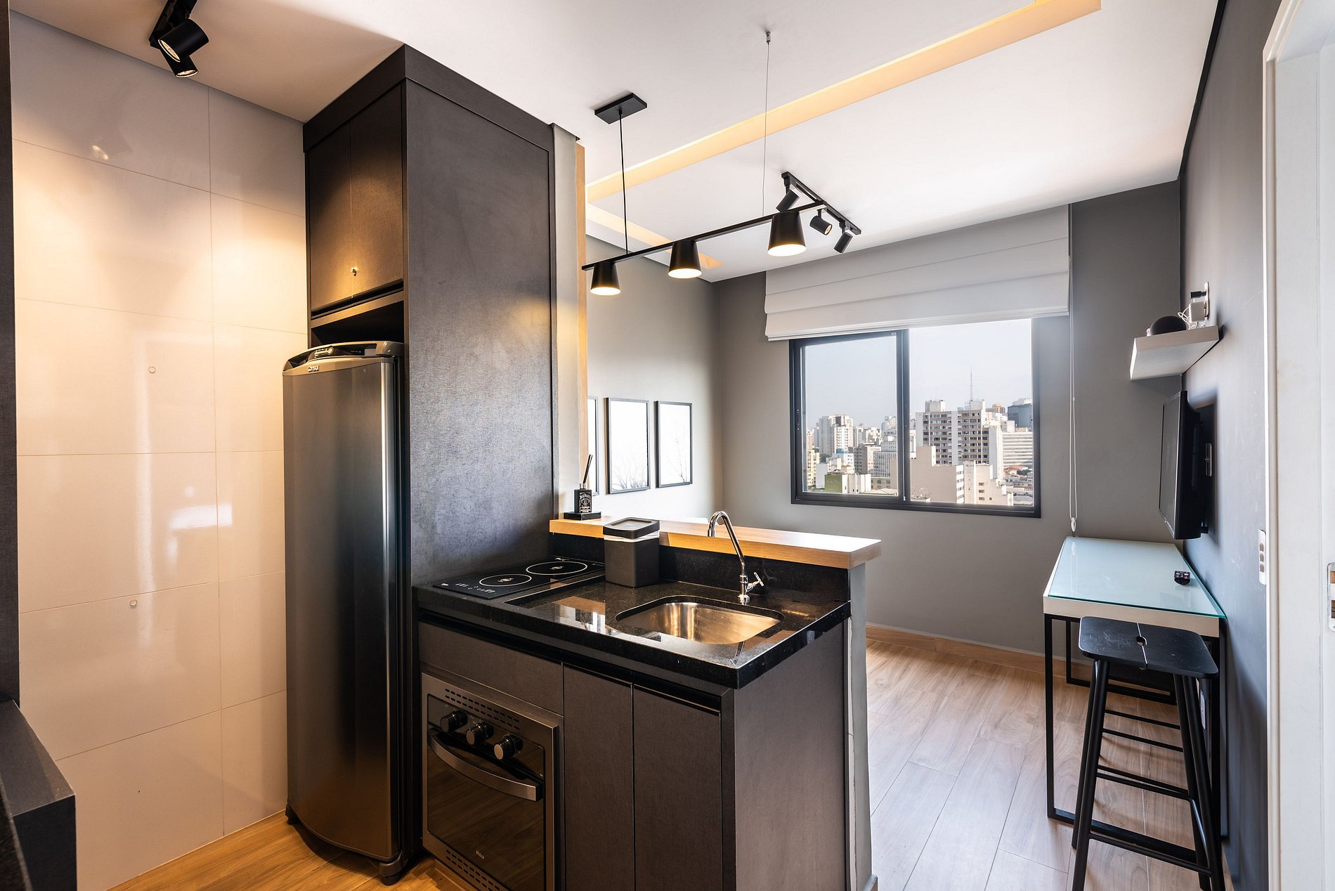 ・Cozinha completa: equipada com geladeira, fogão de indução, forno elétrico, micro-ondas etc.