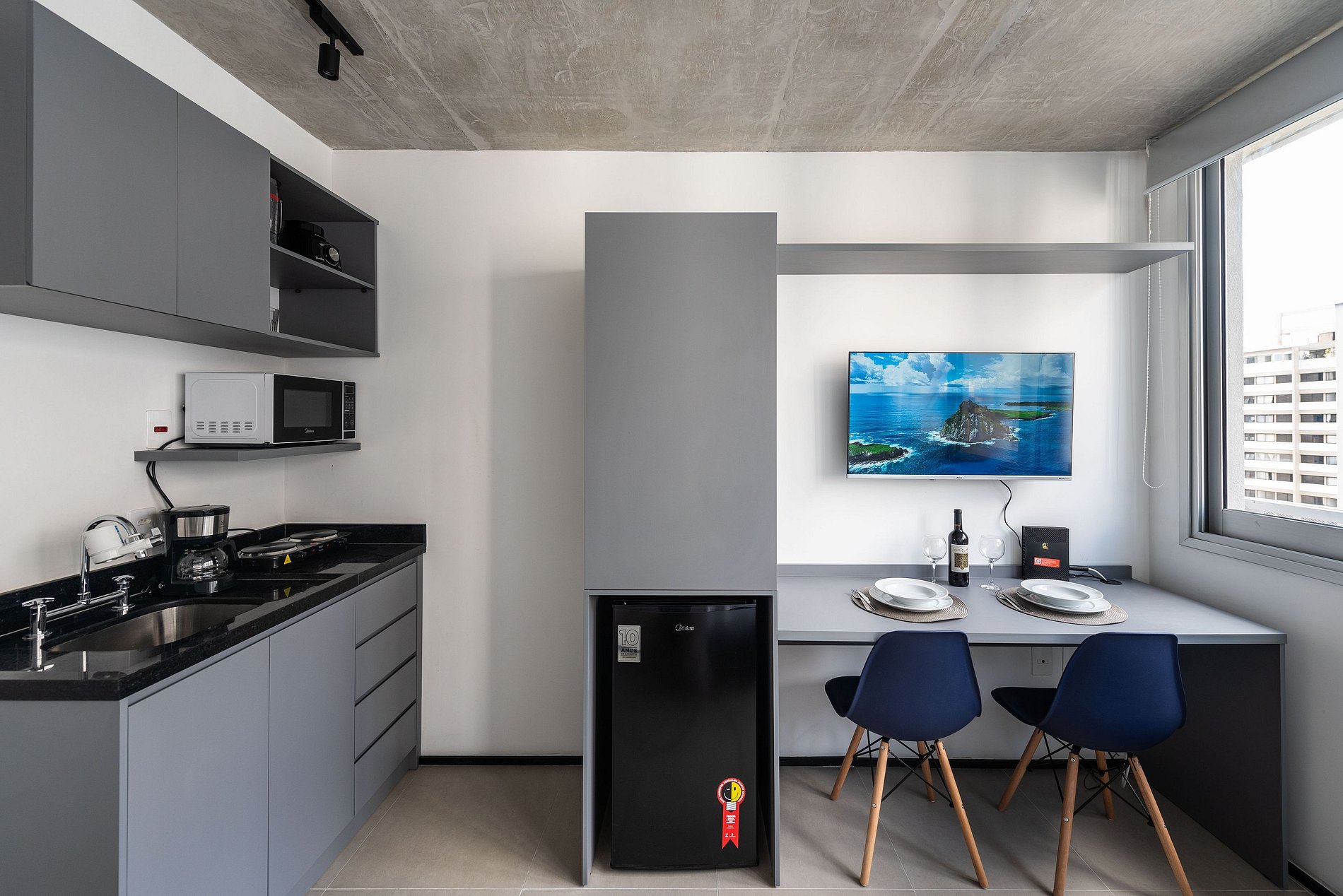 ATENÇÃO: O estúdio está equipado com ar-condicionado, que está operando normalmente no momento. Entretanto, é importante observar que devido a questões estruturais recorrentes no condomínio, pode haver interrupções em seu funcionamento. Essas ocorrências são comuns no prédio, e, infelizmente, quando ocorrem, não temos controle sobre a resolução imediata do problema.