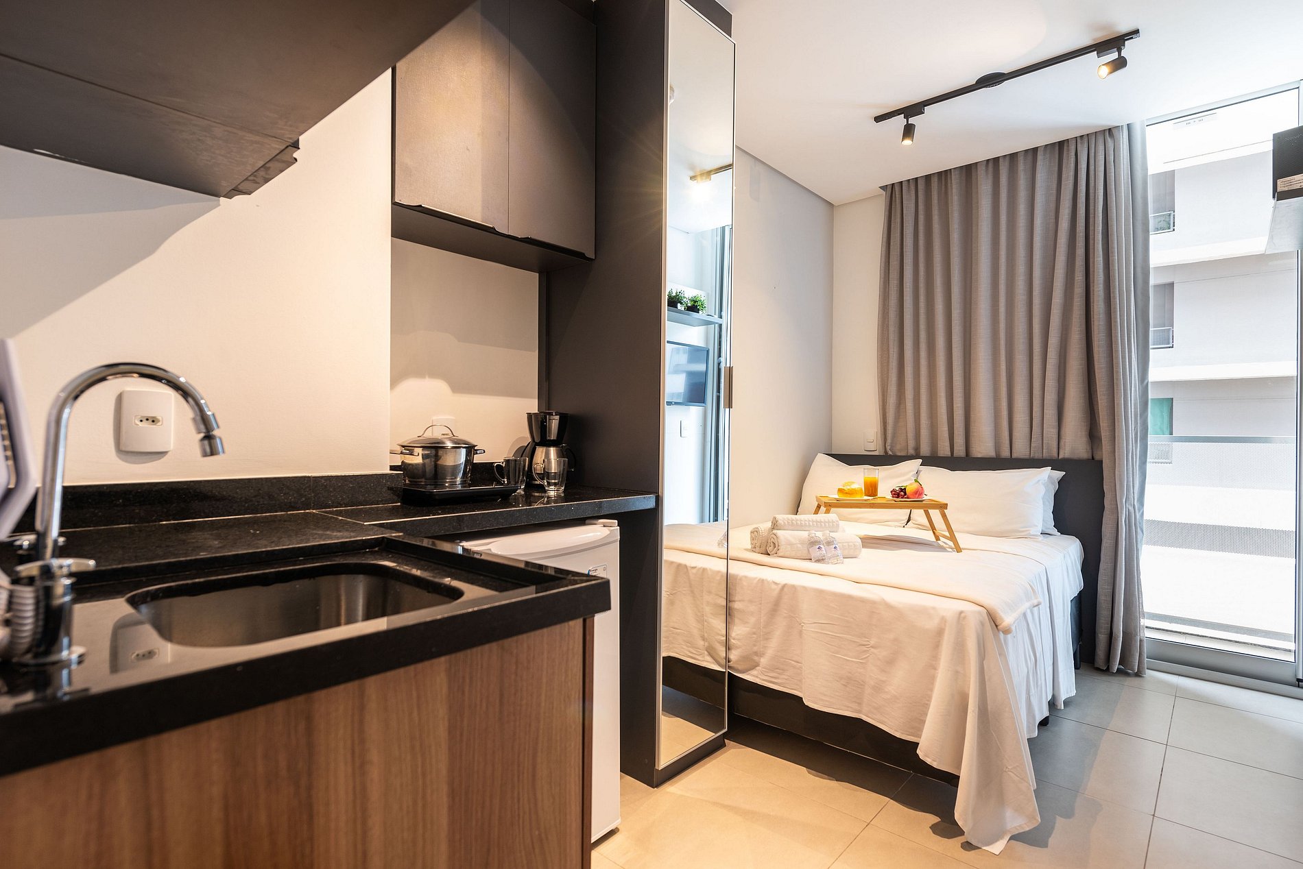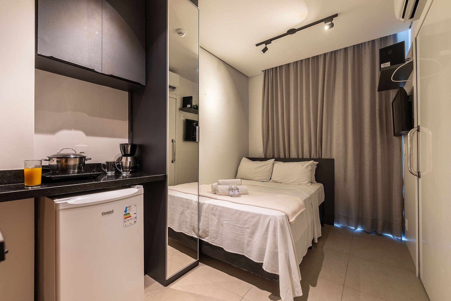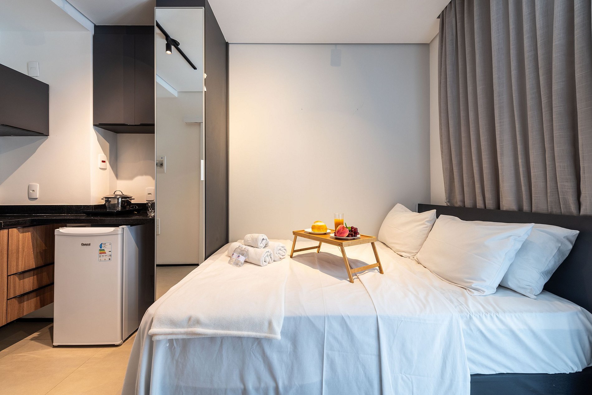 ・Cozinha completa: equipada com frigobar, fogão de indução (uma boca), micro-ondas etc.