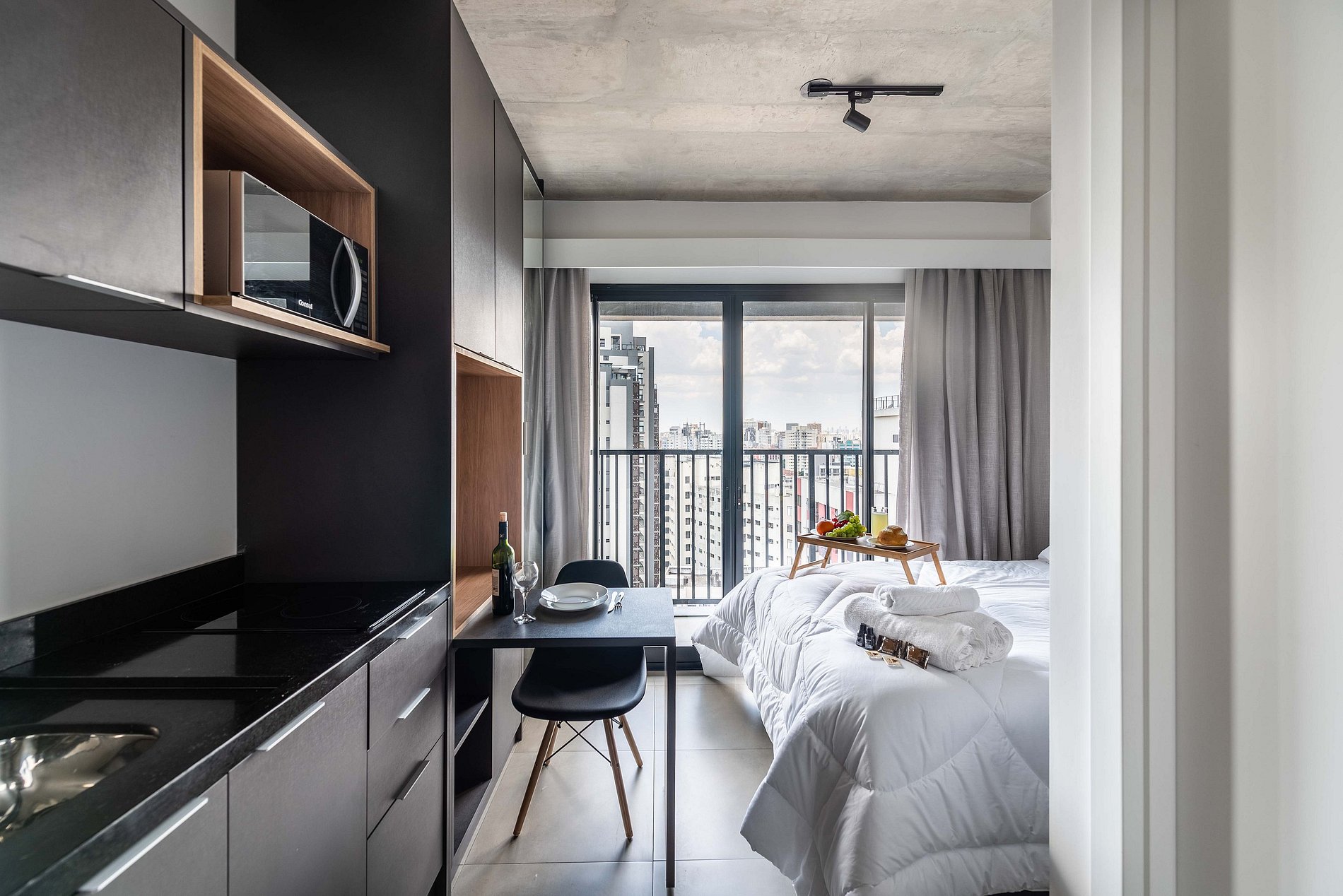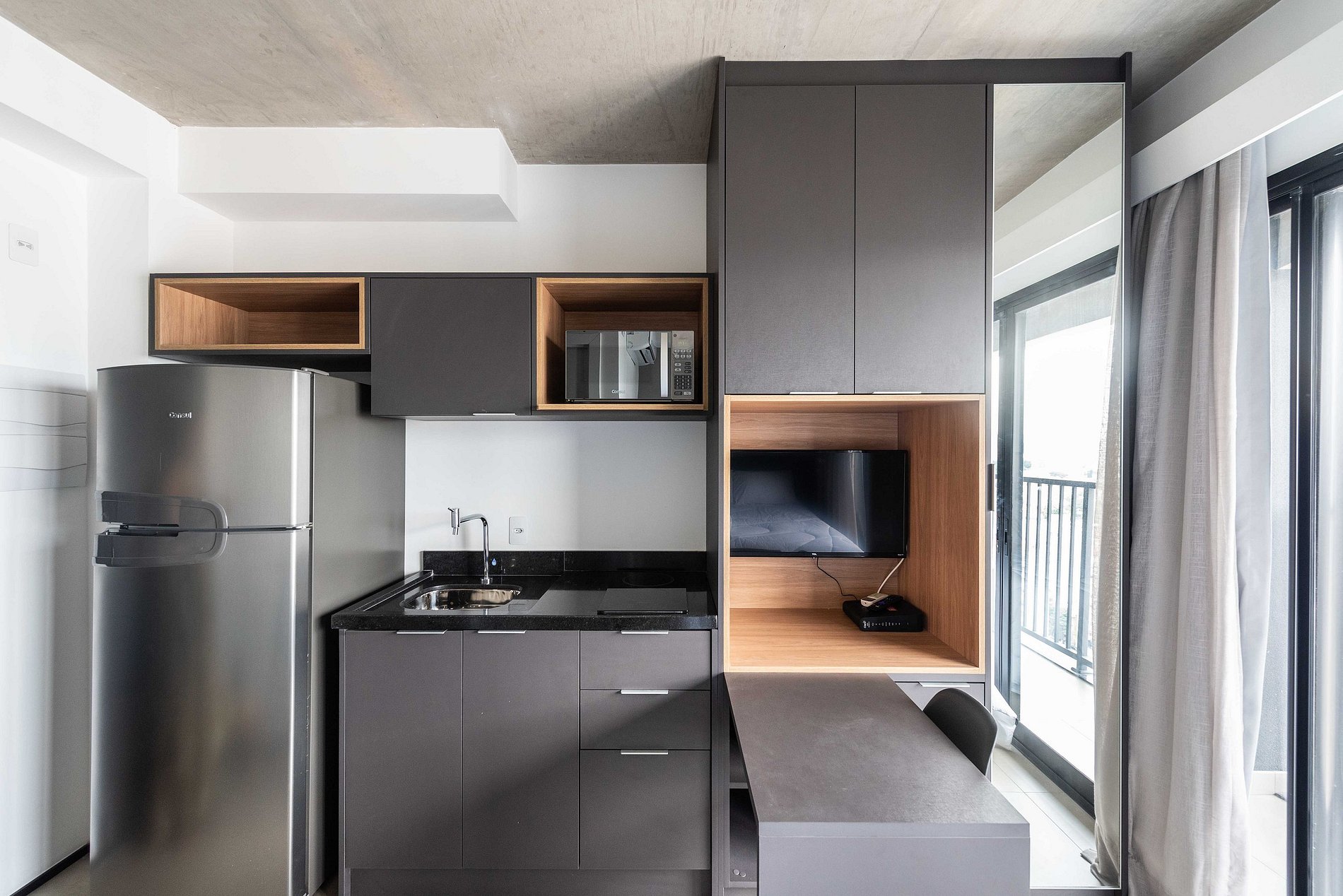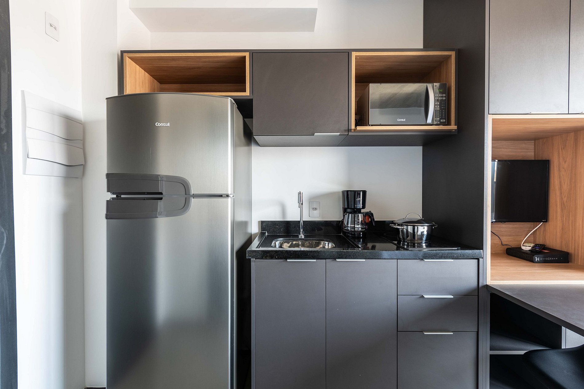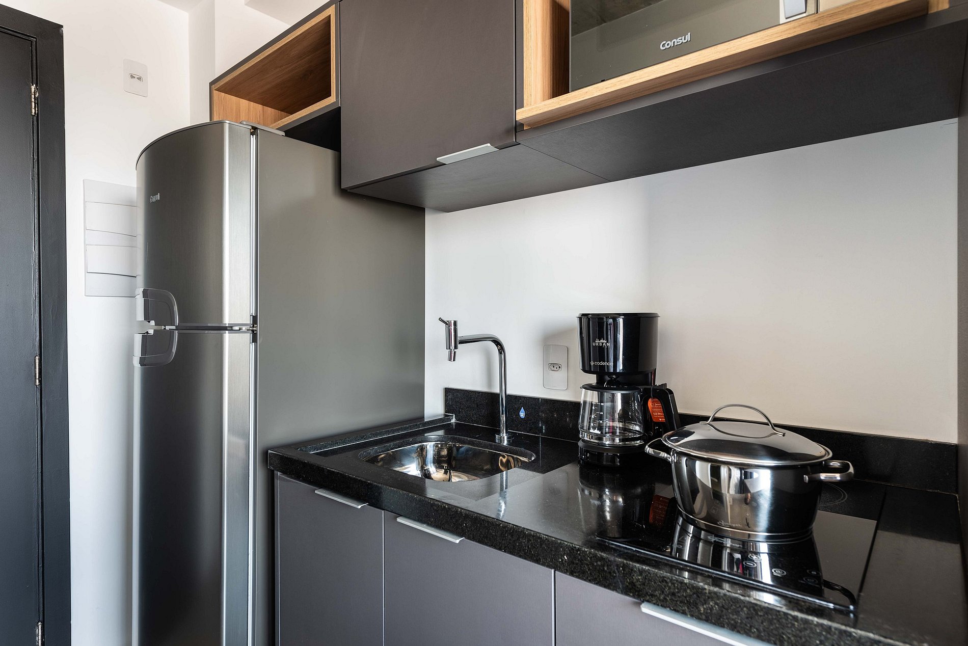 ・Cozinha completa: equipada com geladeira, fogão de indução, micro-ondas etc.