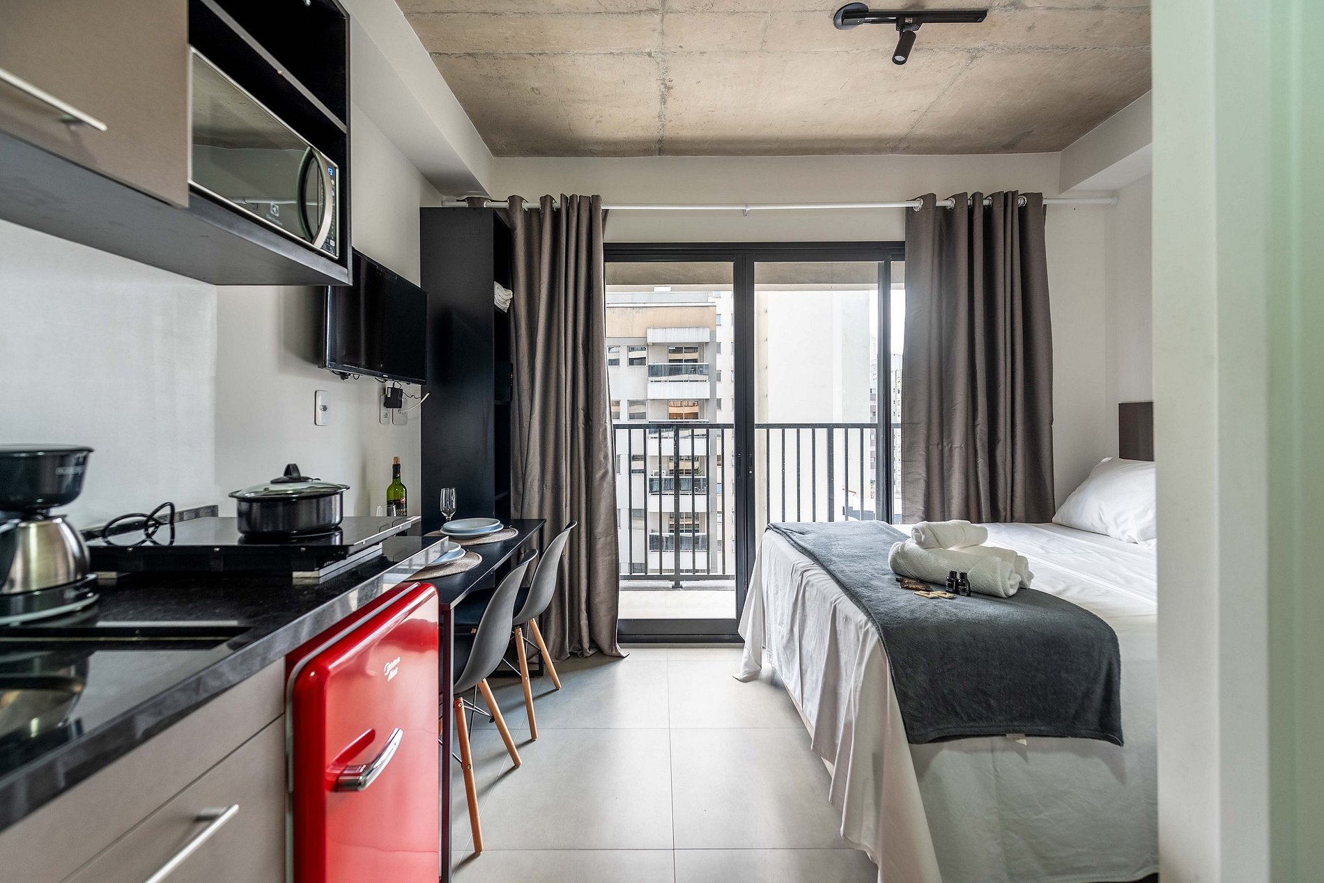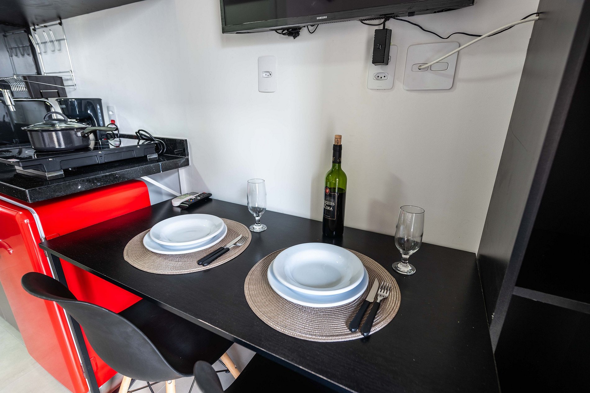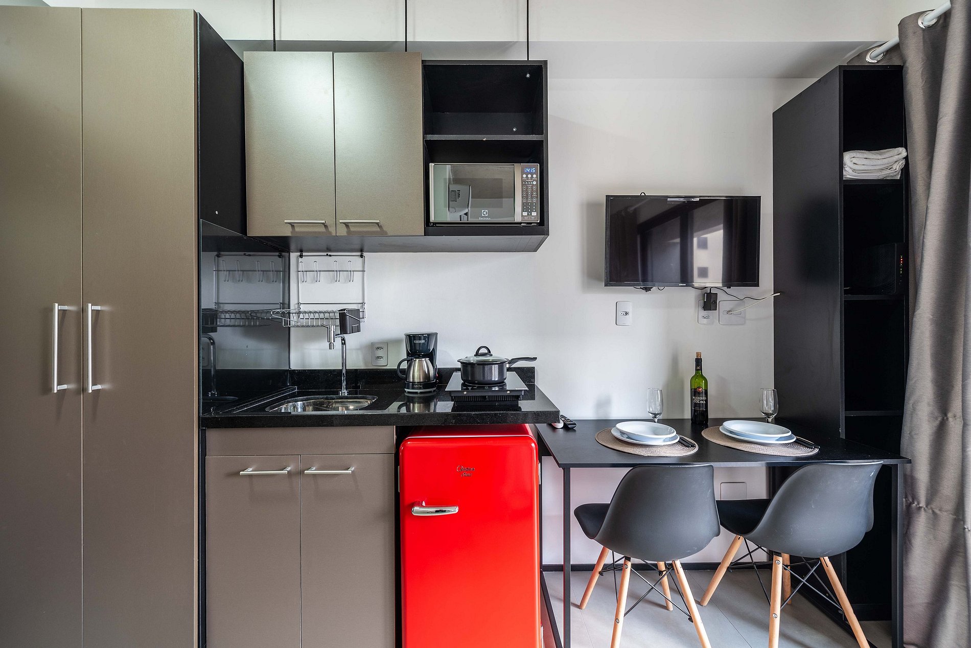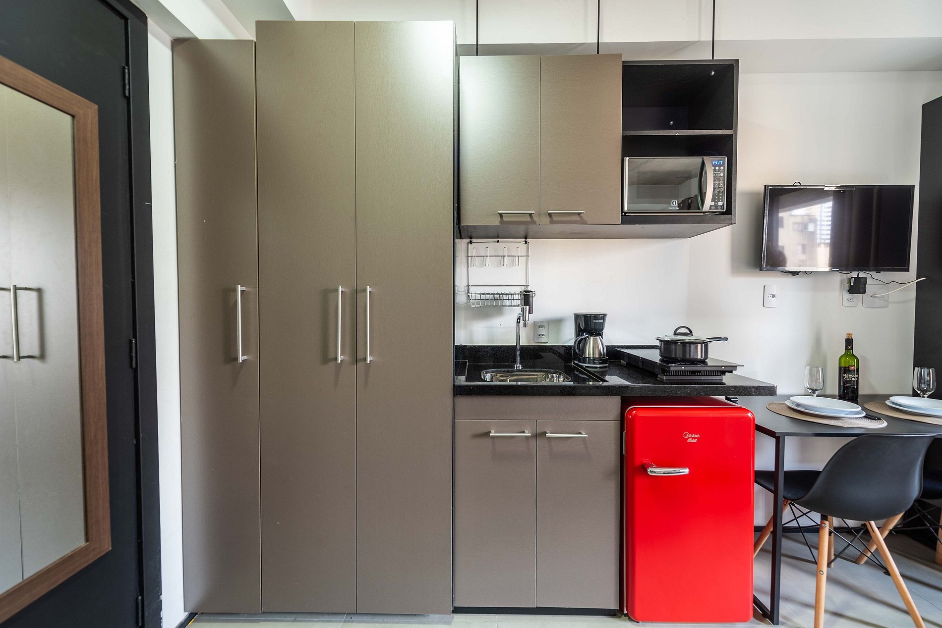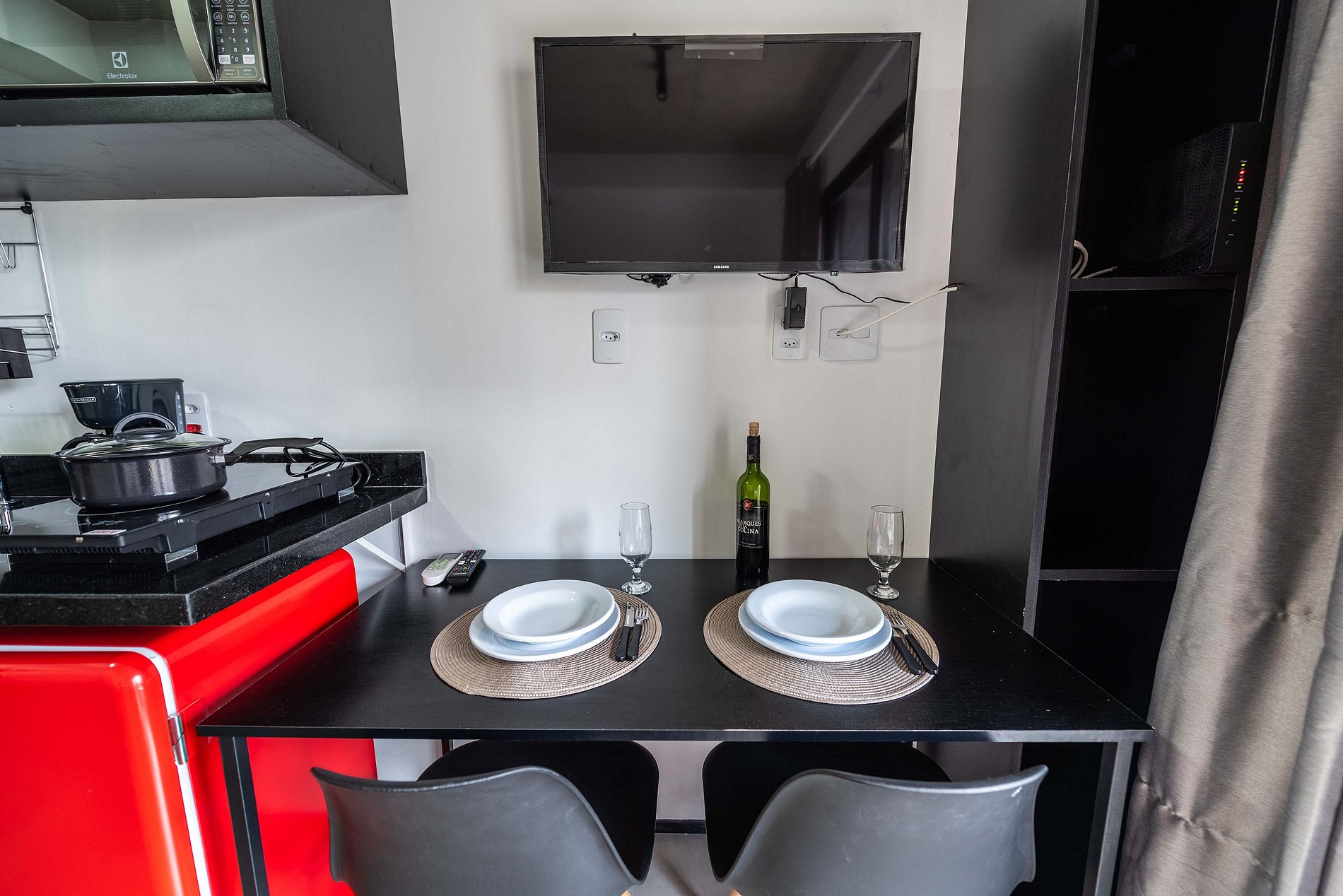 ・Cozinha completa: equipada com frigobar, fogão de indução, micro-ondas etc.