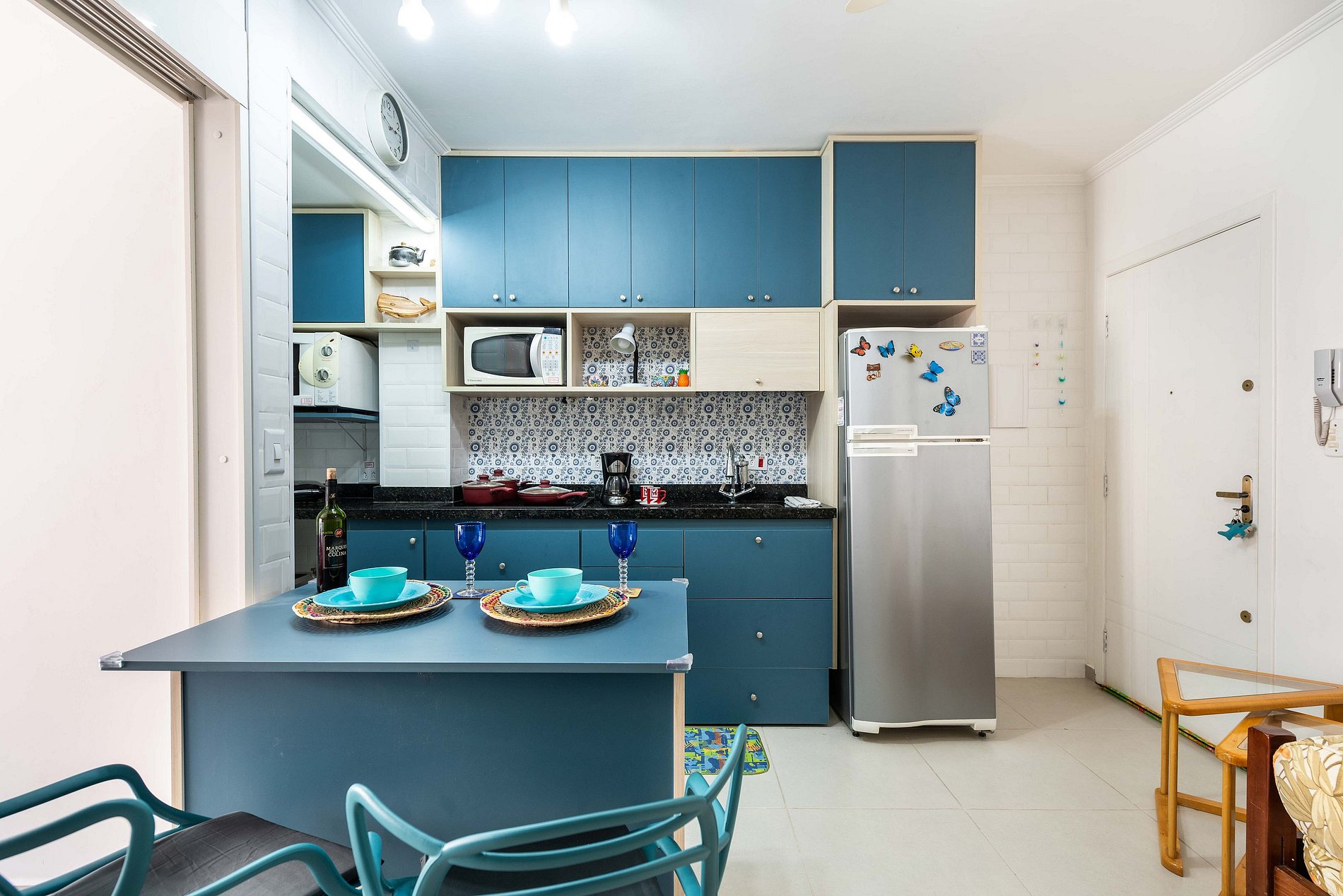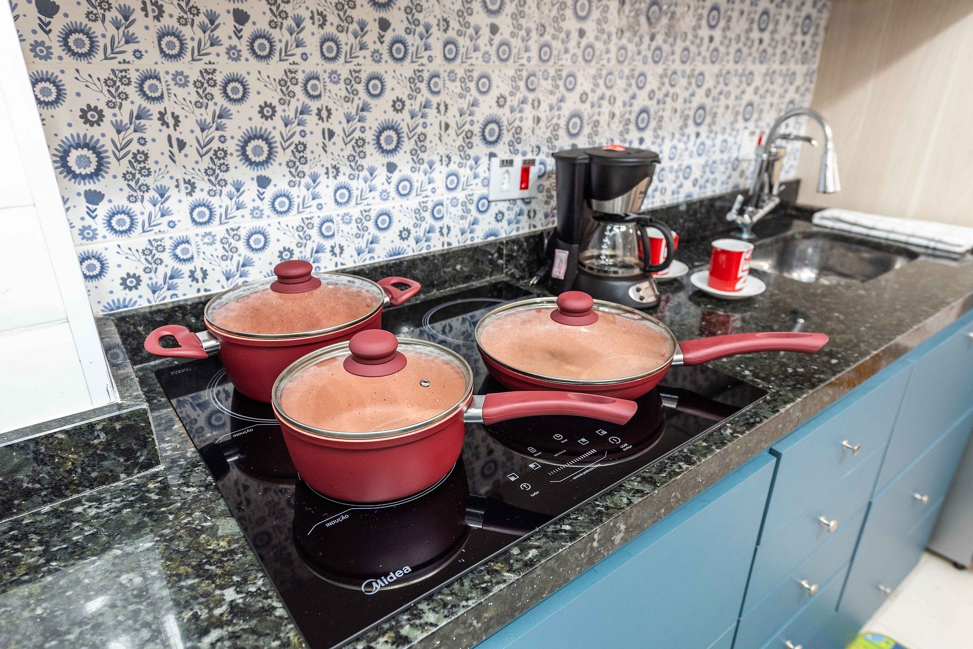 ・Cozinha completa: equipada com frigobar, fogão de indução, micro-ondas etc.