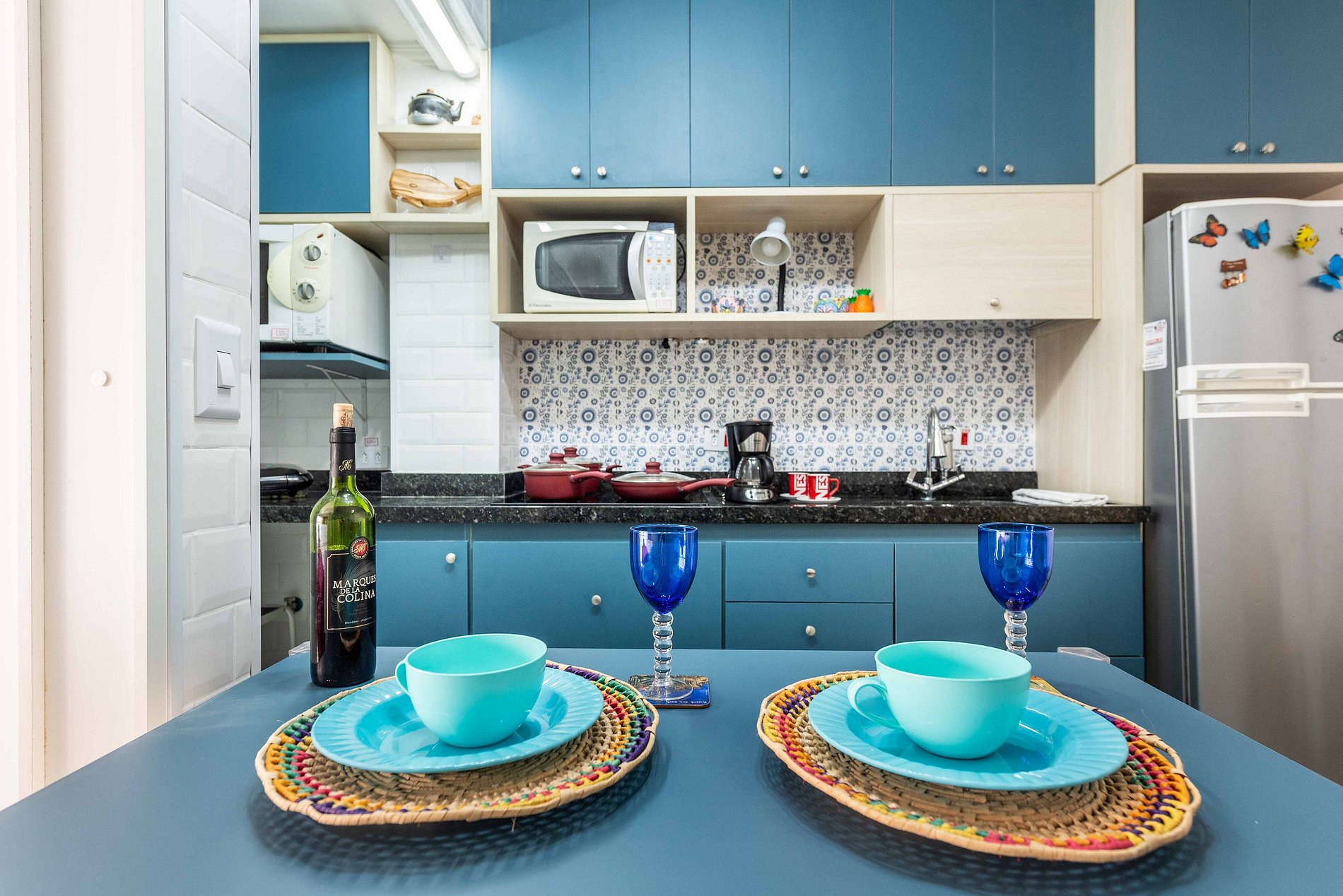 ・Cozinha completa: equipada com frigobar, fogão de indução, micro-ondas etc.