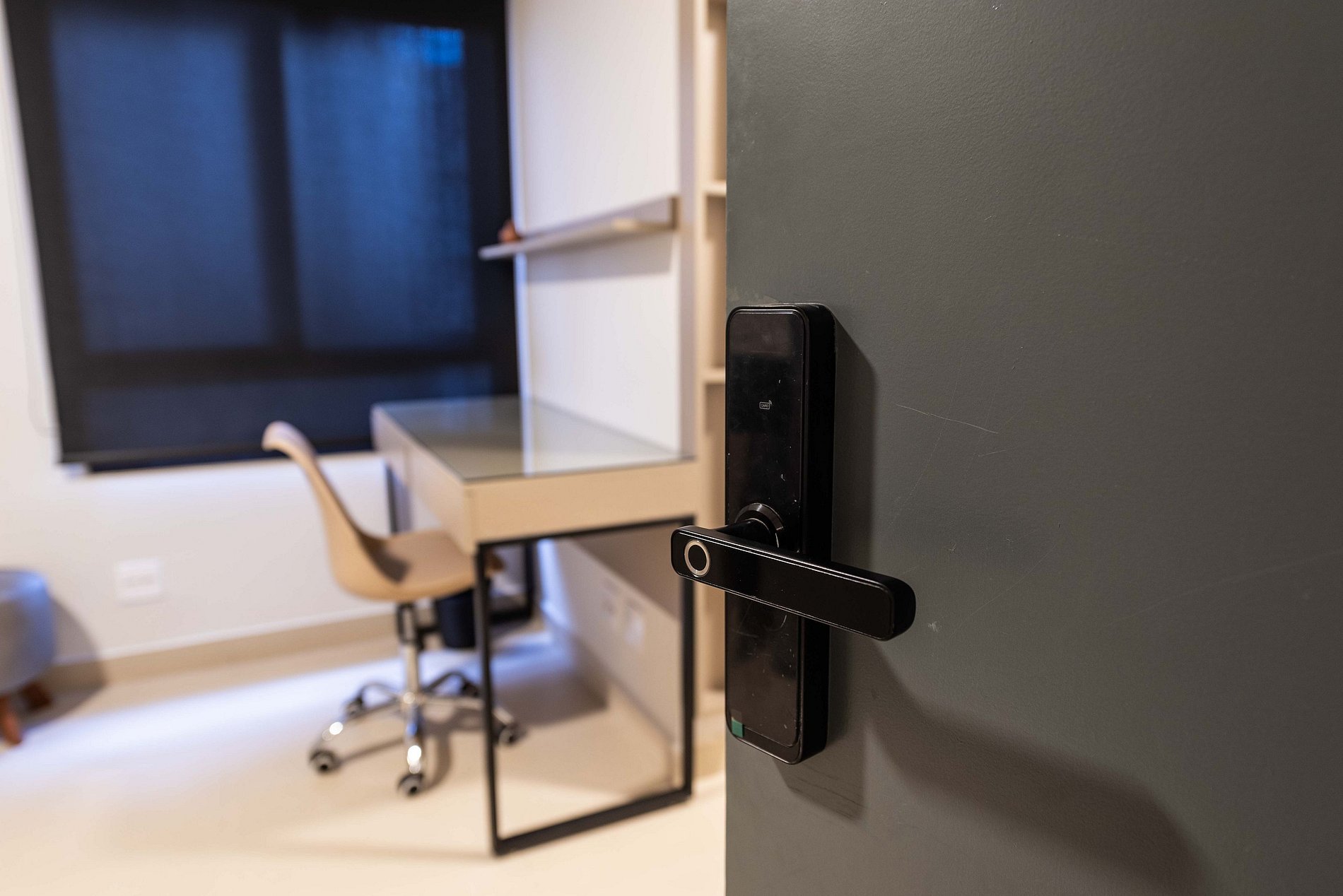 A entrada é realizada através de uma fechadura eletrônica, garantindo acesso total tanto ao apartamento quanto às comodidades do prédio.