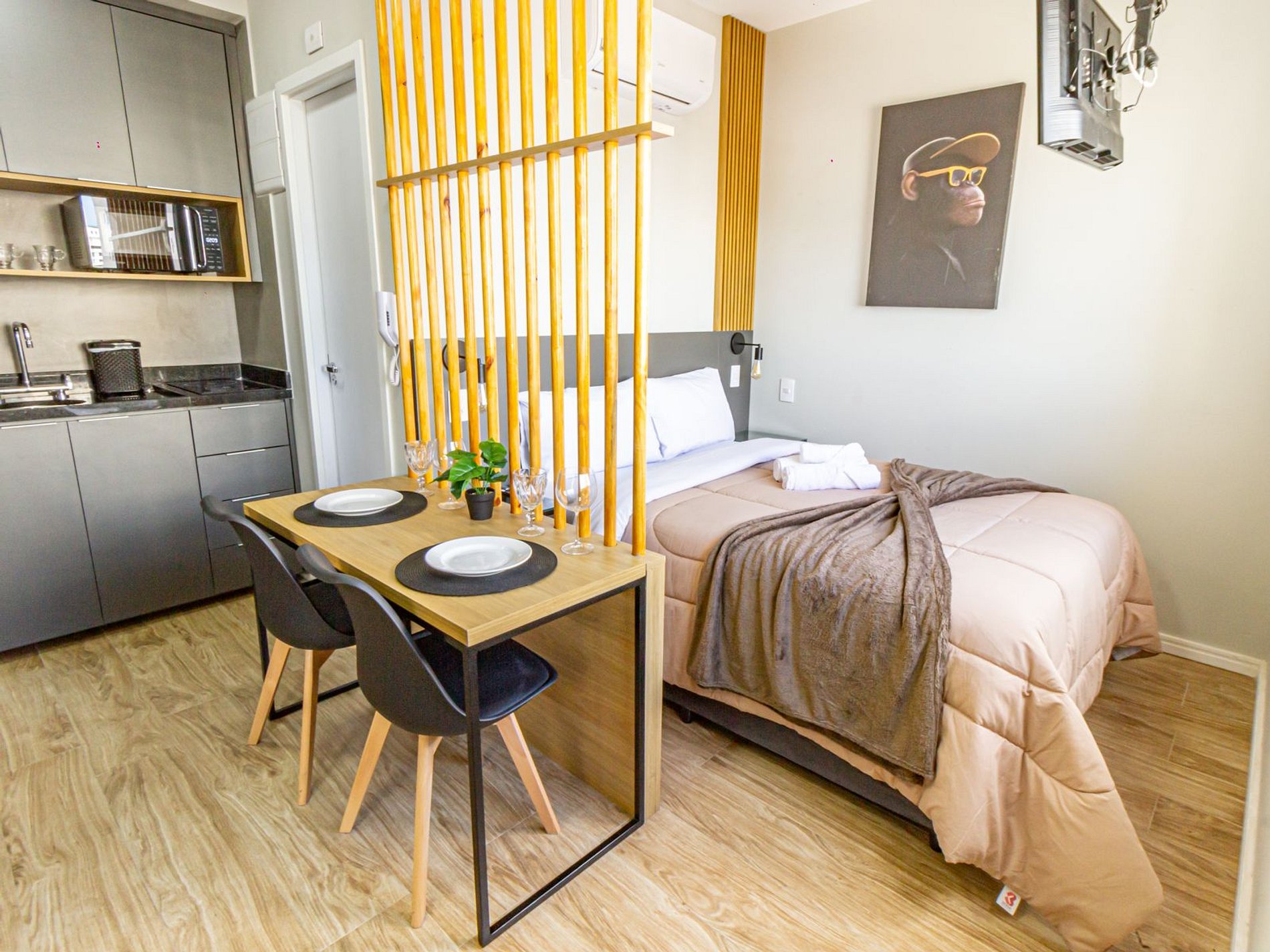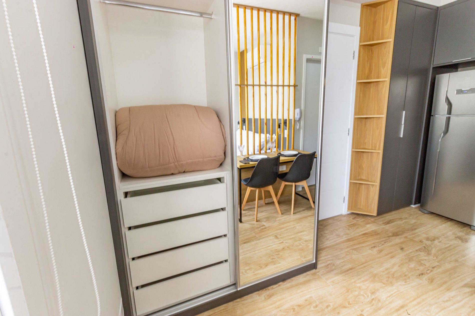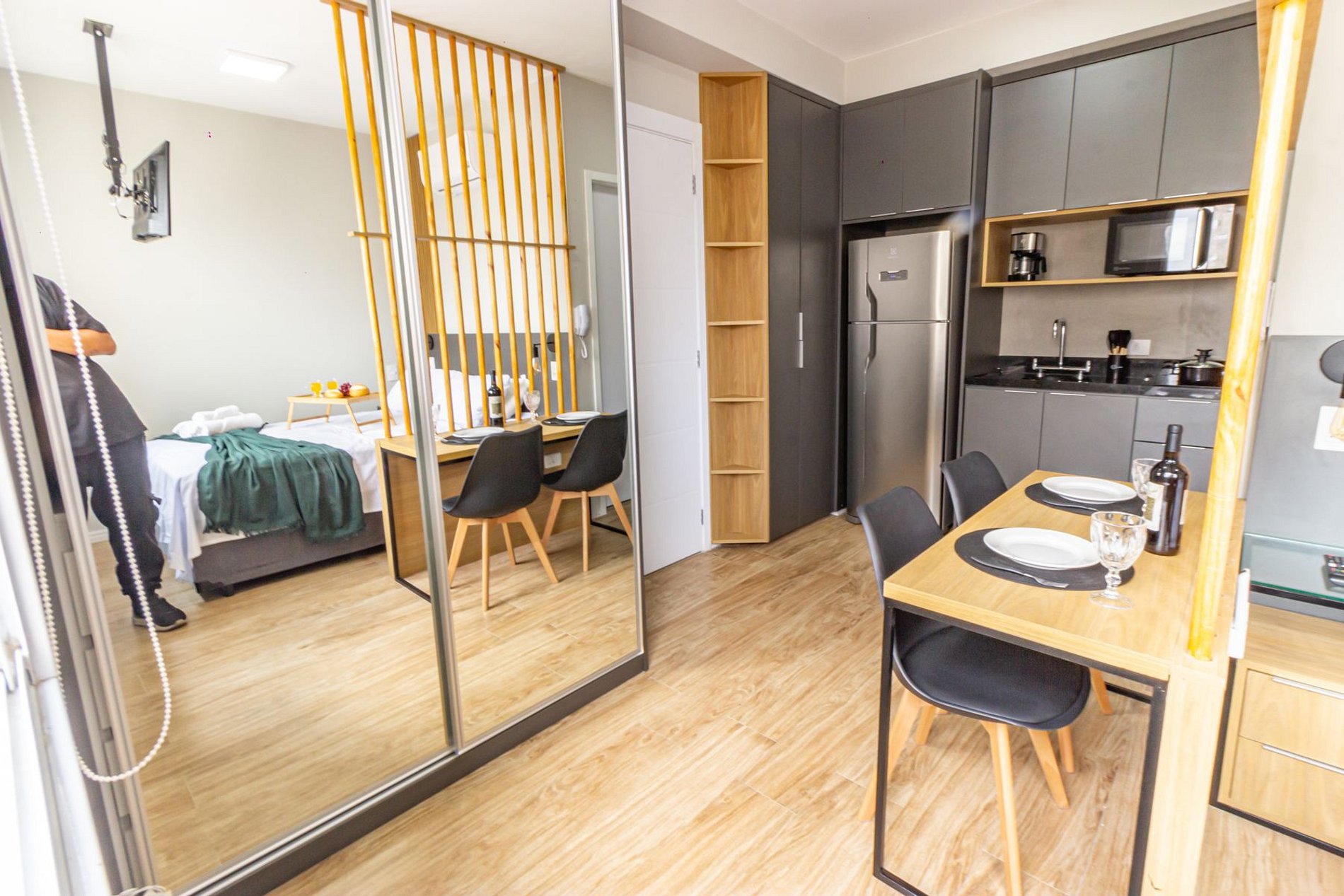 Studio compacto e aconchegante, ideal para duas pessoas. Conta com uma cama confortável, cozinha equipada com utensílios básicos e um banheiro privativo. Ambiente funcional e bem distribuído, perfeito para uma estadia prática e confortável.
