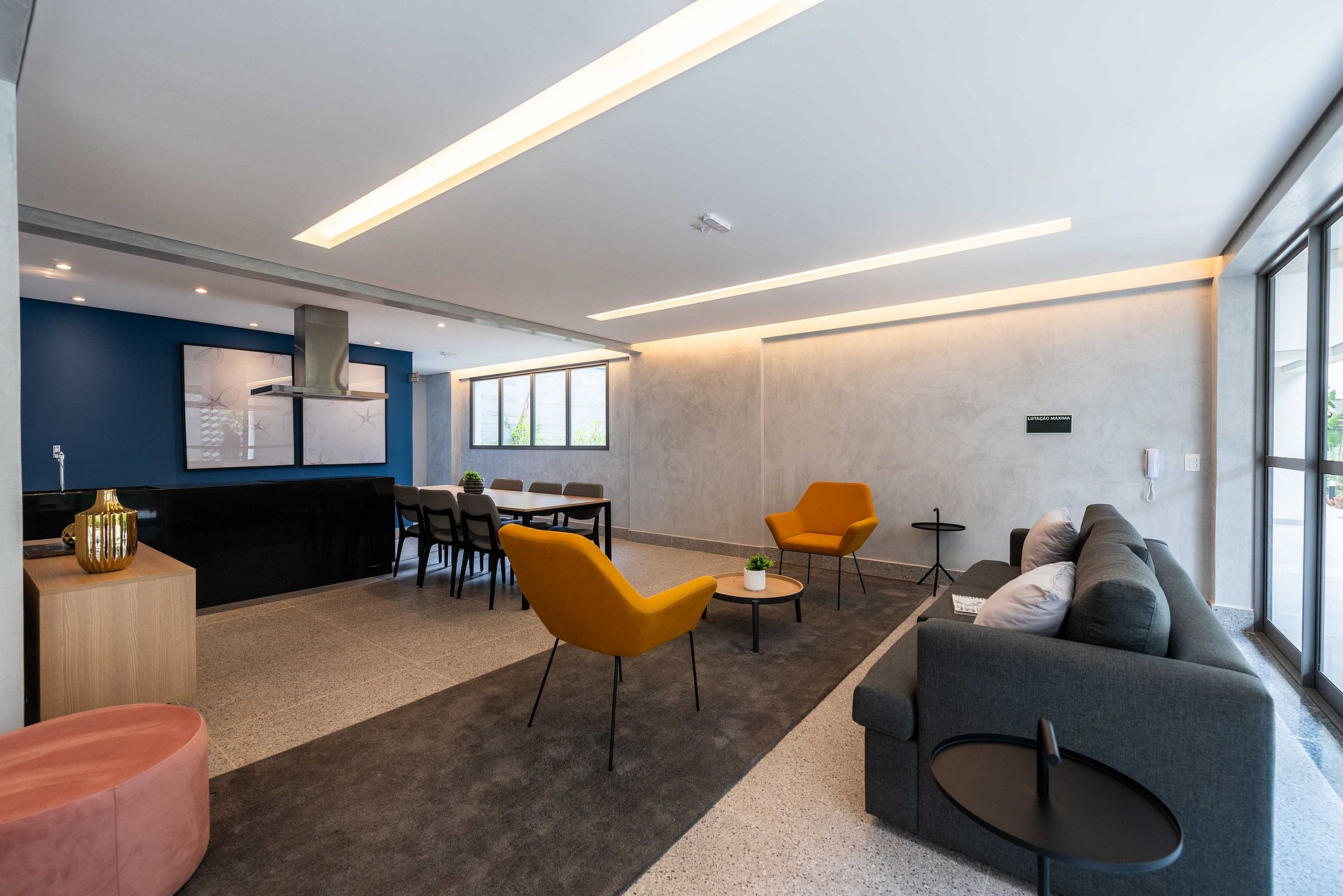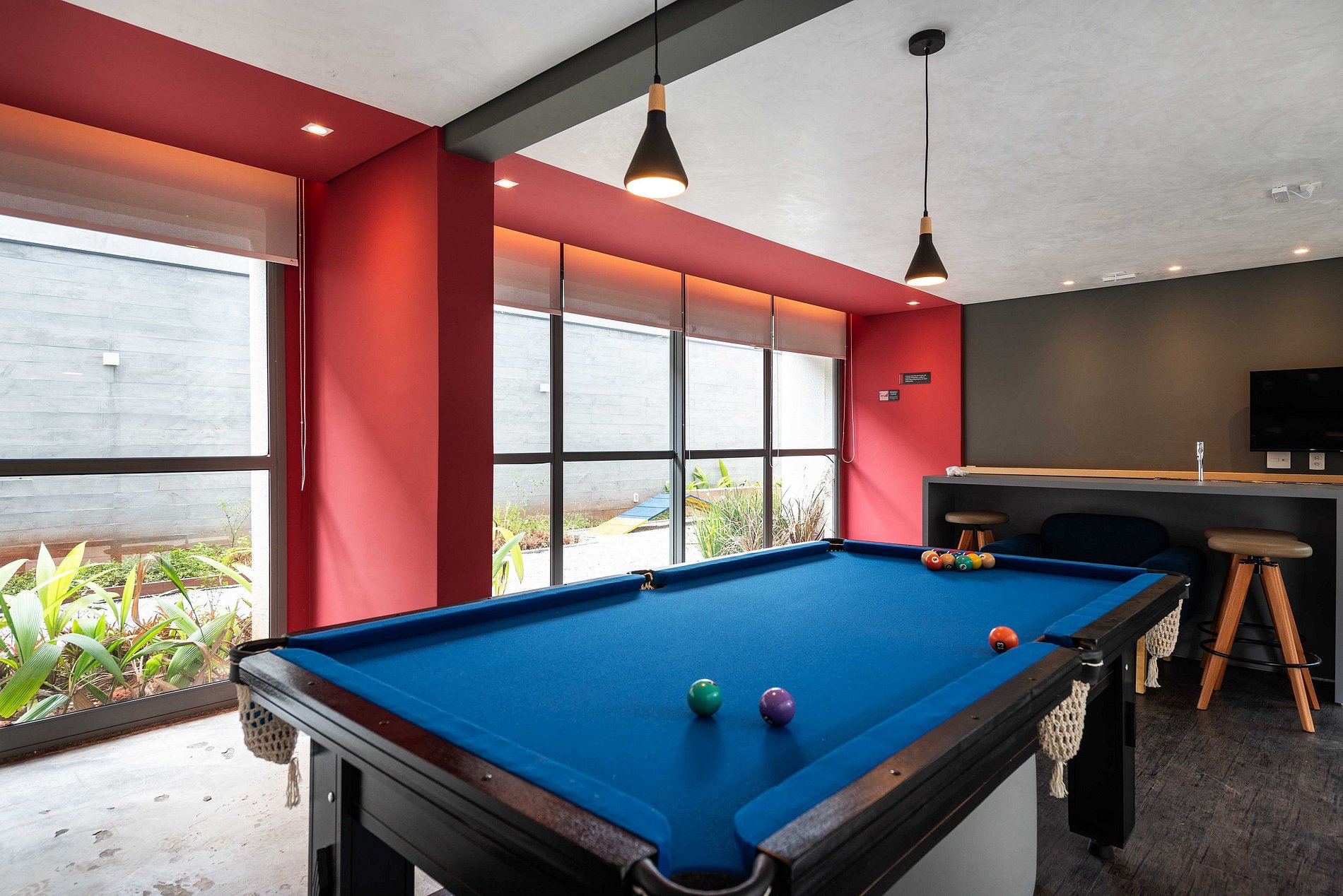 Completamente equipado nas áreas comuns, nosso espaço oferece uma sala de jogos, um terraço ensolarado para relaxar, uma conveniente lavanderia, um espaço pet dedicado e um moderno Home Office.