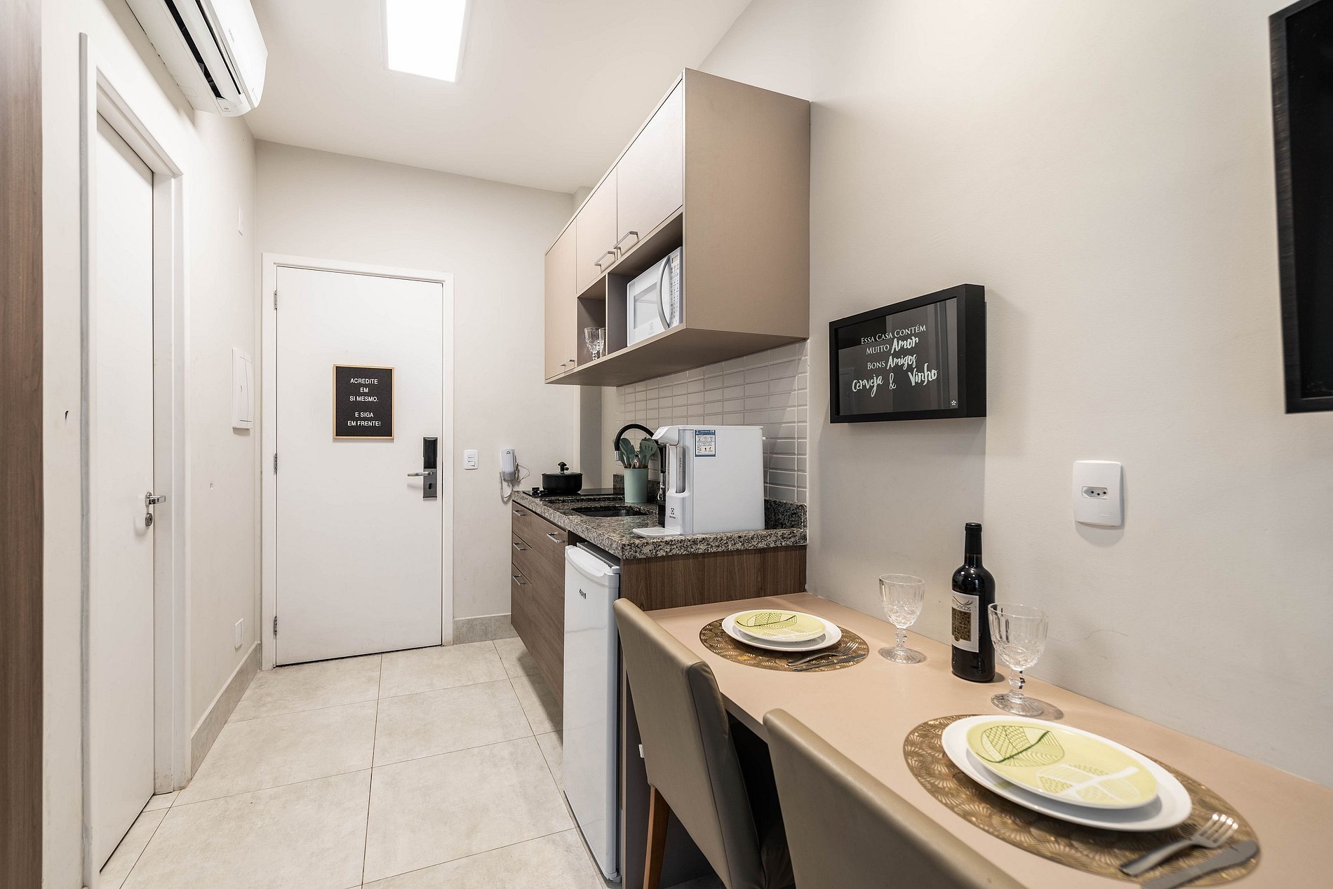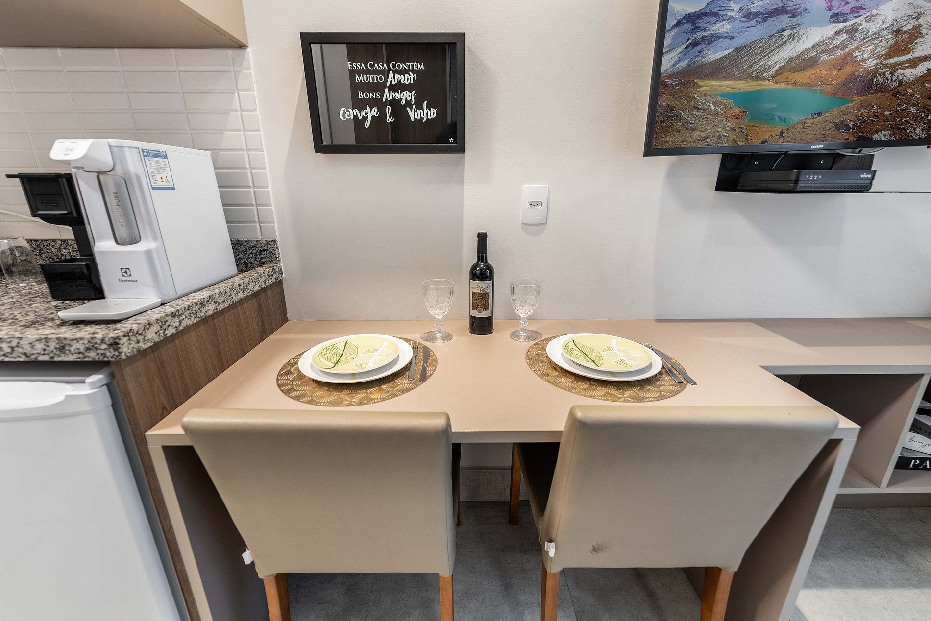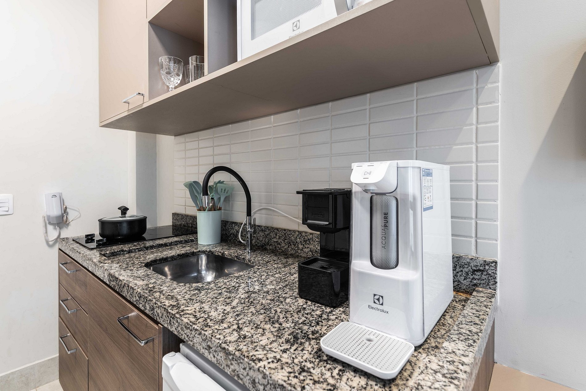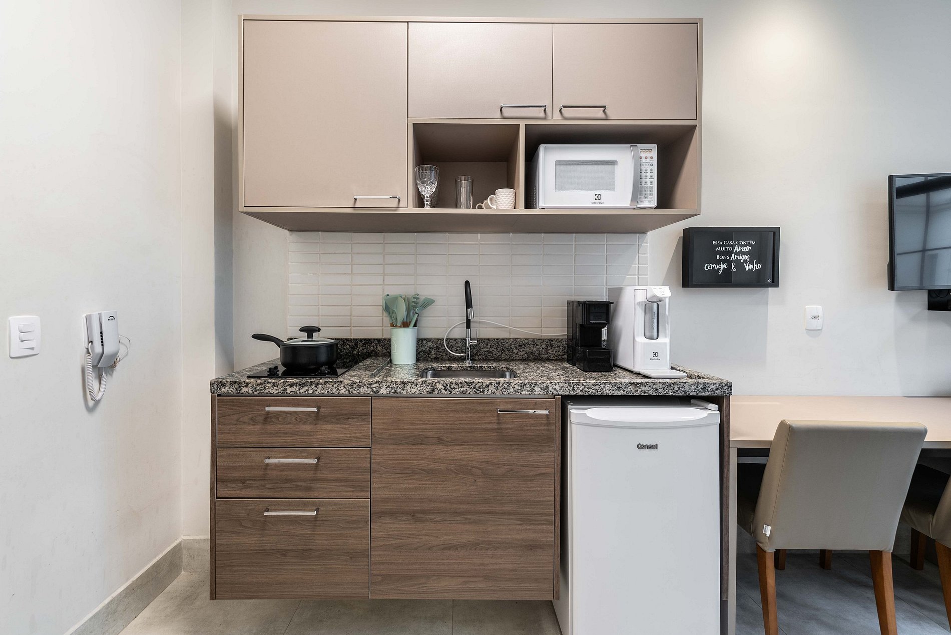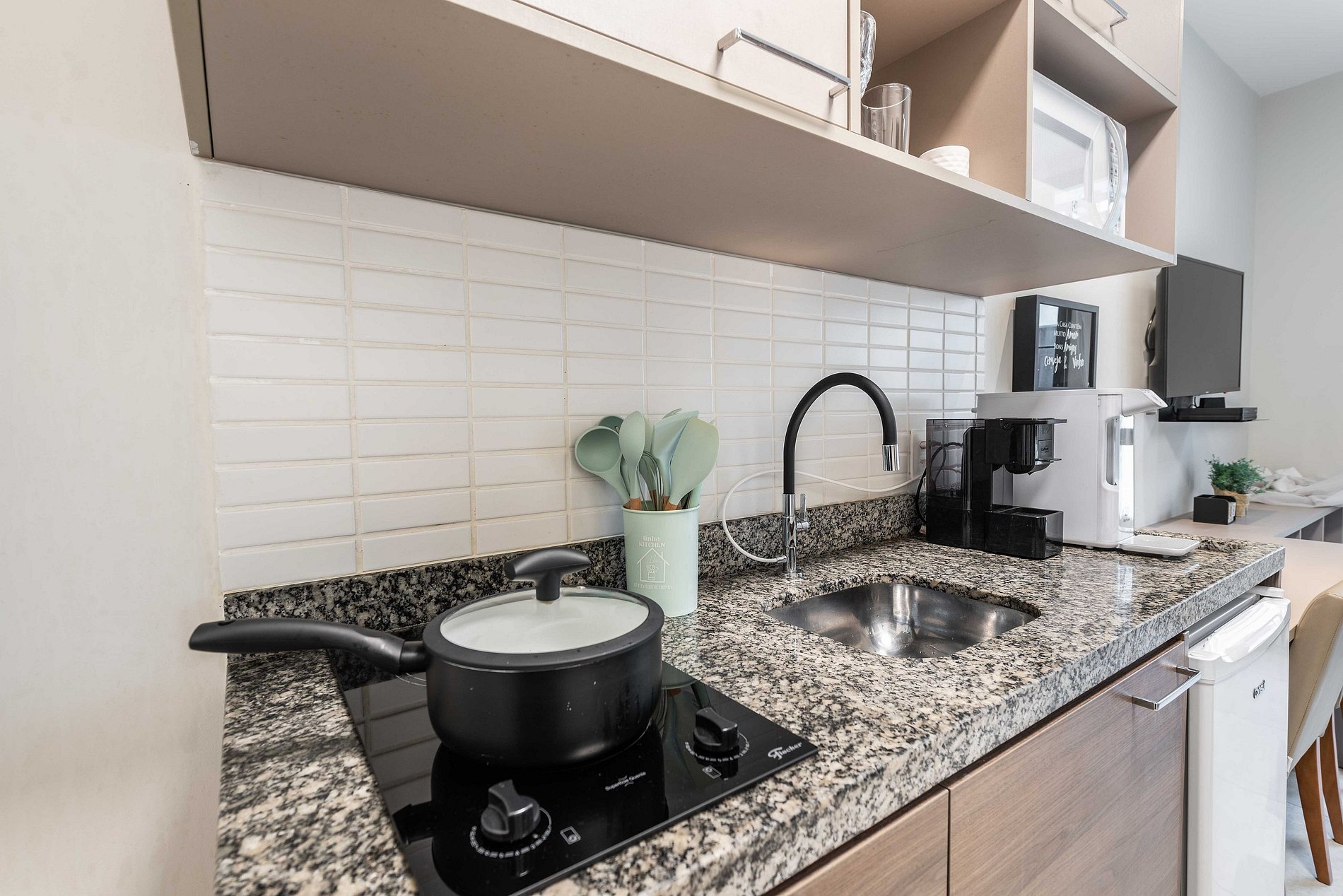 ・Cozinha completa: equipada com frigobar, fogão de indução, micro-ondas etc.