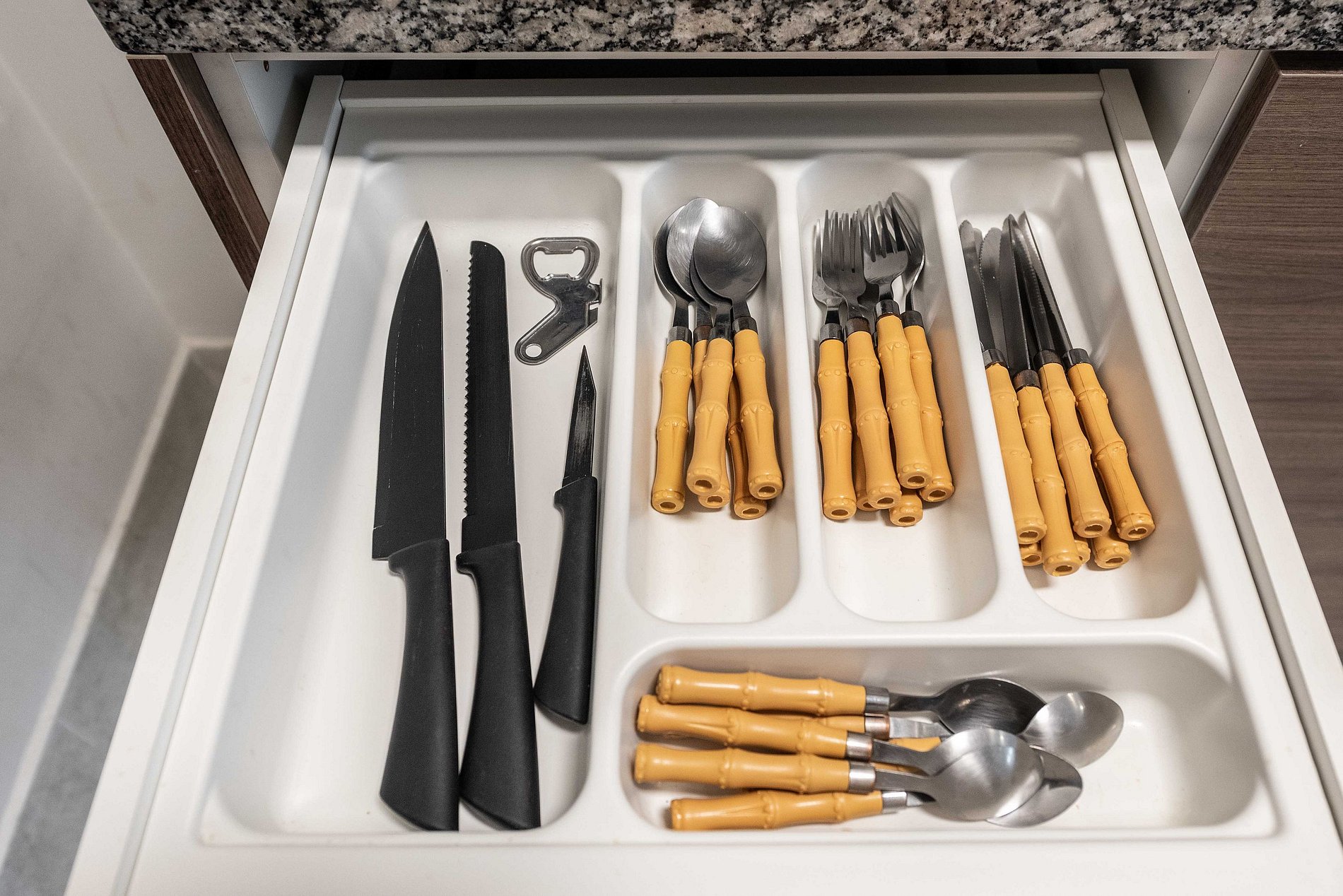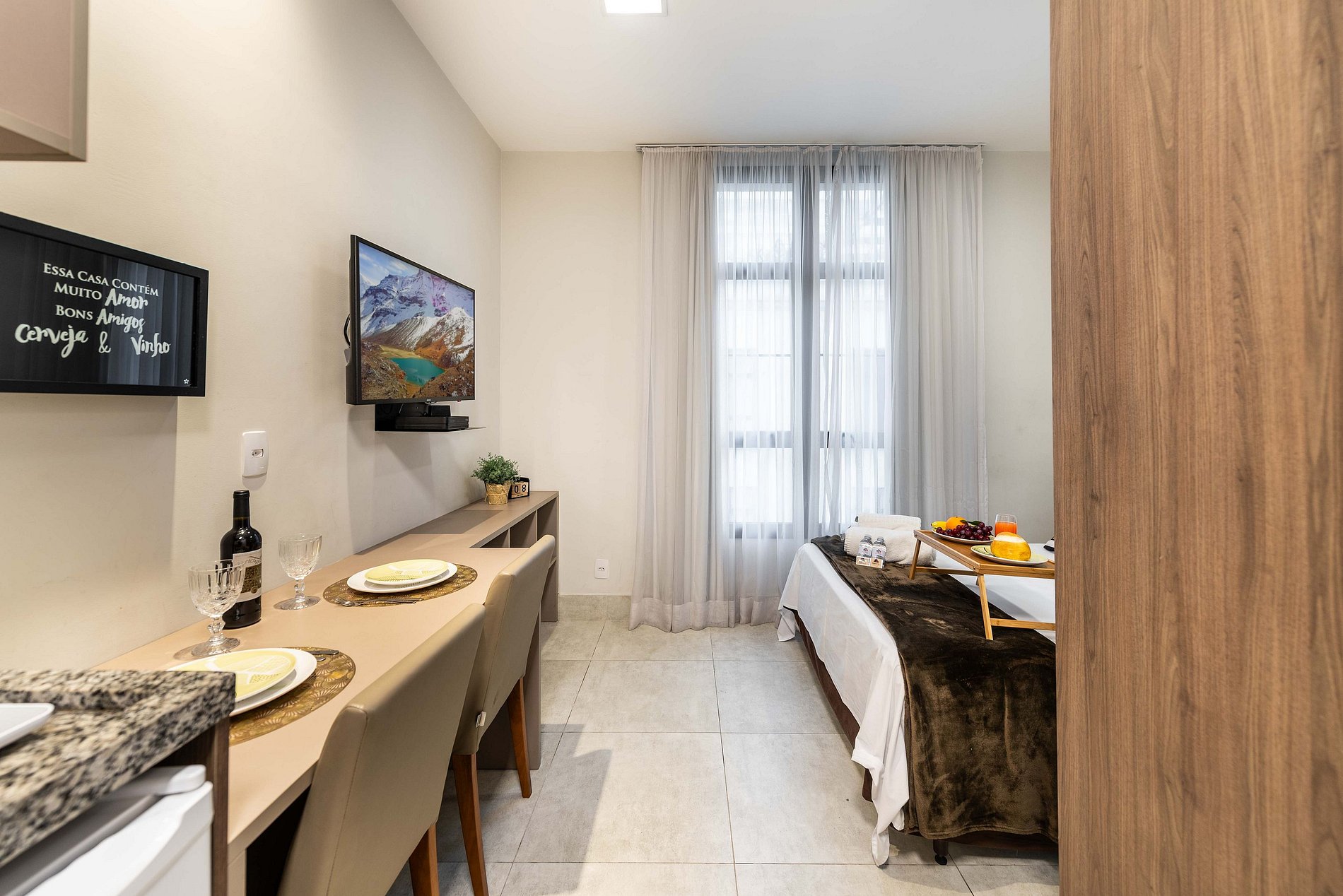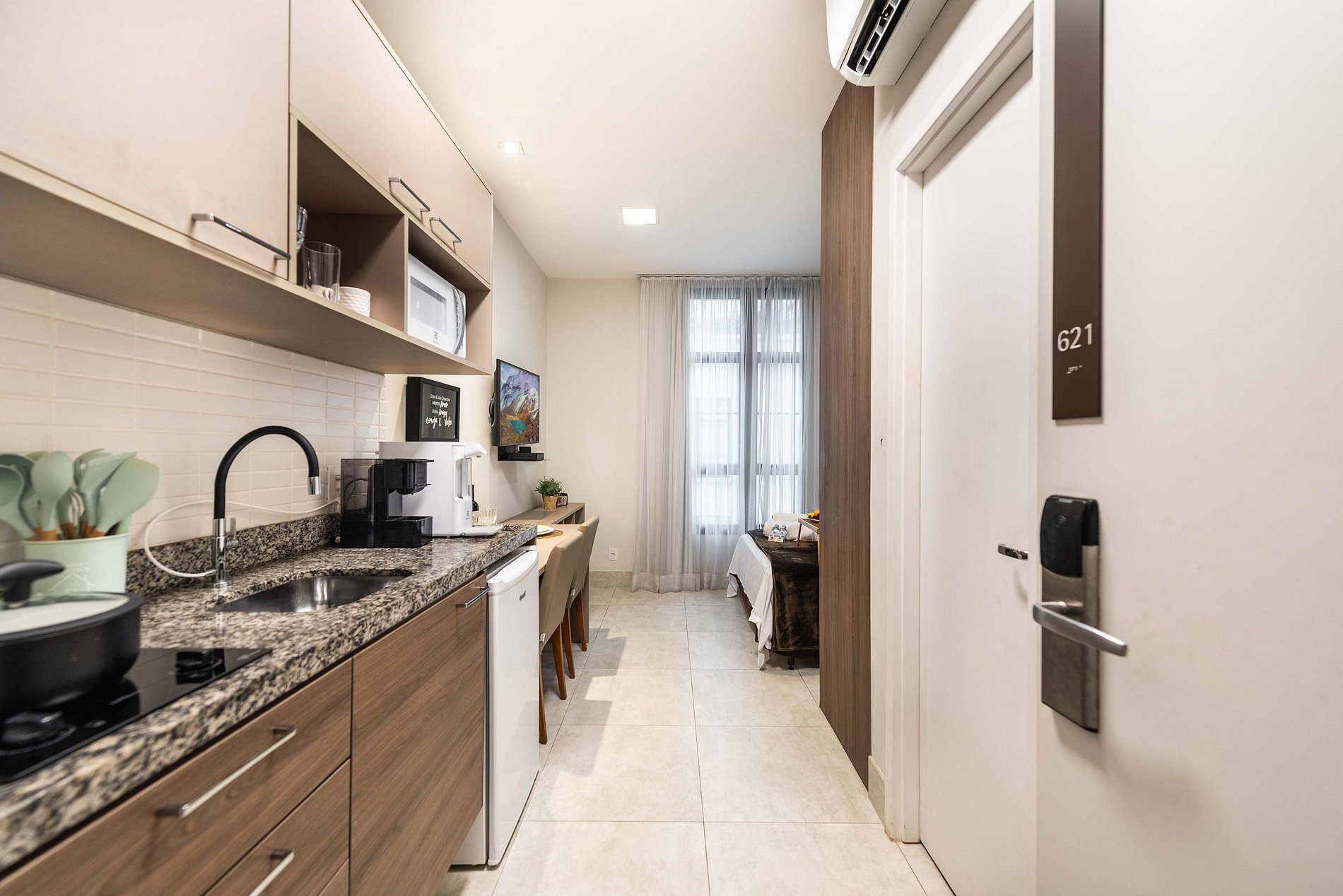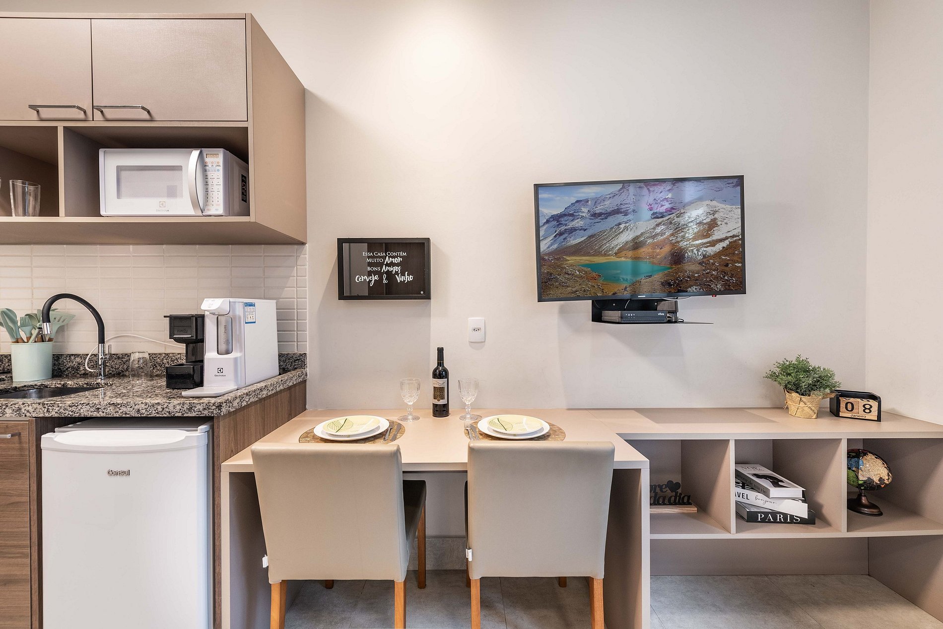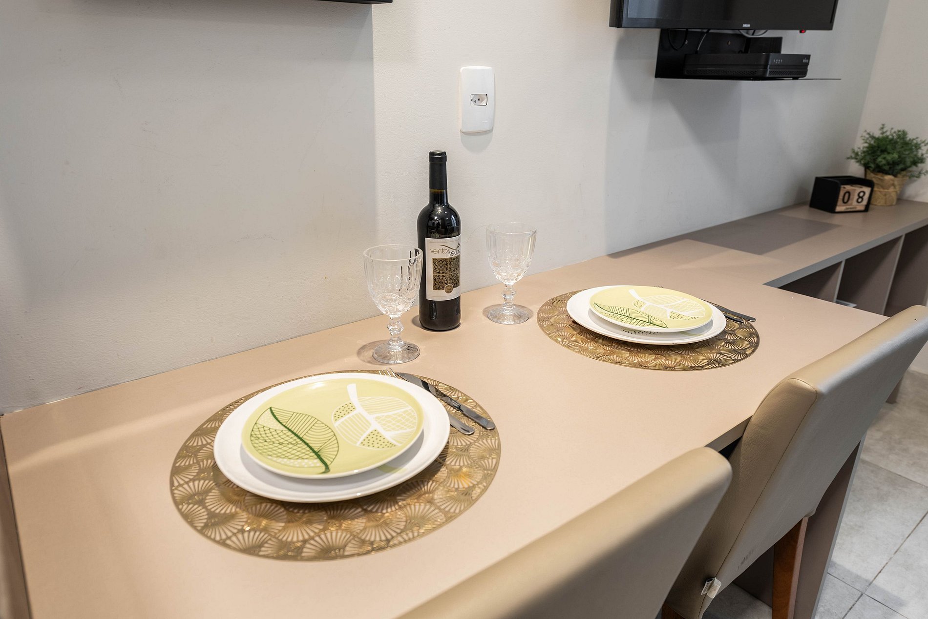 ・Cozinha completa: equipada com frigobar, fogão de indução, micro-ondas etc.