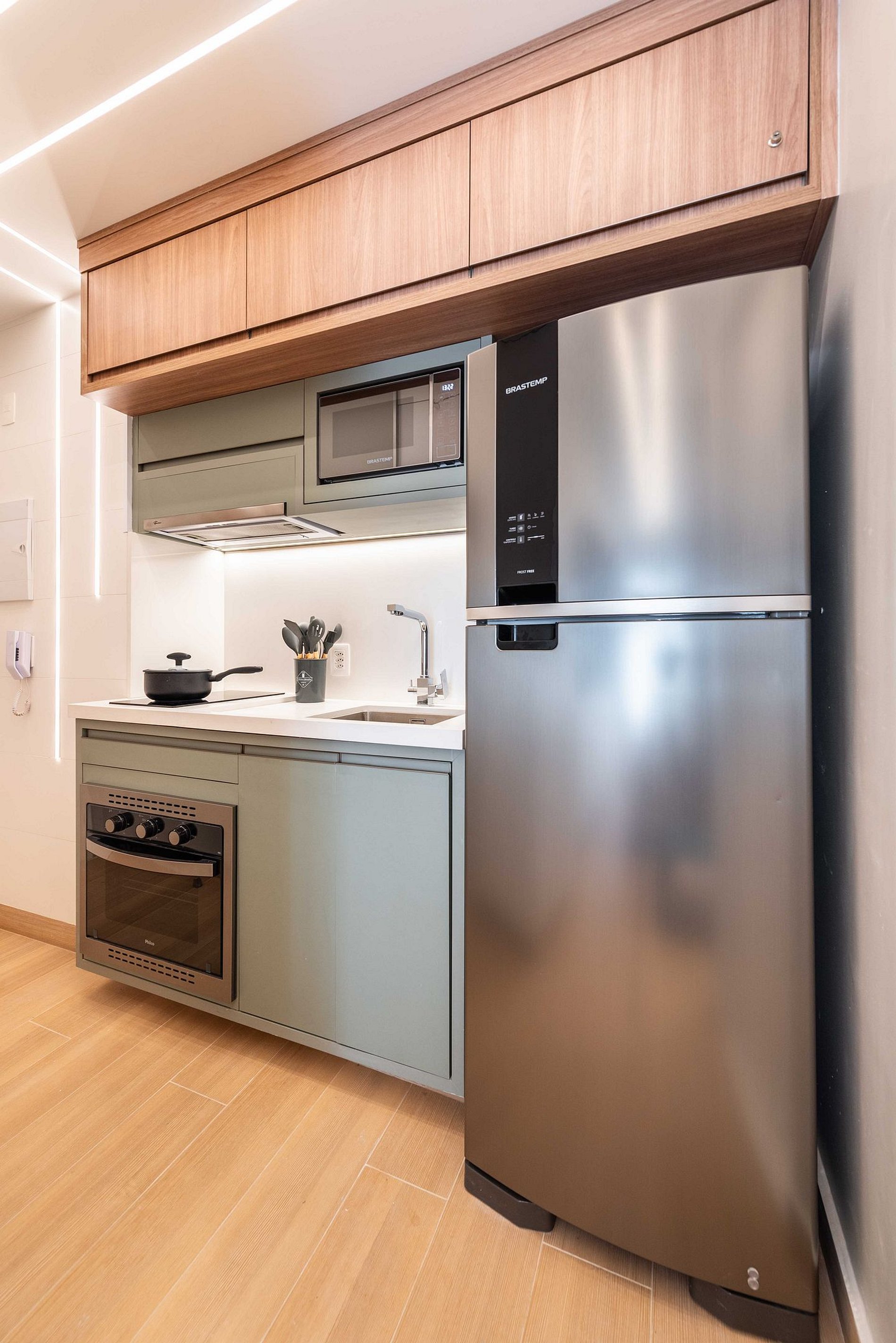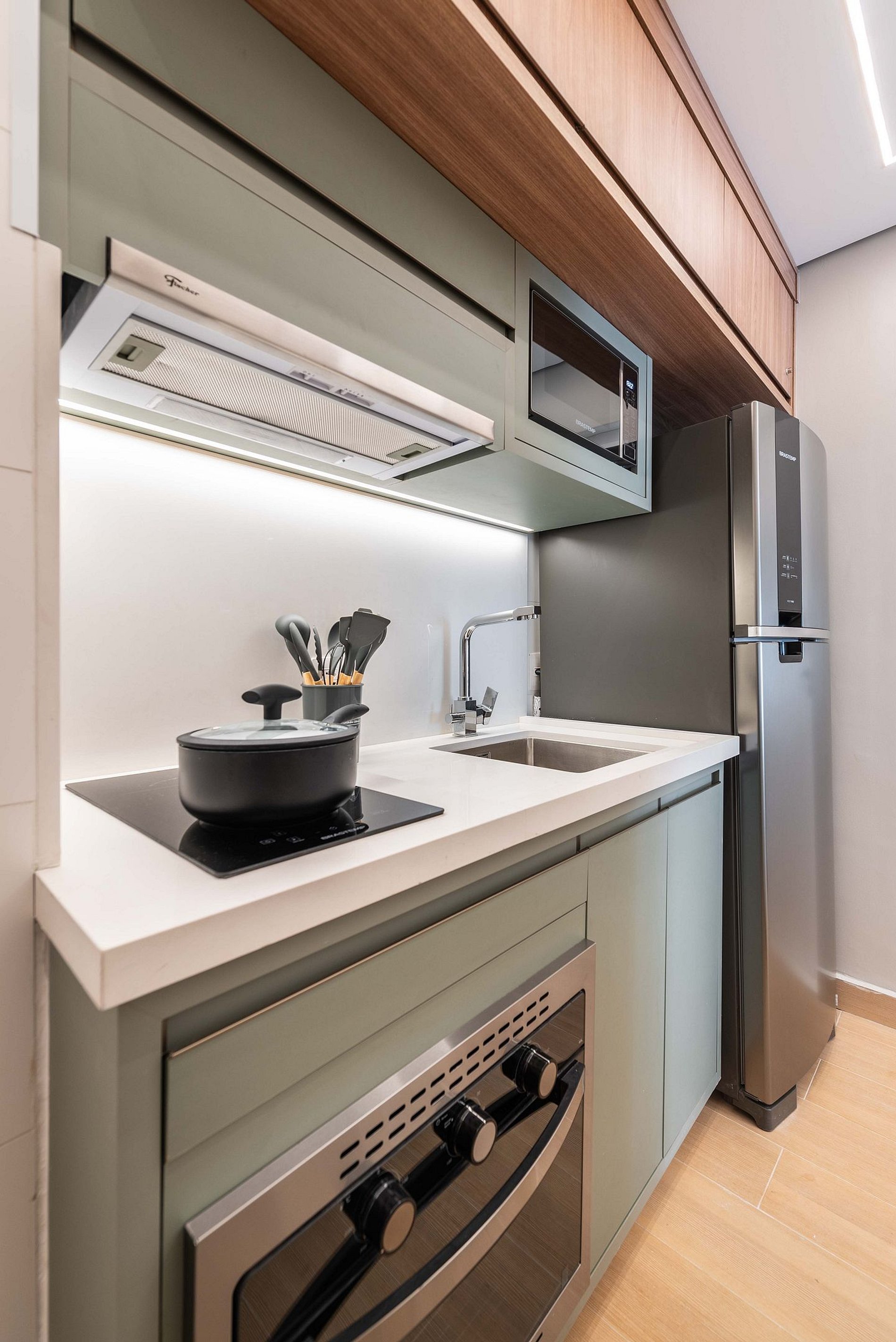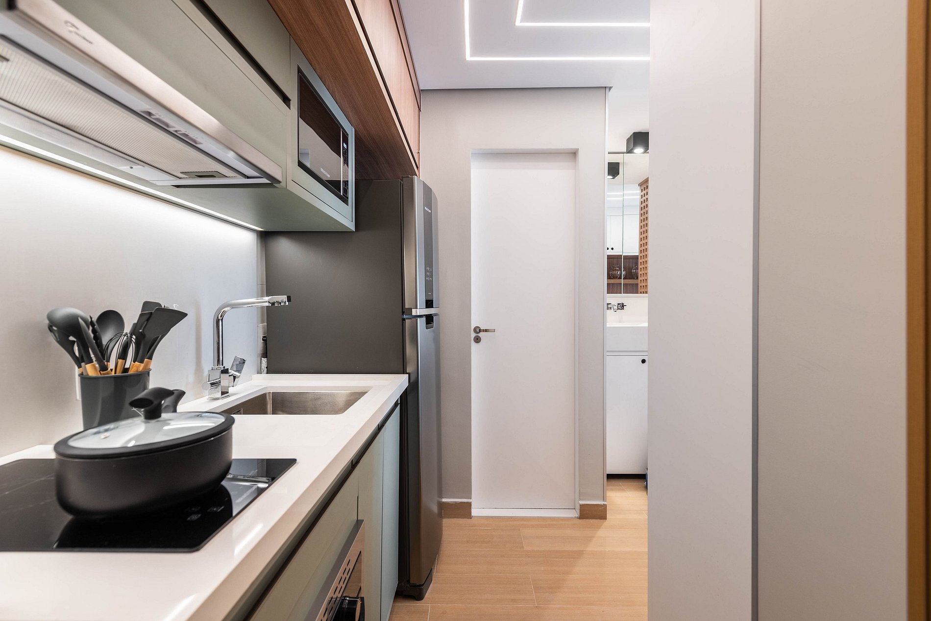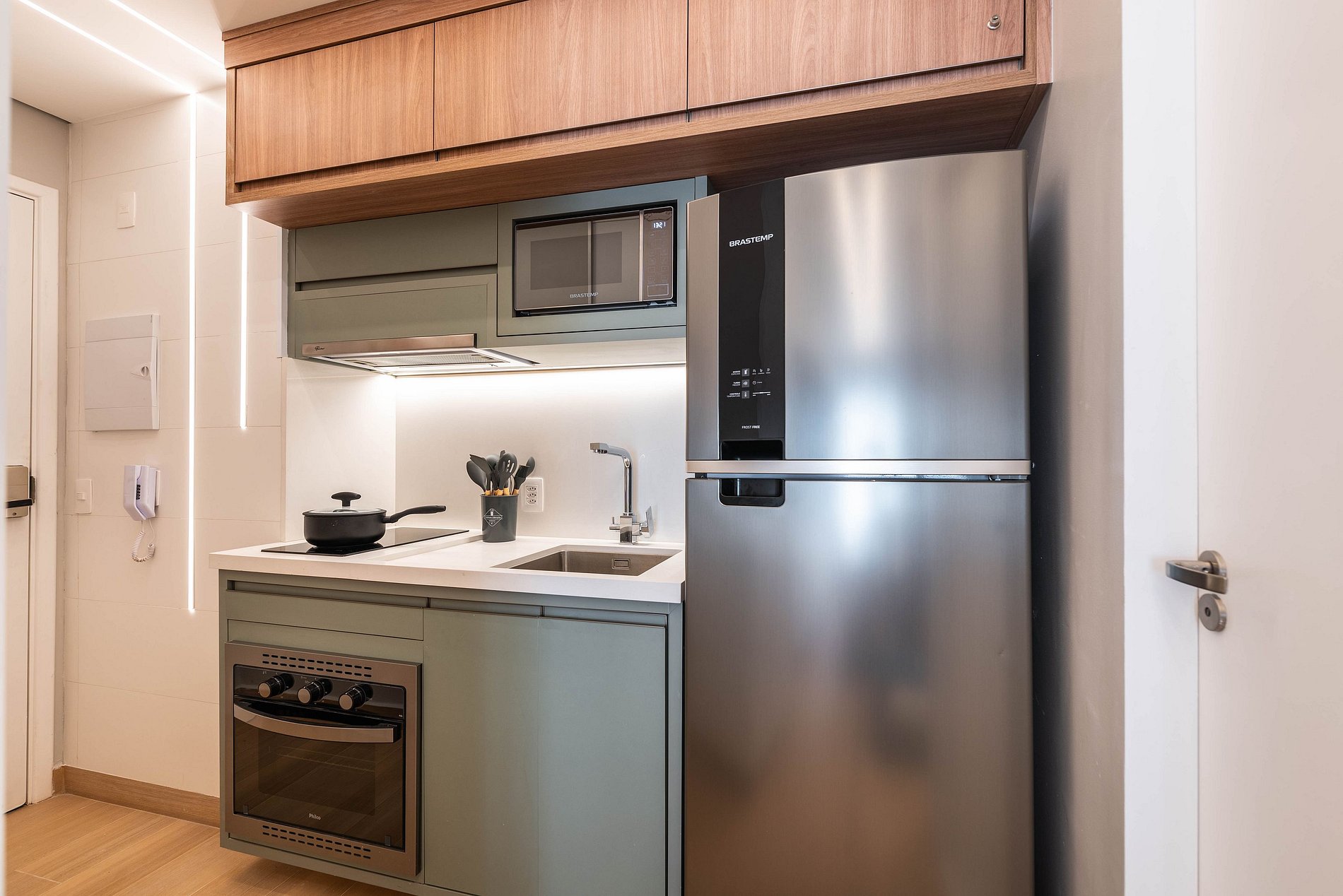 ・Cozinha completa: equipada com geladeira, fogão de indução, micro-ondas etc.