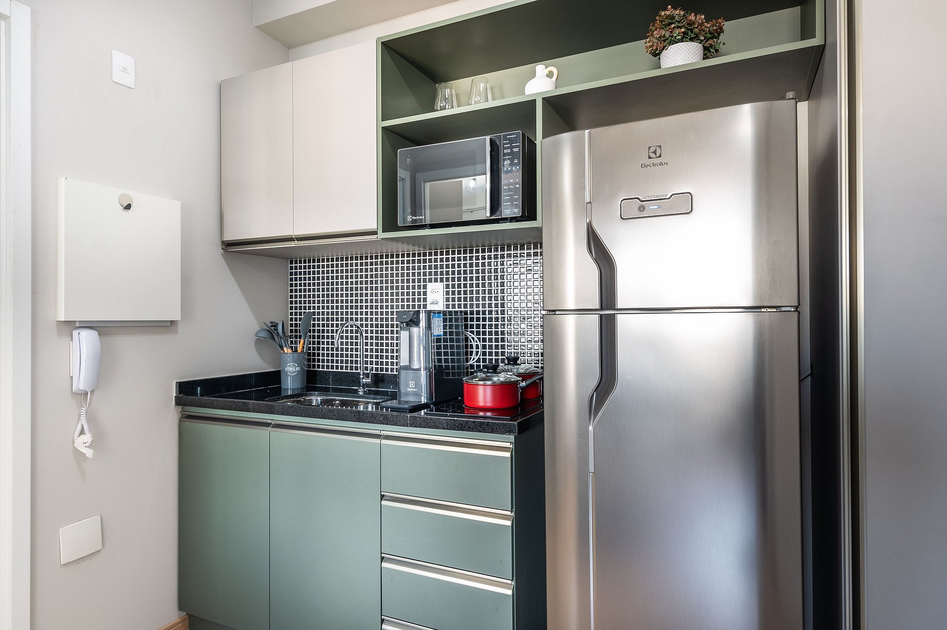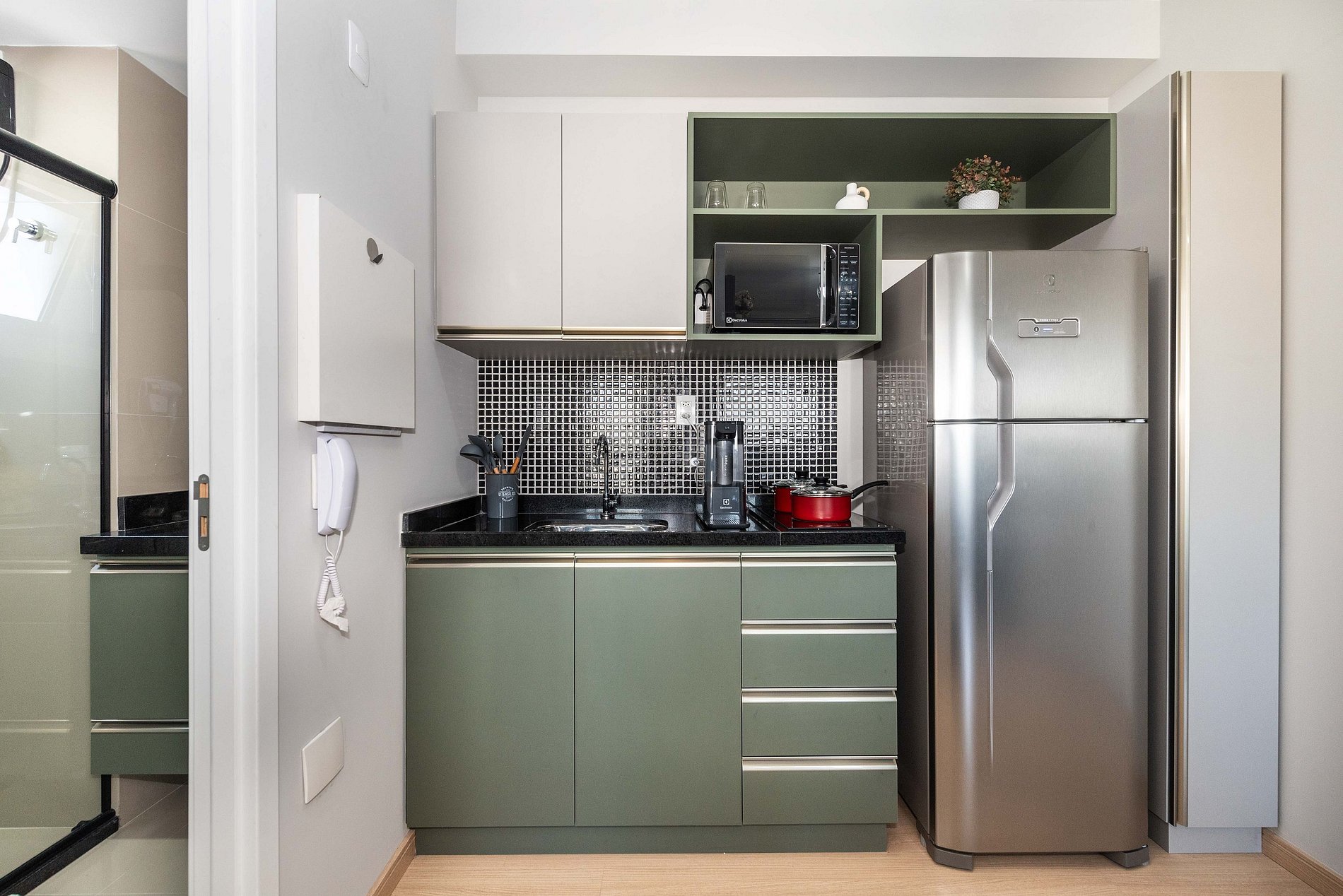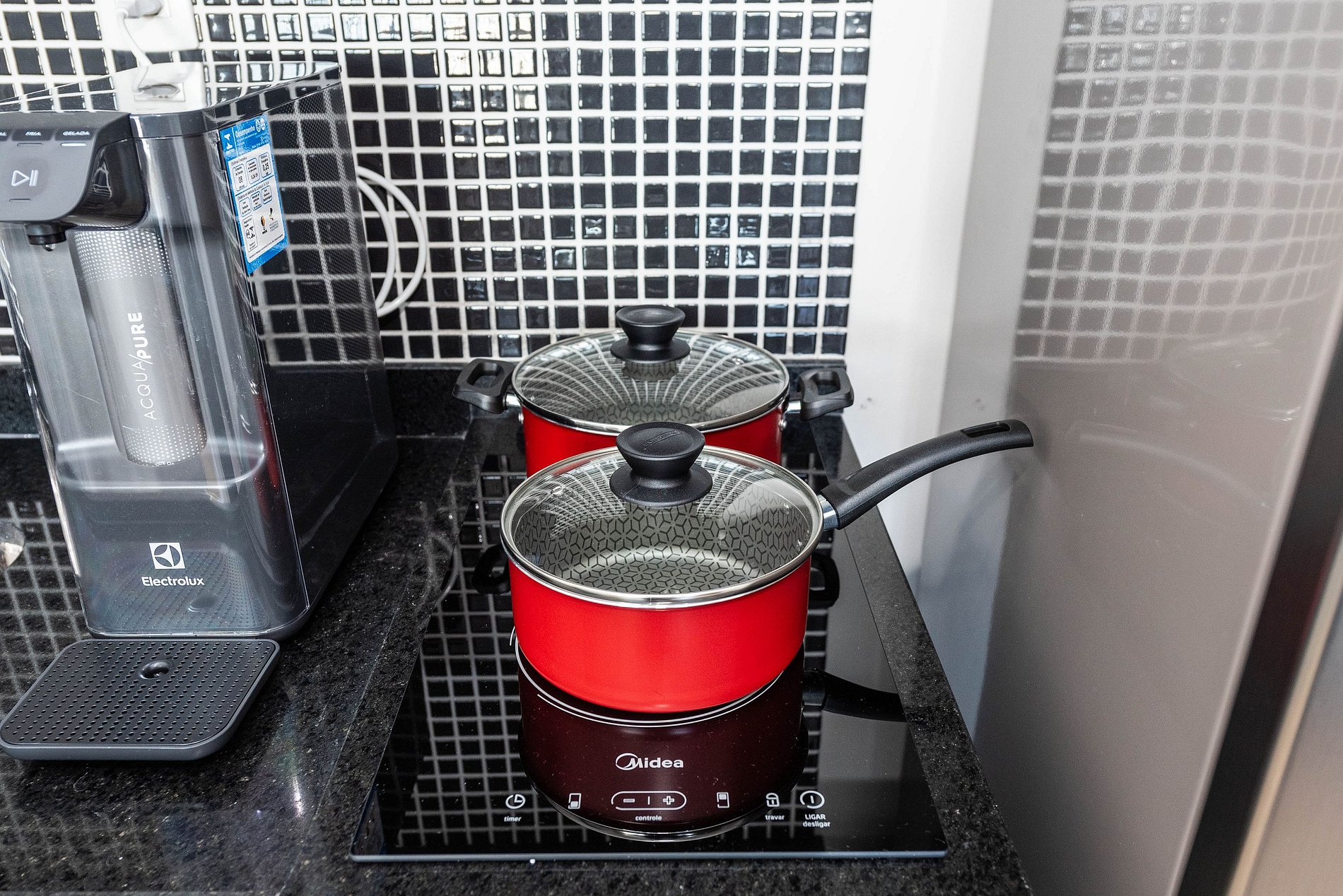 ・Cozinha completa: equipada com geladeira, fogão de indução, micro-ondas etc.