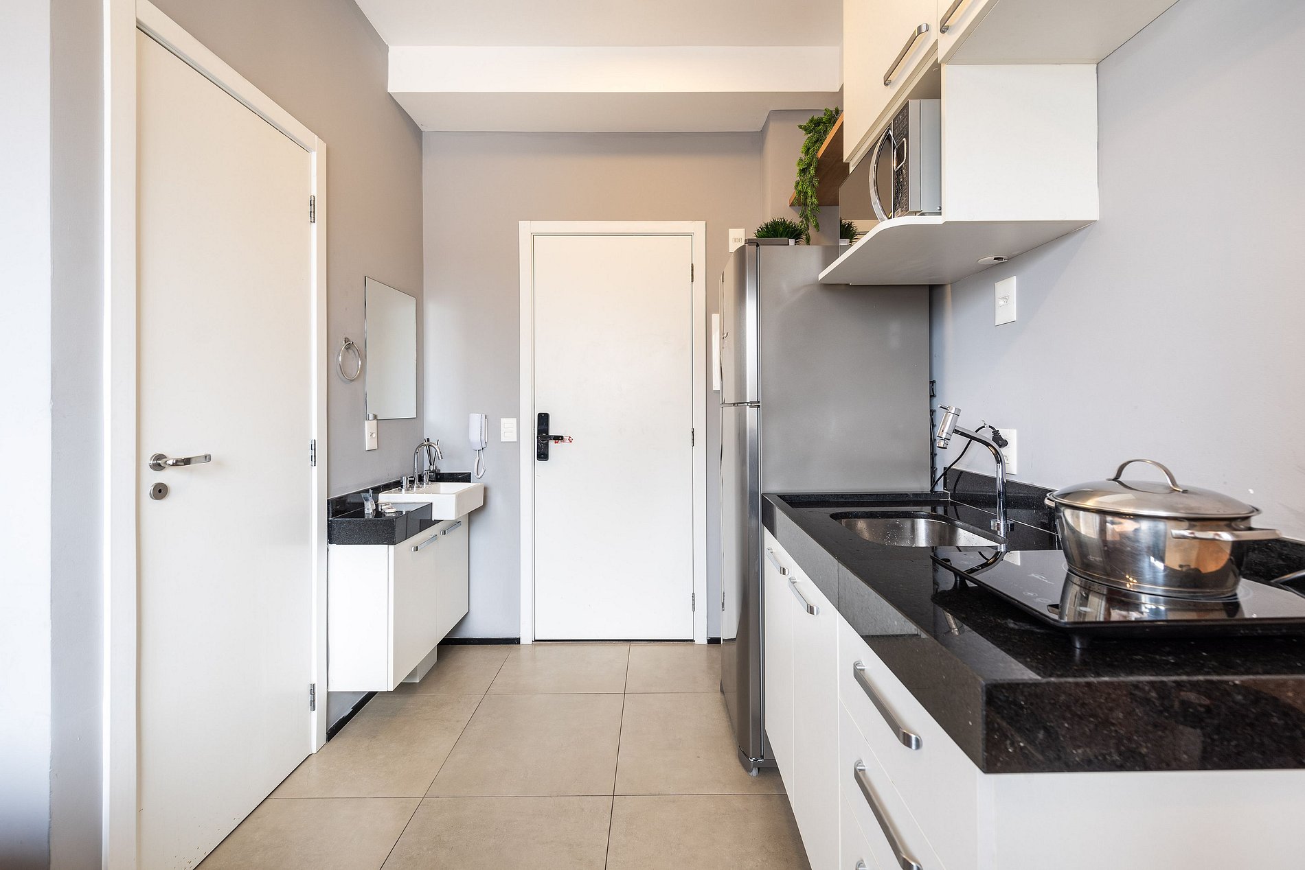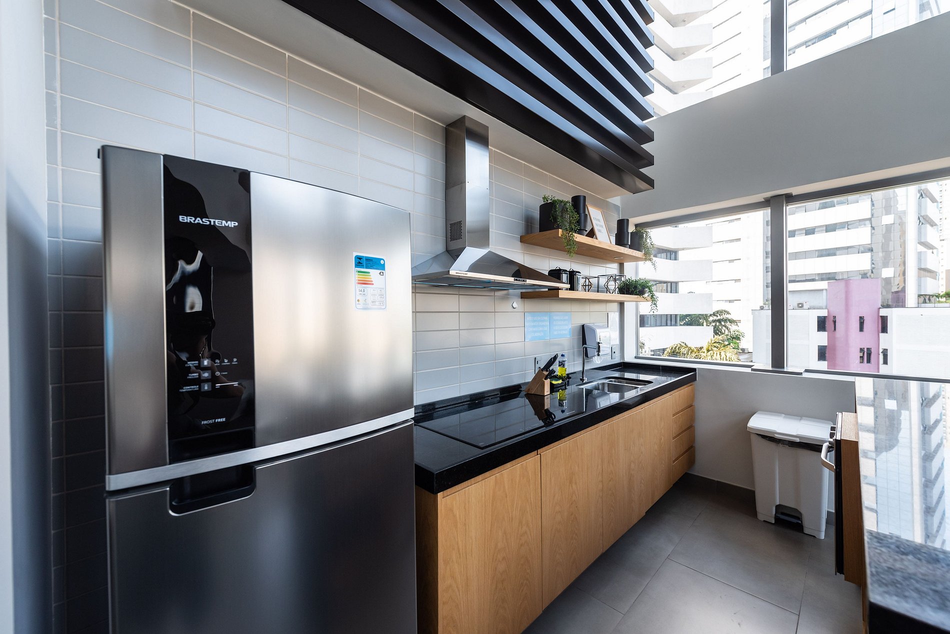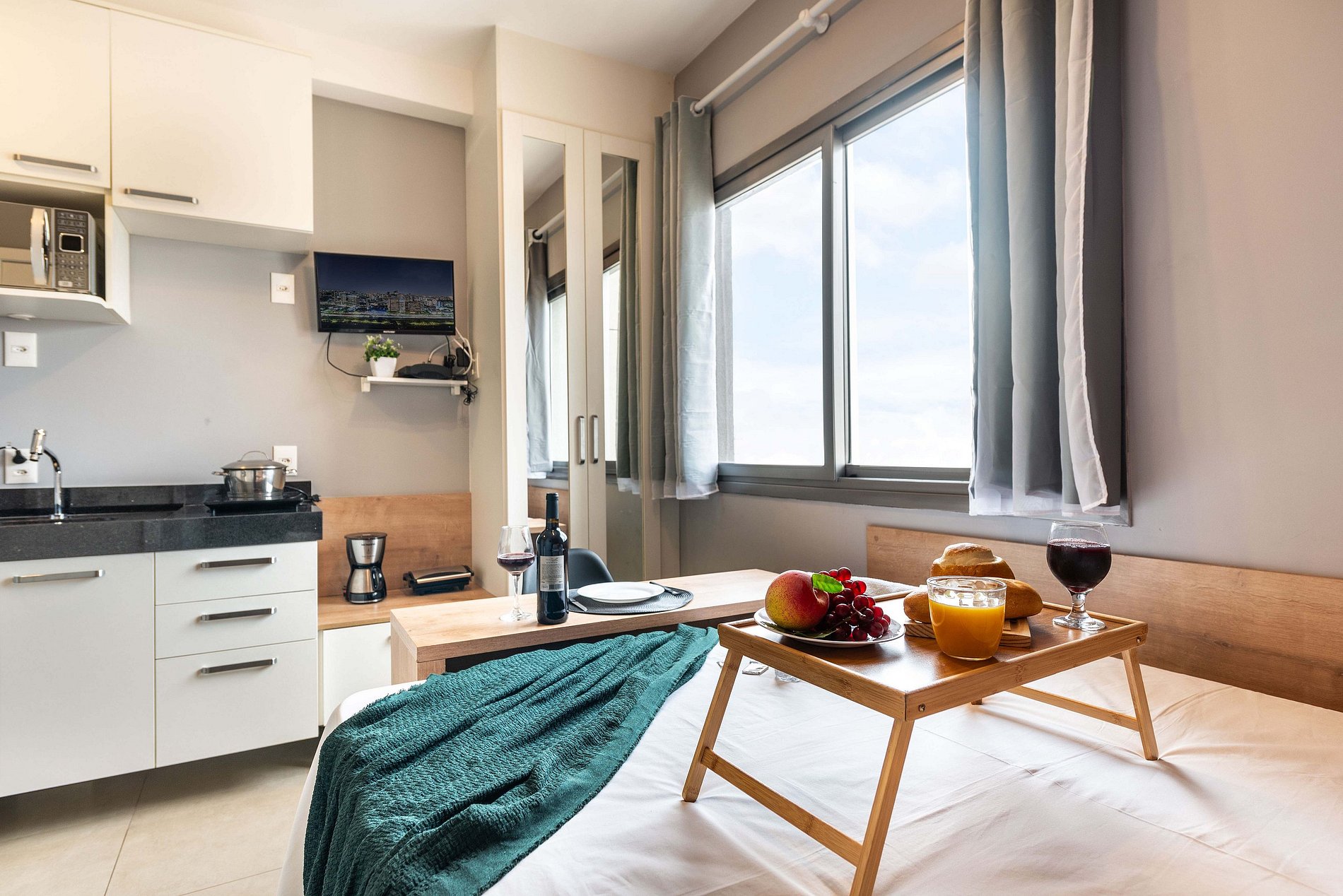 ・Cozinha completa: equipada com frigobar, fogão de indução, micro-ondas etc.