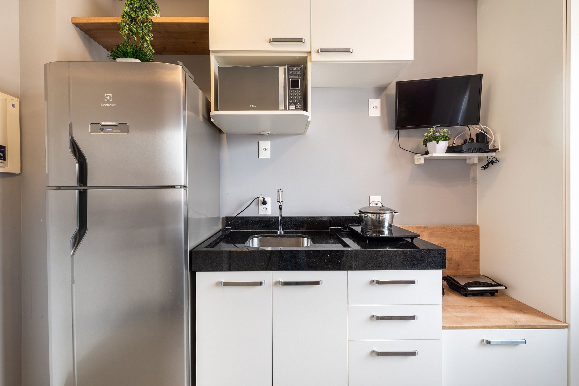・Cozinha completa: equipada com frigobar, fogão de indução, micro-ondas etc.