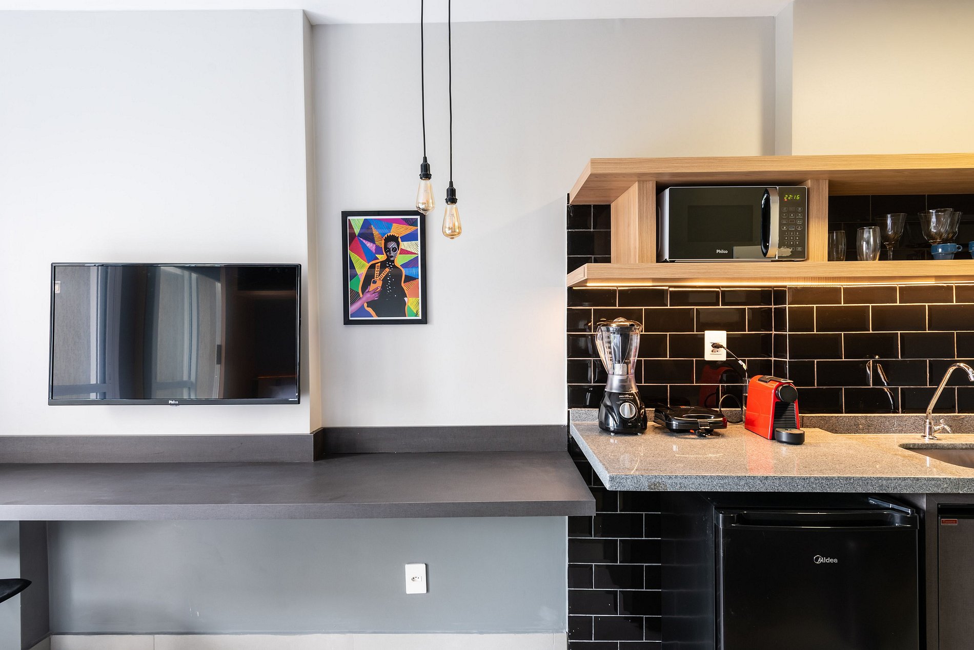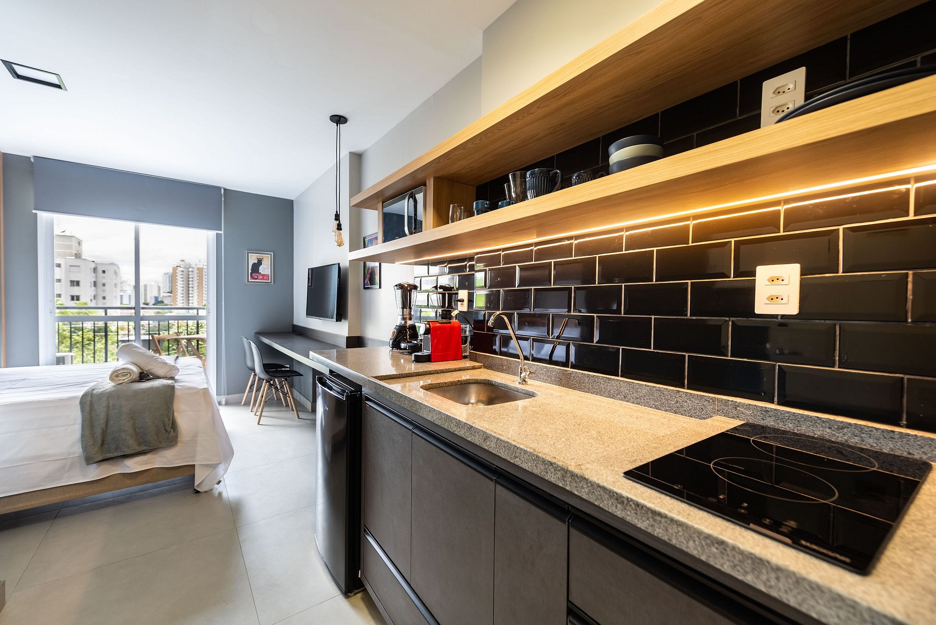 Desfrute de uma estadia especial em nosso studio elegante e cuidadosamente preparado para duas pessoas. O ambiente combina conforto e praticidade, oferecendo cama aconchegante para noites tranquilas, cozinha funcional equipada com itens essenciais, espaço agradável para relaxar e banheiro moderno