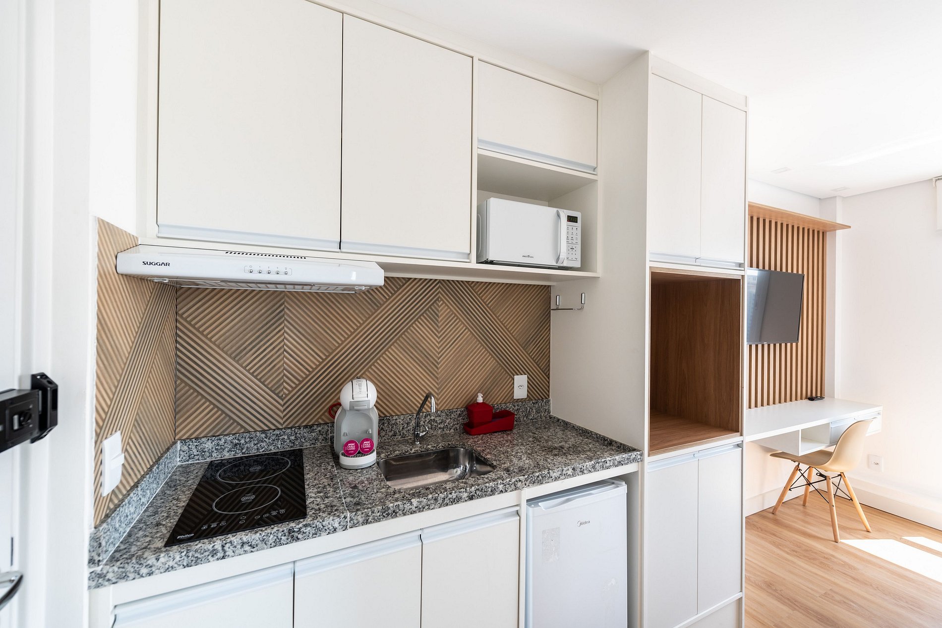 ・Cozinha completa: equipada com frigobar, fogão de indução (duas boca), micro-ondas etc.