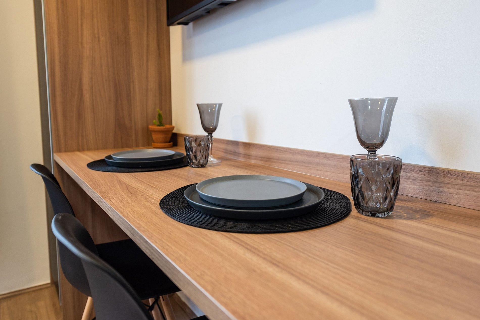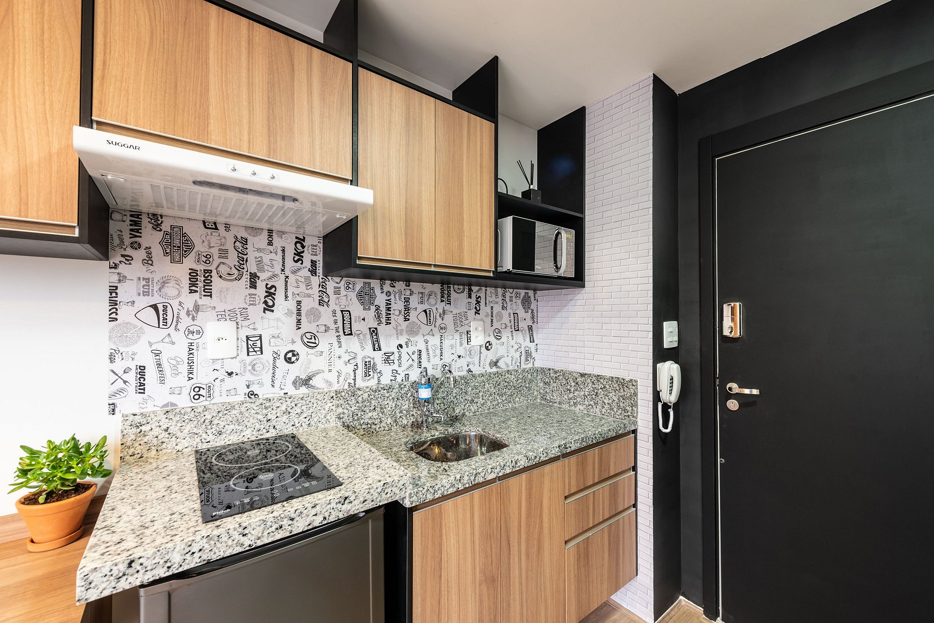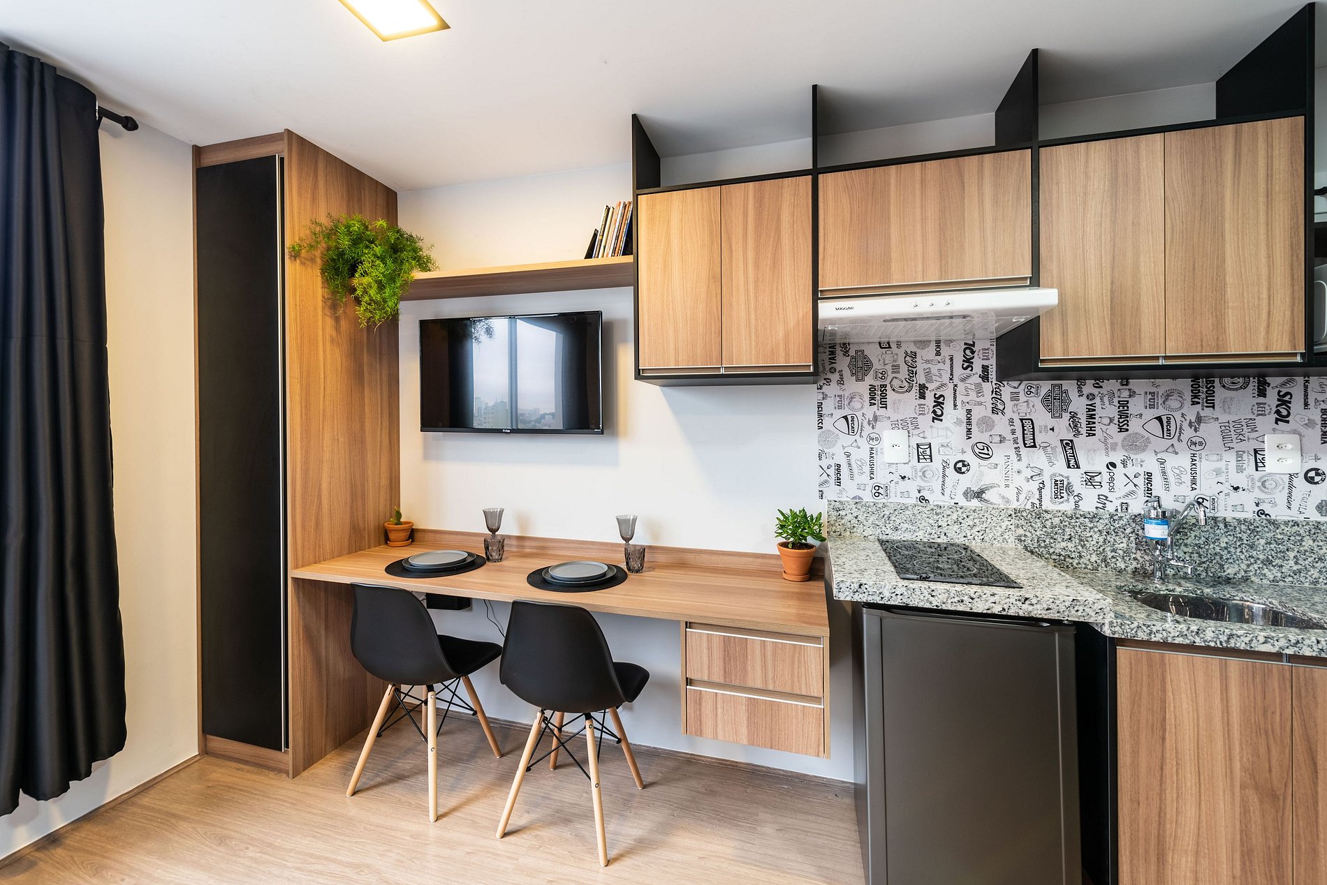 ・Cozinha completa: equipada com frigobar, fogão, micro-ondas etc.
