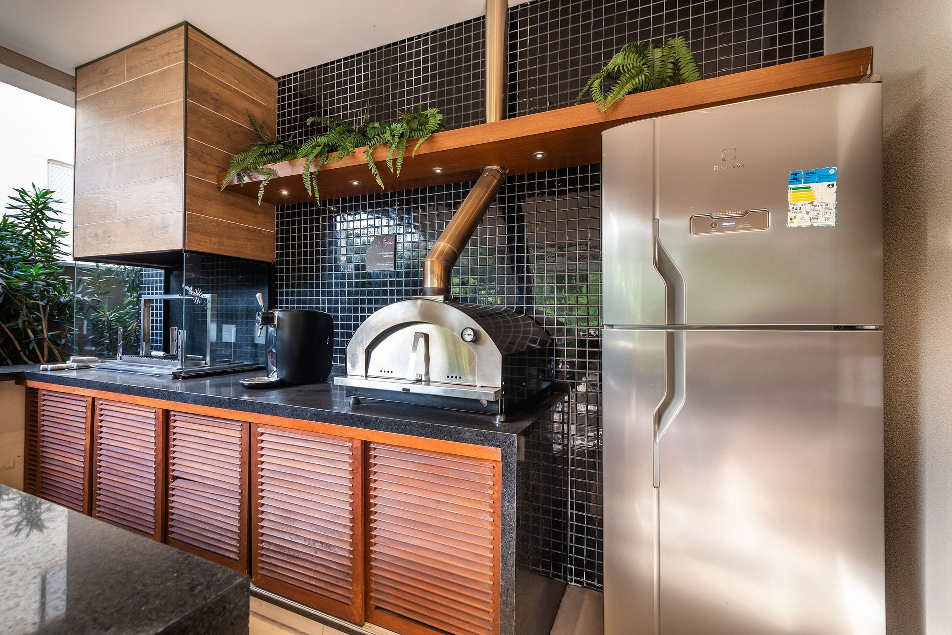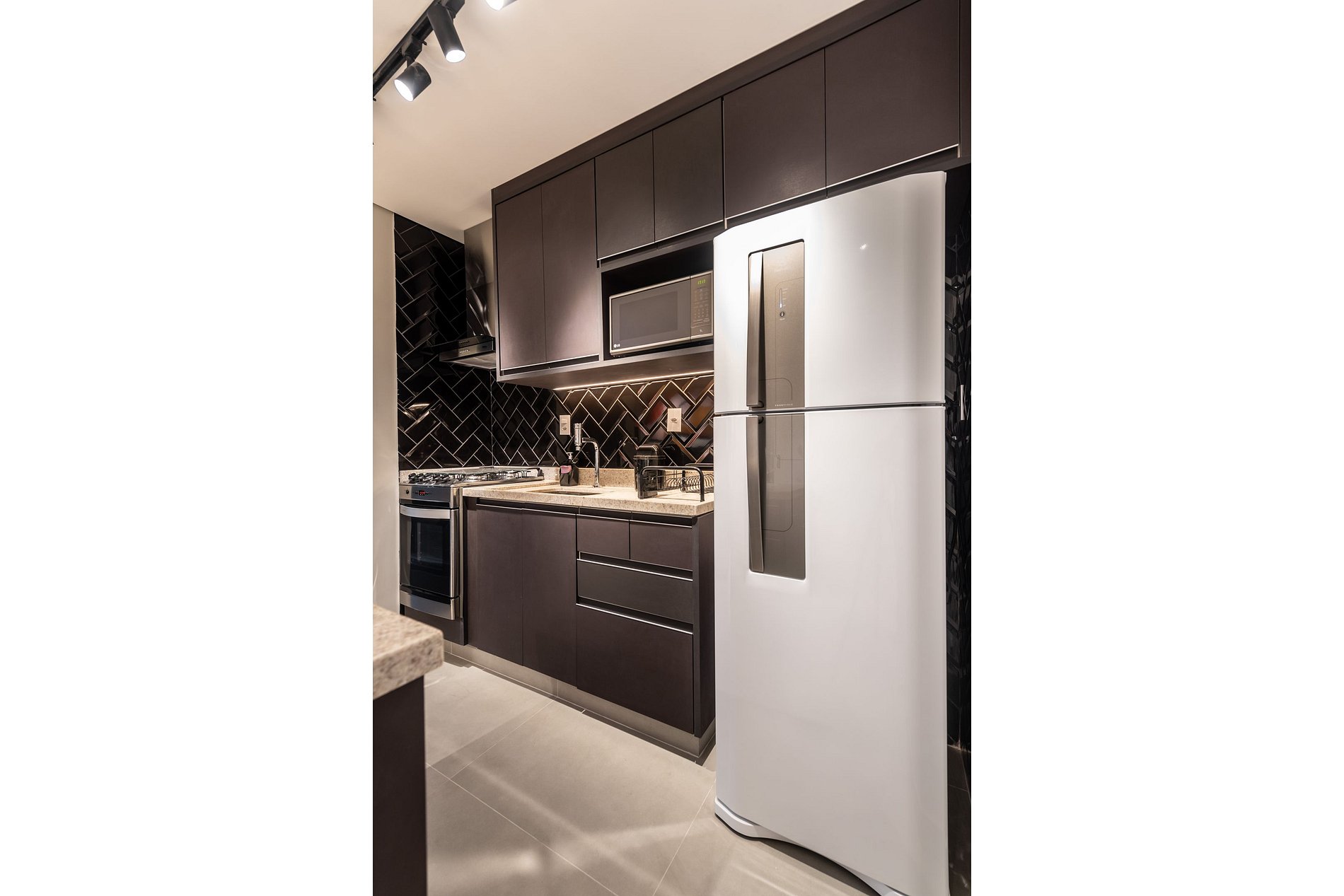 ・Cozinha completa: equipada com geladeira, fogão, forno, micro-ondas, etc.