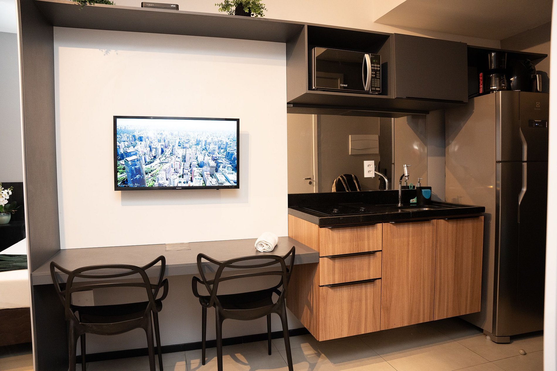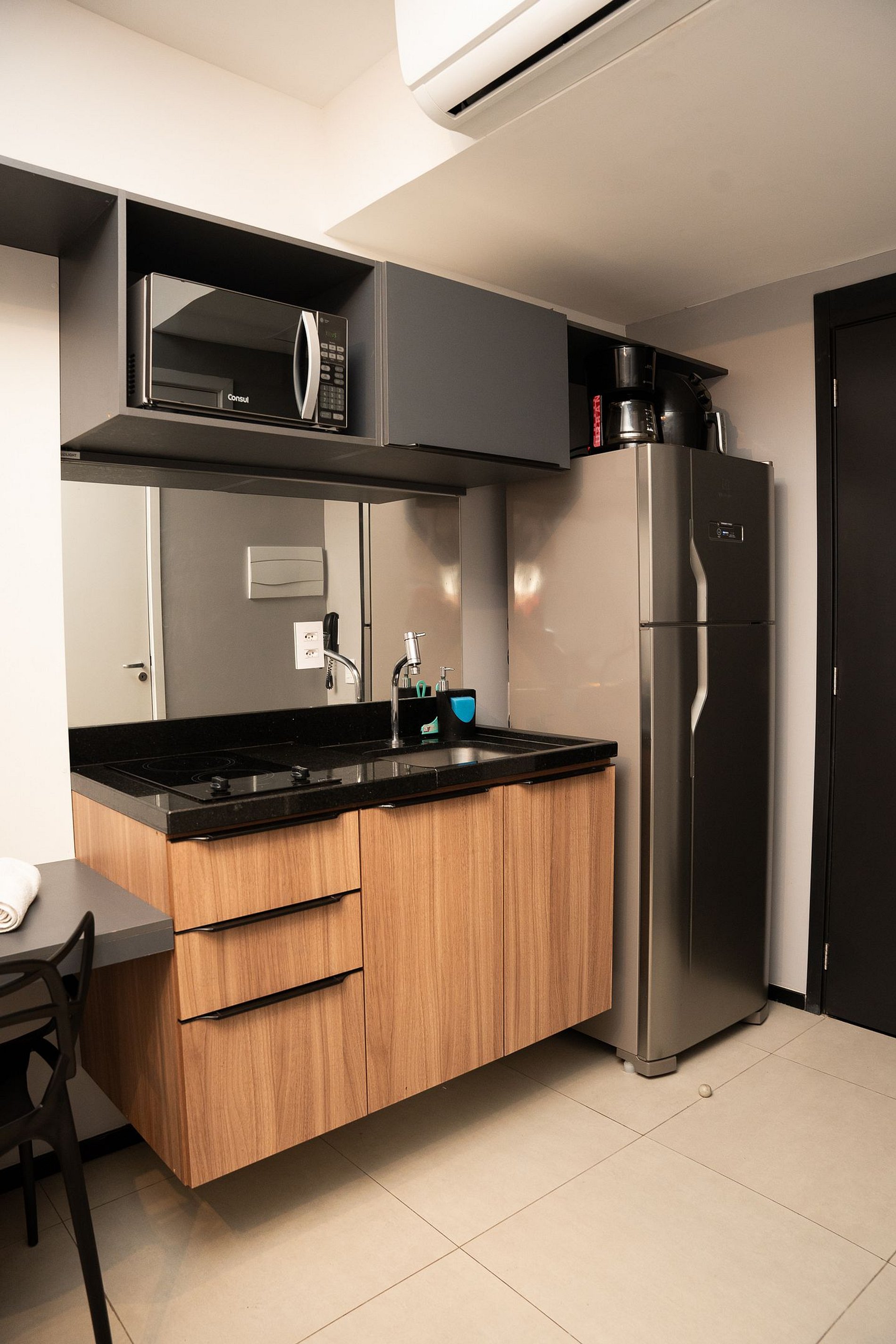 ・Cozinha completa: equipada com geladeira, fogão de indução, micro-ondas etc.