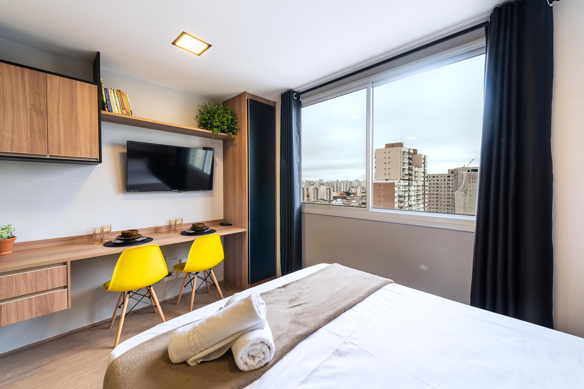 Studio completo e aconchegante, ideal para quem busca conforto e praticidade. O espaço conta com cama confortável, cozinha funcional e banheiro moderno, oferecendo tudo o que você precisa para uma estadia tranquila.