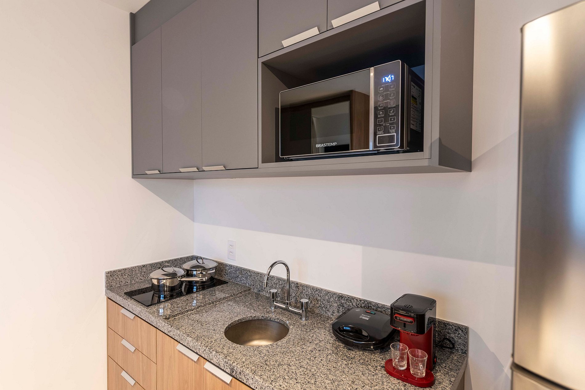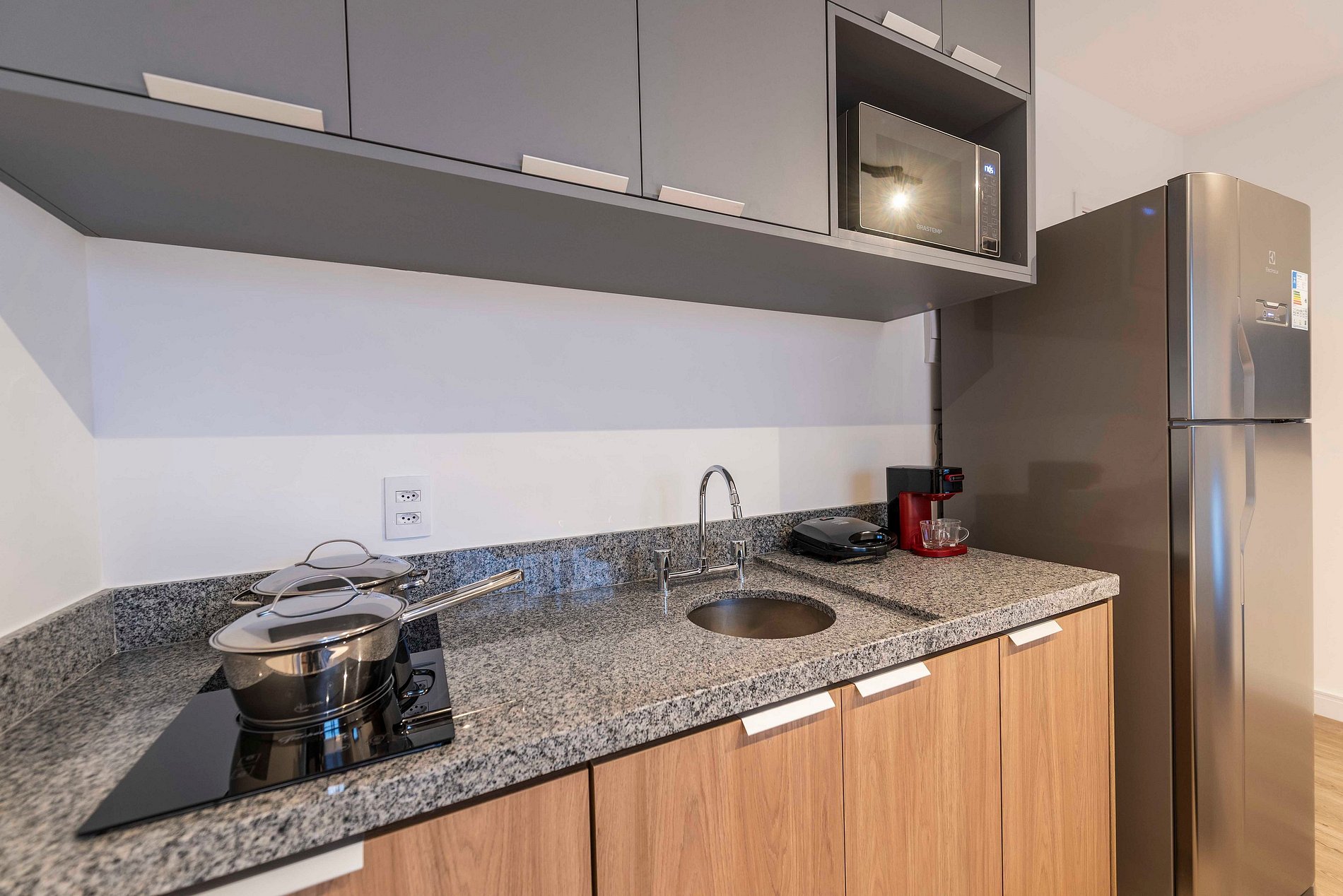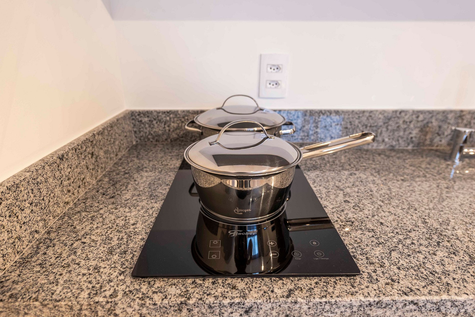 ・Cozinha completa: equipada com geladeira, fogão de indução, micro-ondas etc.