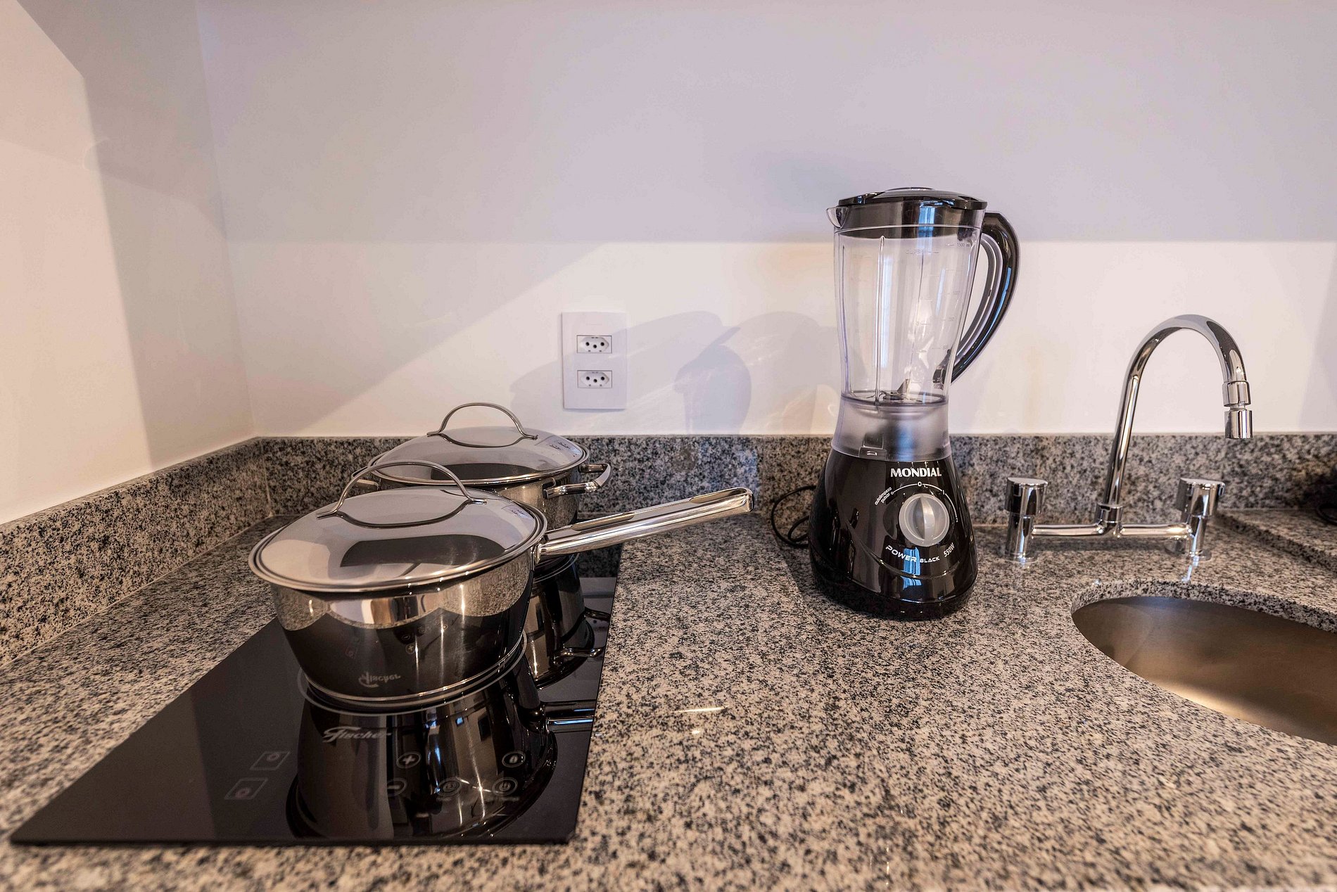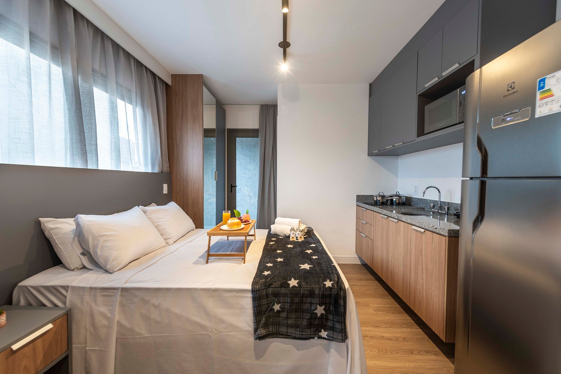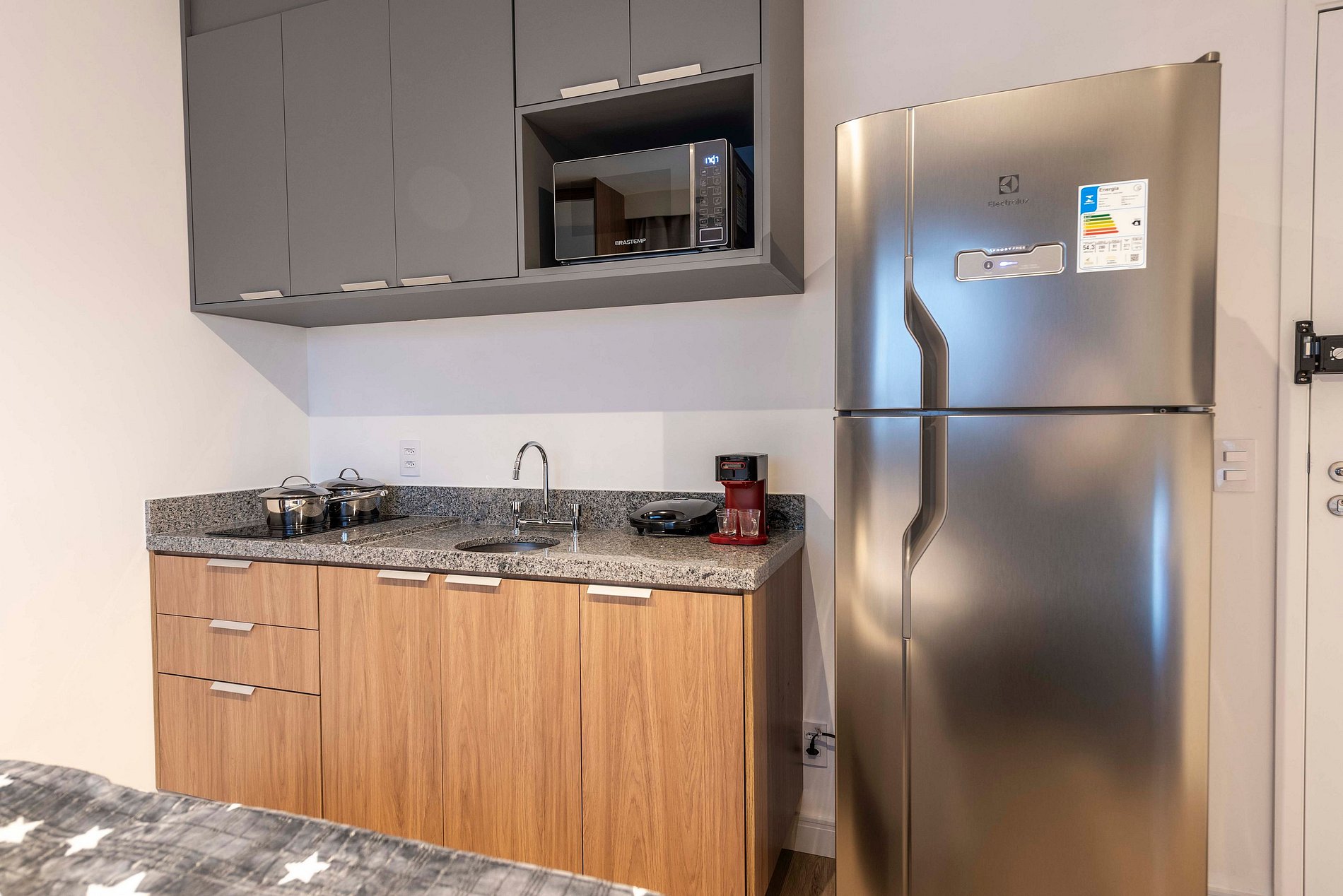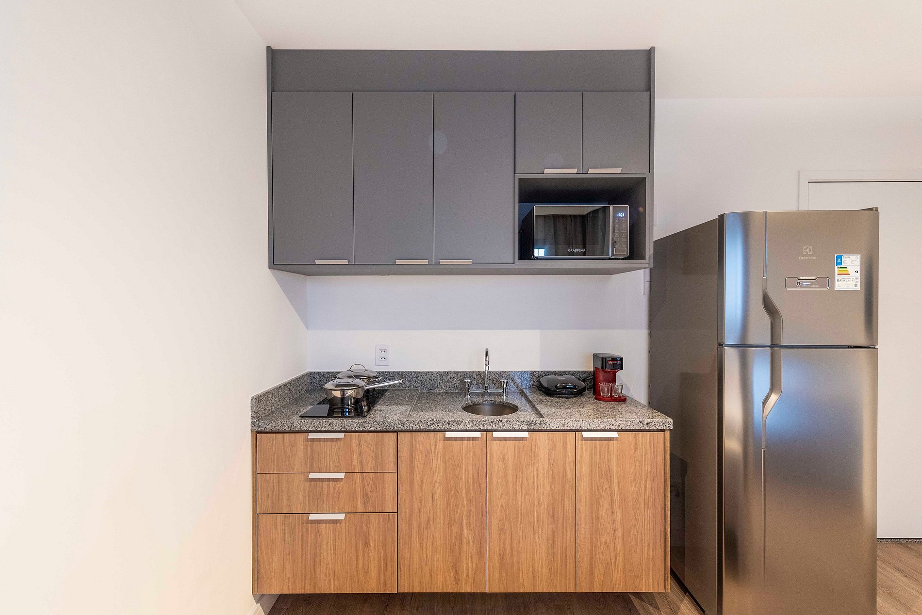 ・Cozinha completa: equipada com geladeira, fogão de indução, micro-ondas etc.