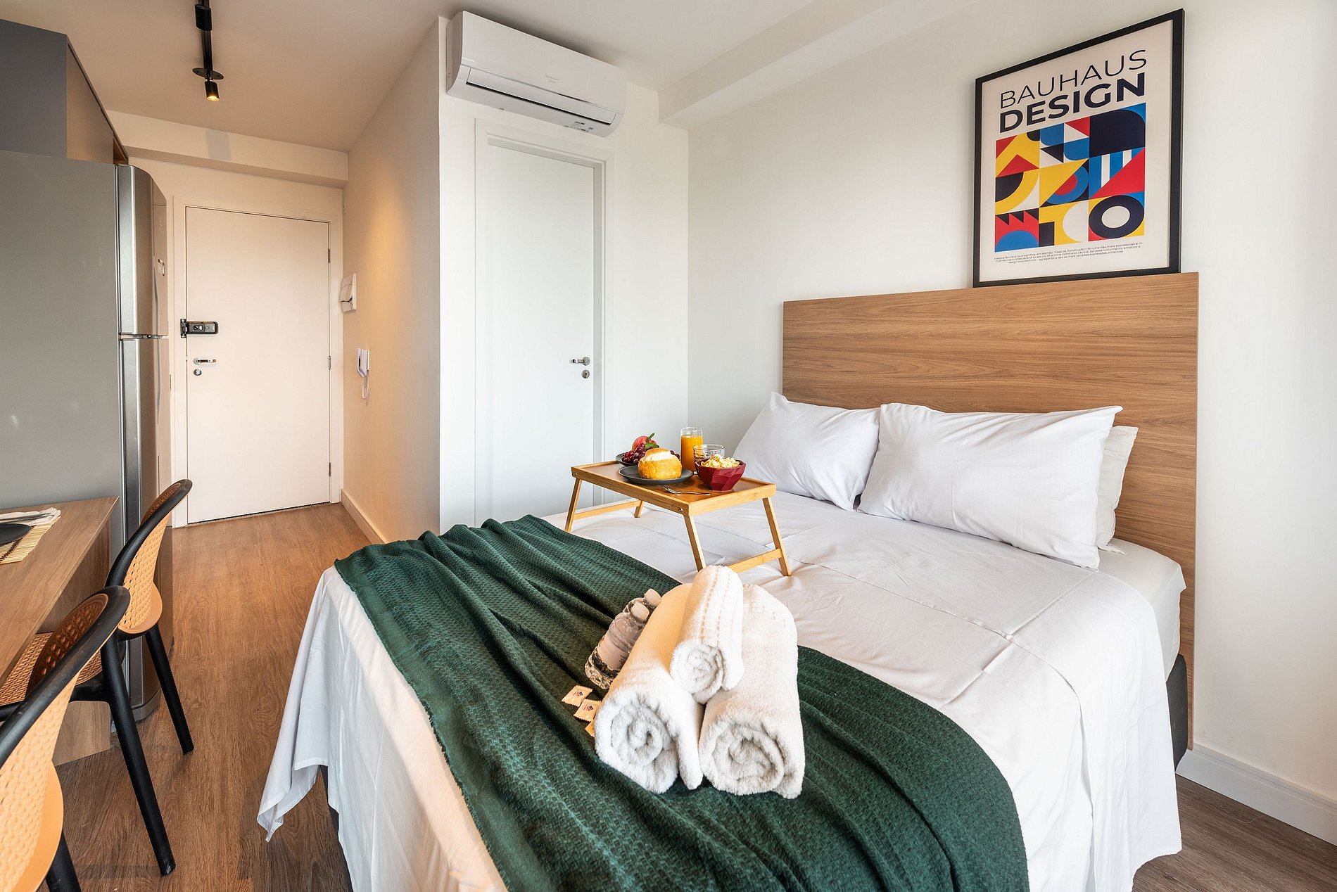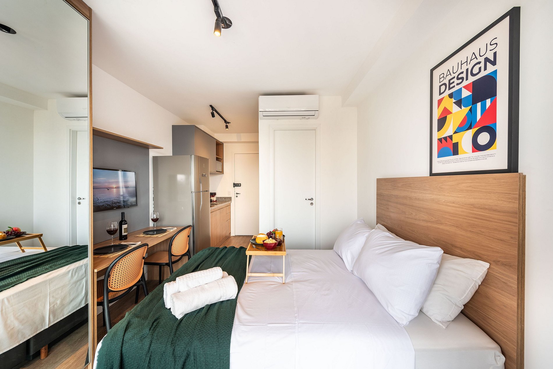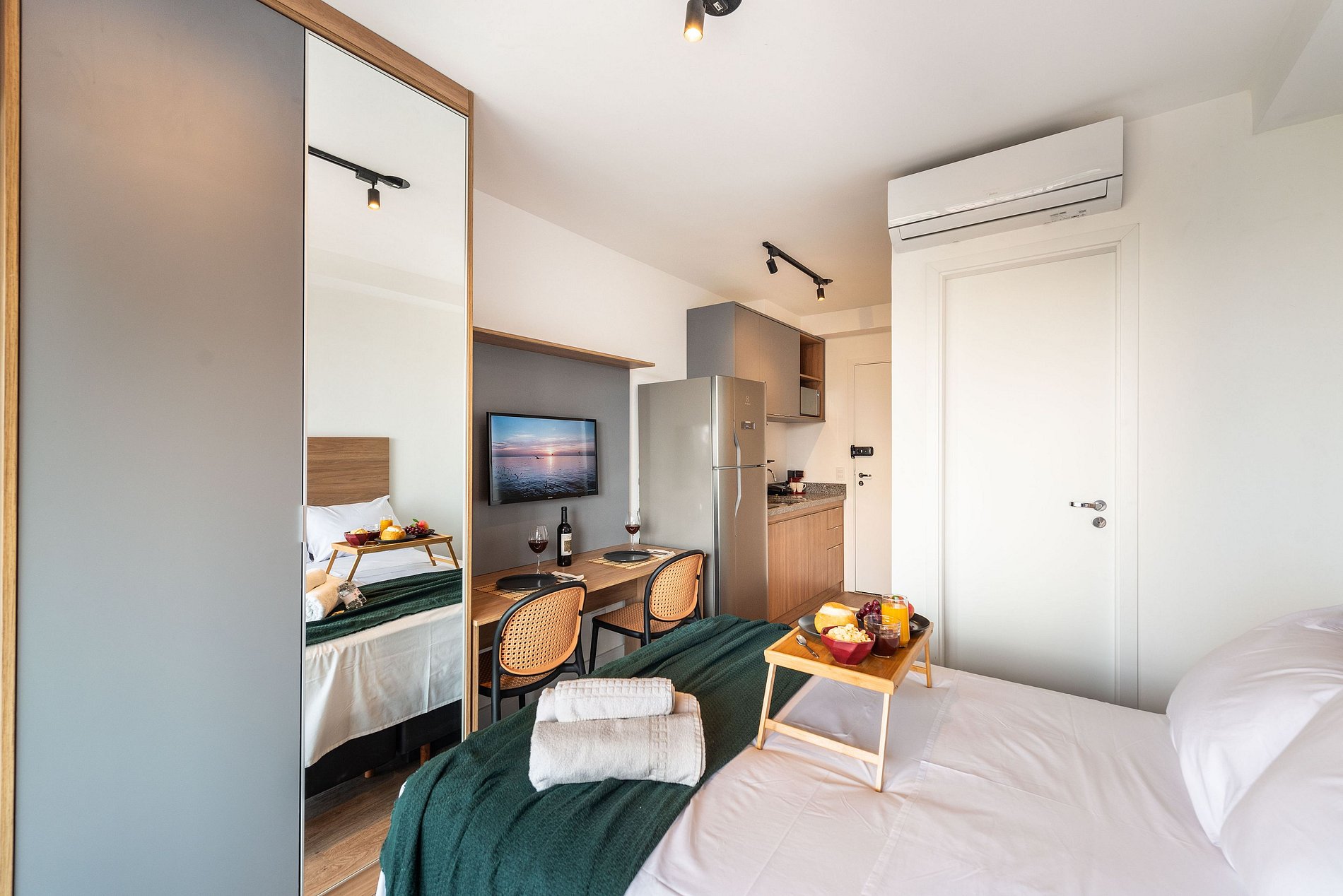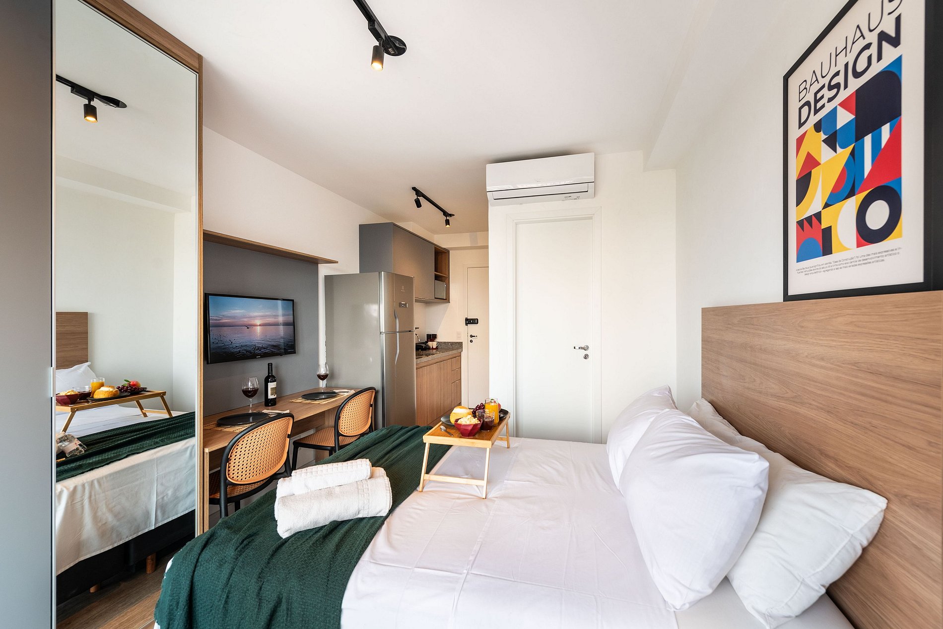 Desfrute de uma estadia confortável em um studio moderno, aconchegante e pensado para duas pessoas. O espaço é compacto e bem planejado, oferecendo cama confortável, sofá acolhedor, cozinha equipada com itens essenciais e banheiro funcional. Um ambiente organizado e convidativo, ideal para quem busca praticidade, conforto e uma experiência agradável durante a estadia.