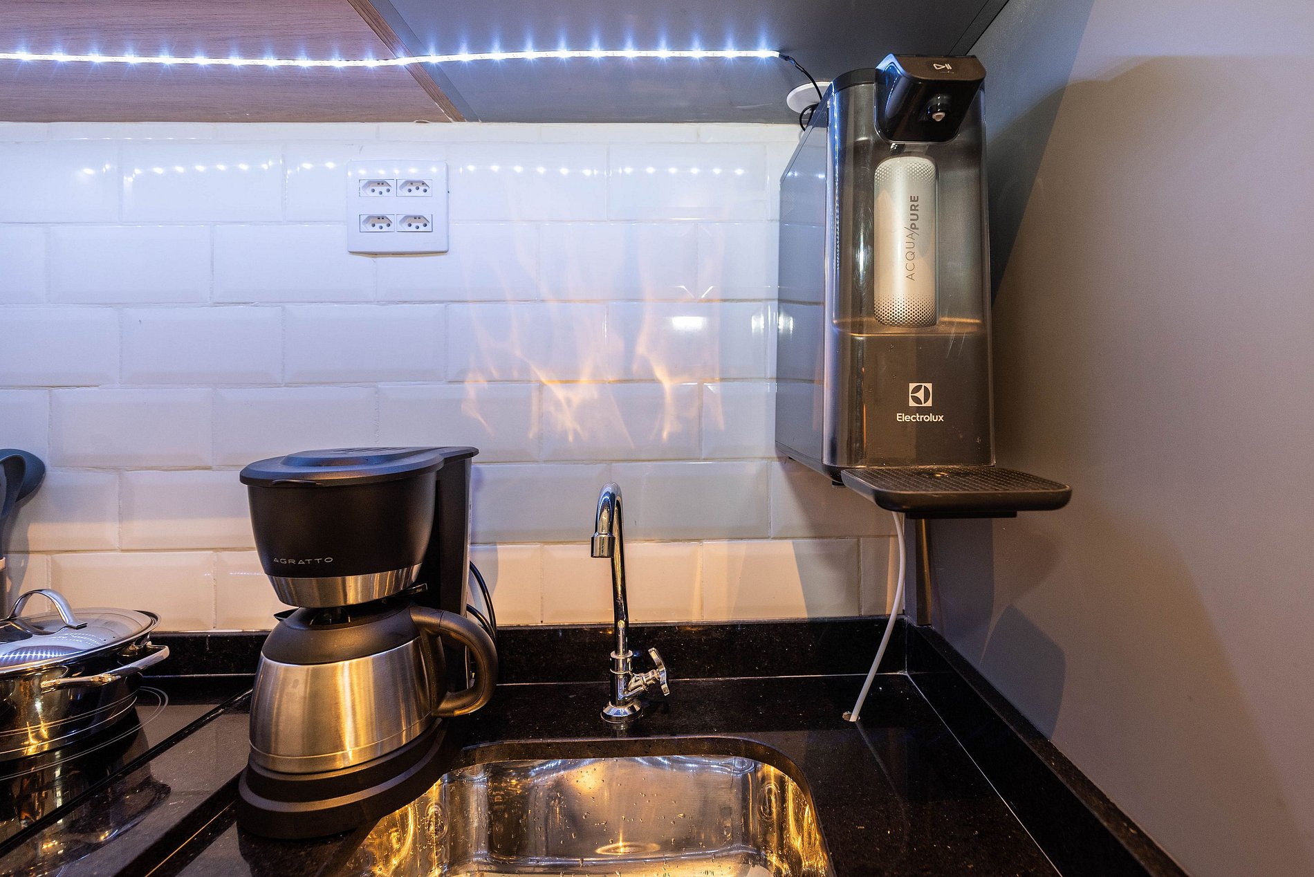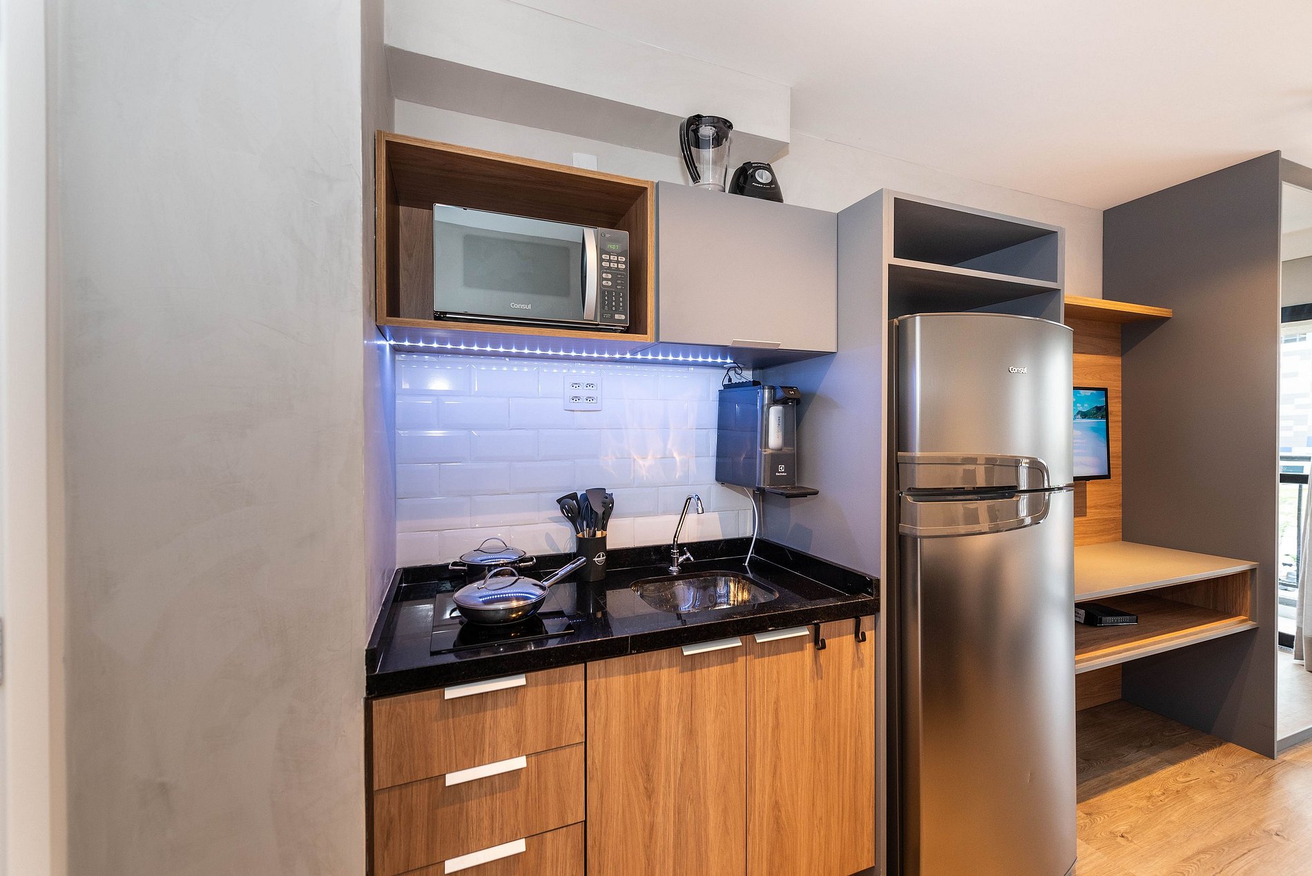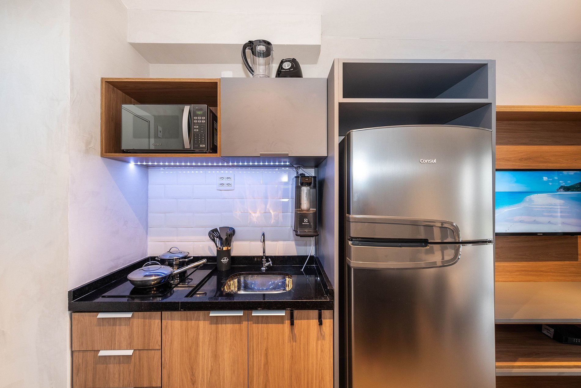 ・Cozinha completa com geladeira e cooktop, além de panelas