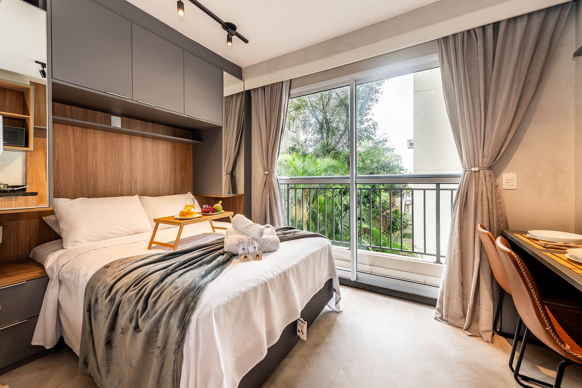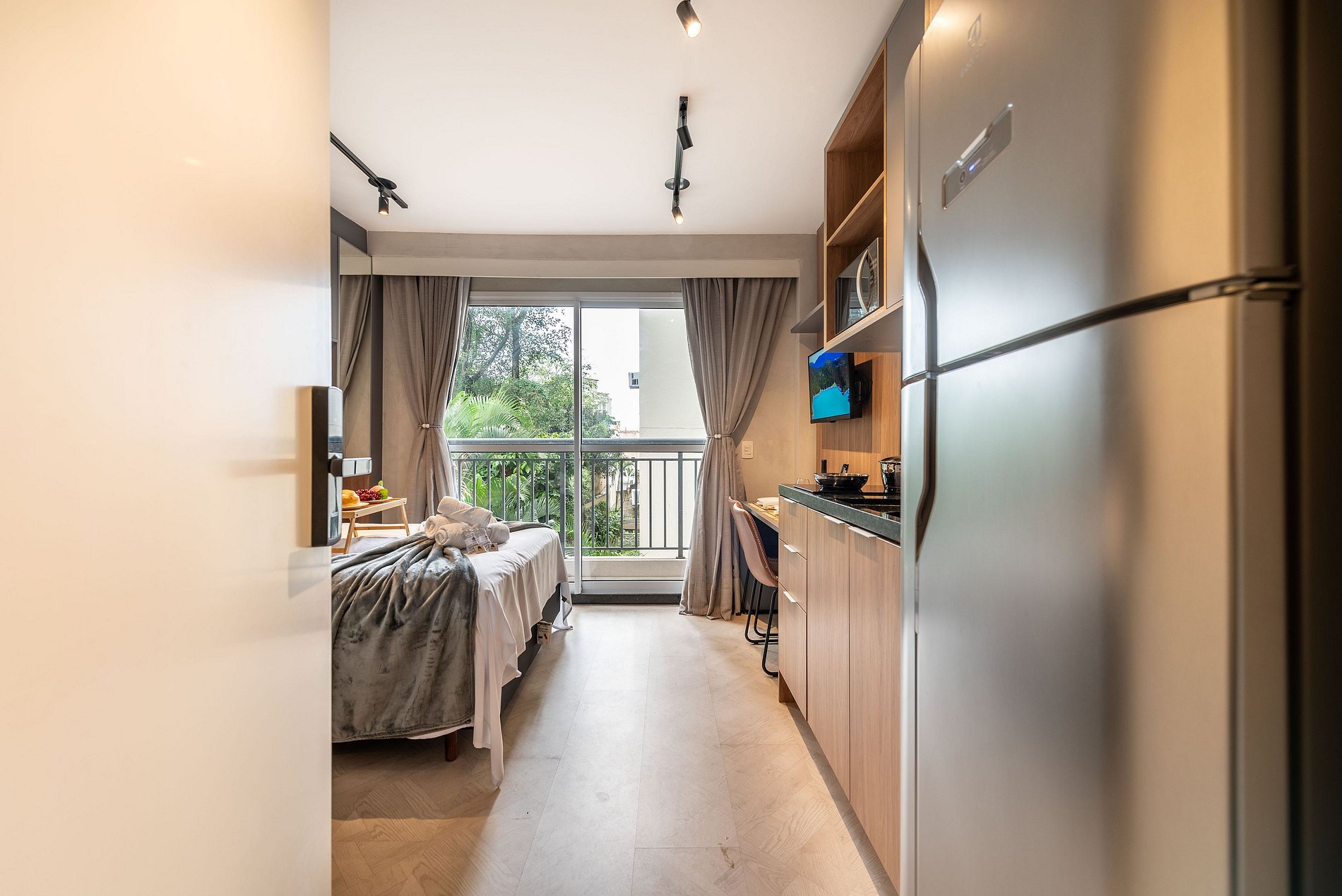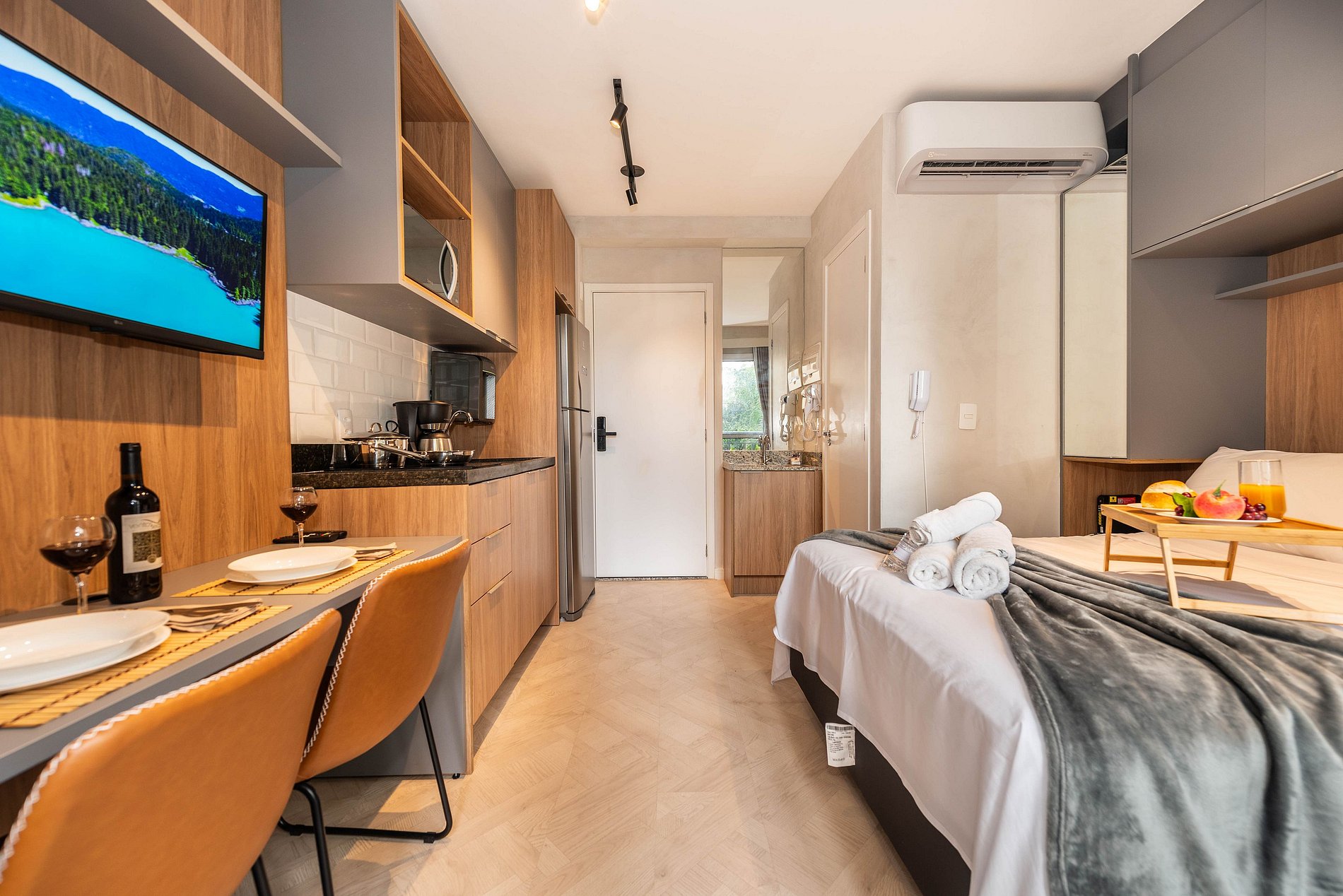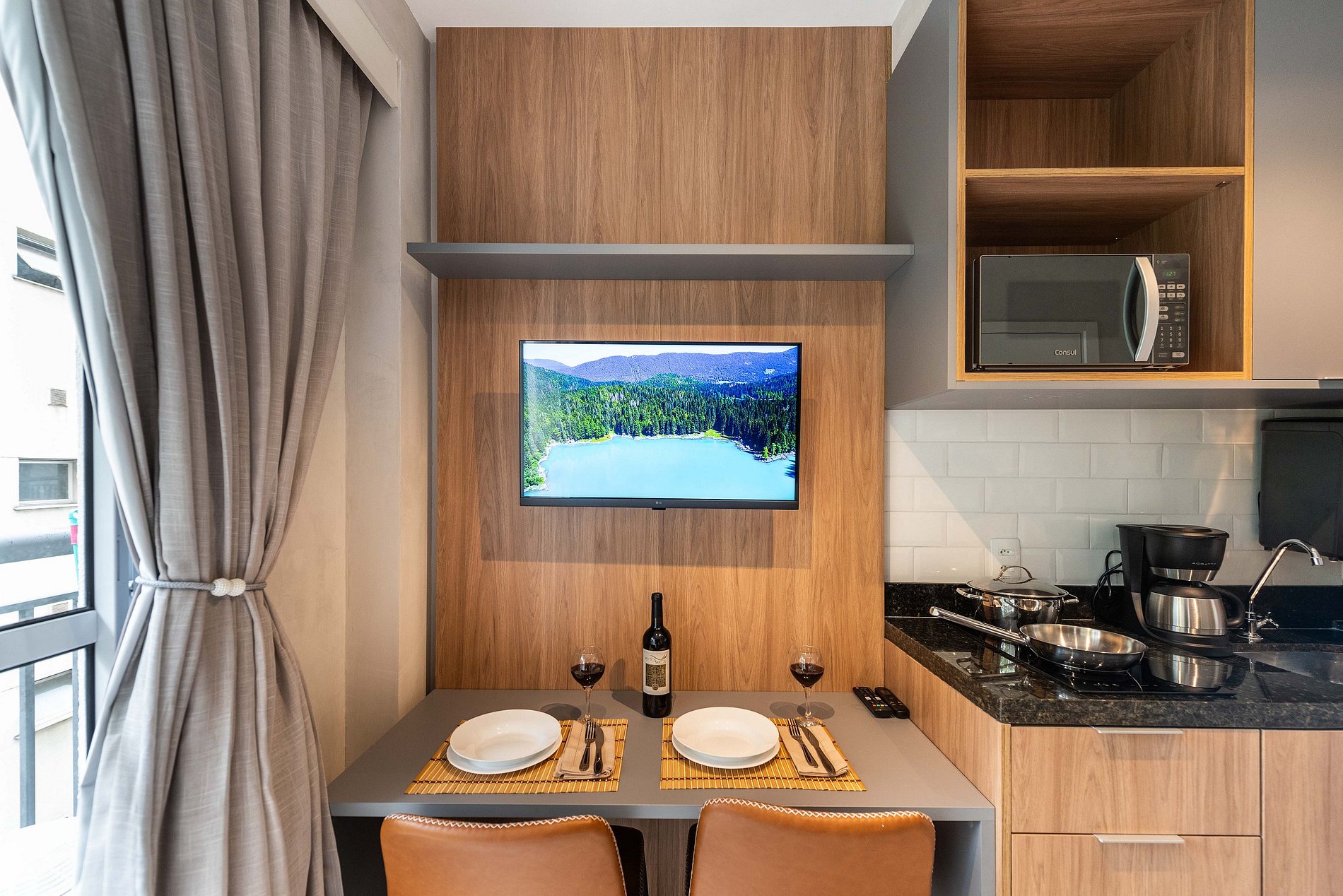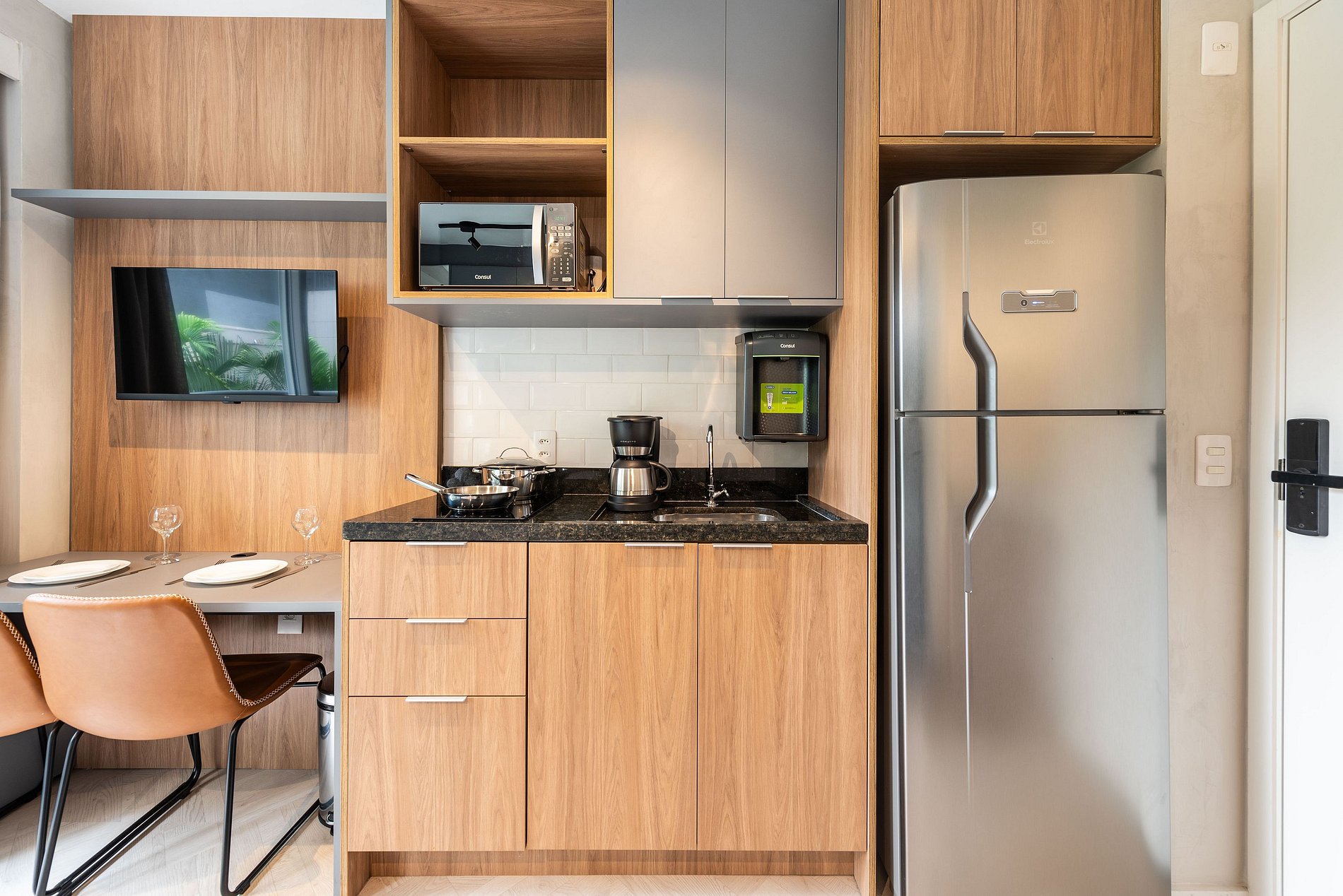 ・Cozinha completa: equipada com geladeira, fogão de indução, micro-ondas etc.