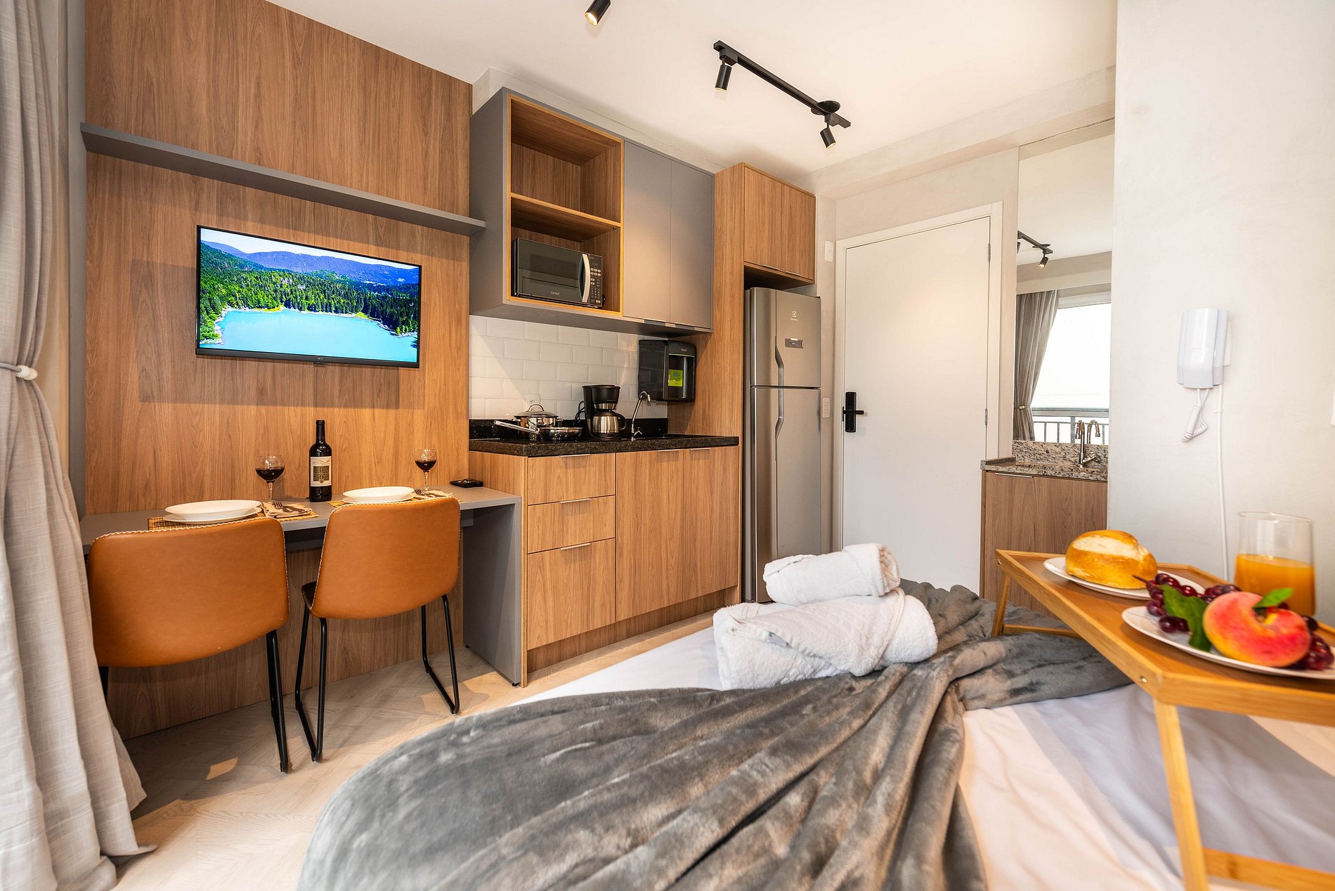 Studio acolhedor para duas pessoas, equipado com tudo o necessário para uma estadia confortável. Dispõe de cama aconchegante, cozinha funcional e banheiro prático. Ideal para quem busca simplicidade e conveniência em uma excelente localização.