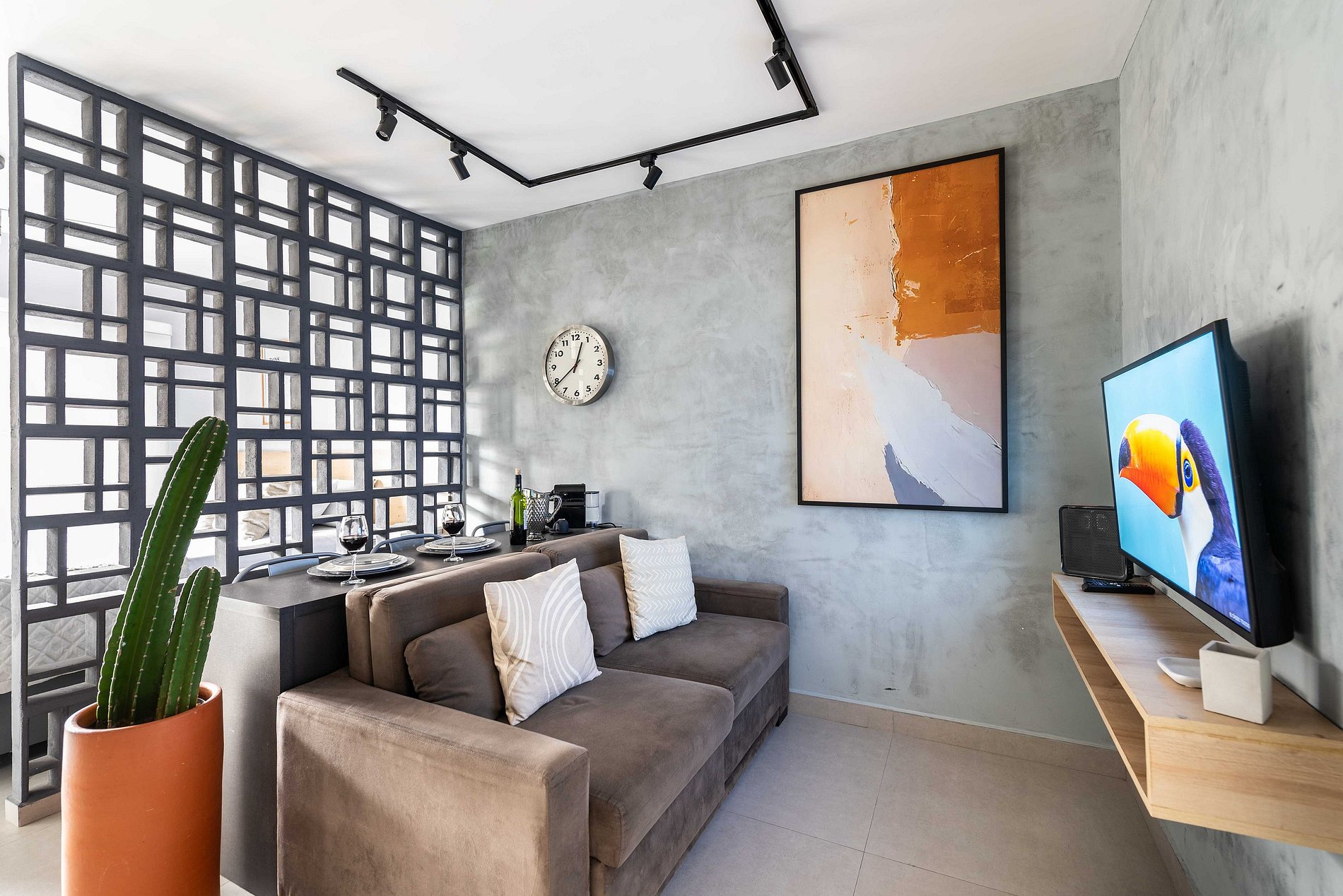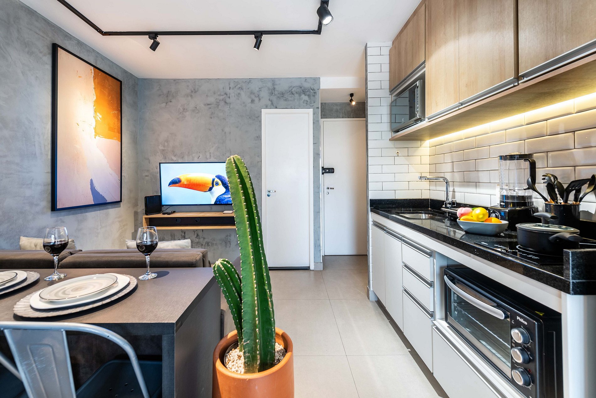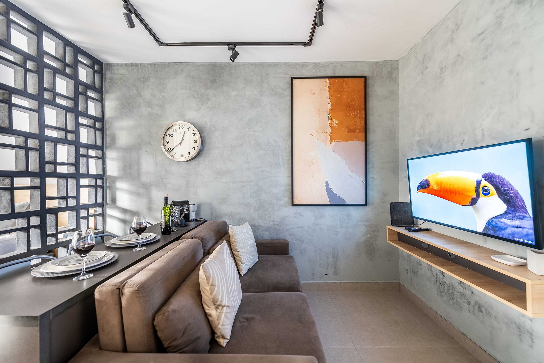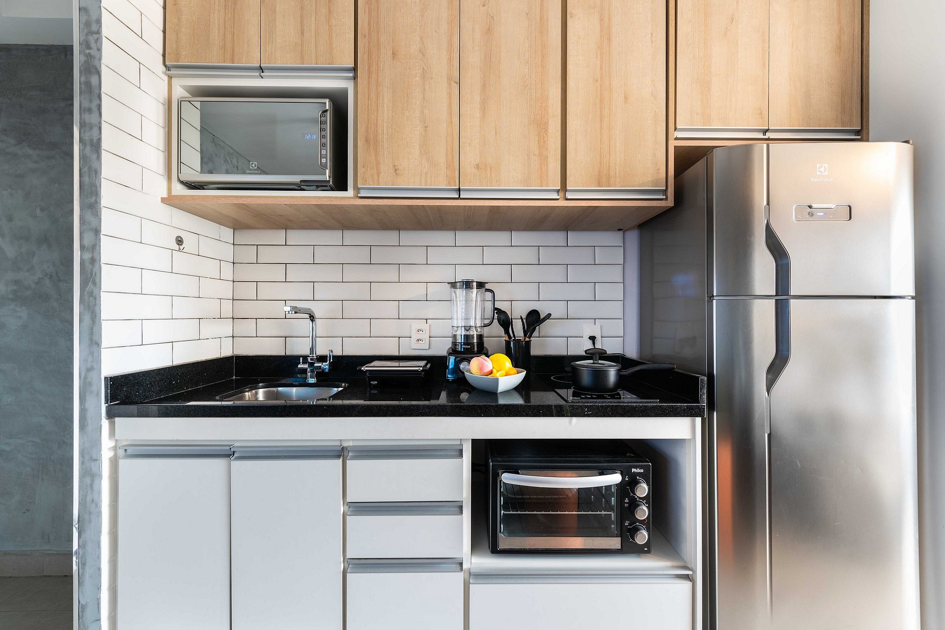 Nosso estúdio funcional acomoda até 4 pessoas. Este espaço inteligente oferece comodidades modernas para uma estadia confortável. Com uma área integrada que inclui uma cozinha completa, área de estar e dormir, este estúdio é perfeito para quem procura praticidade e conforto durante sua estadia na cidade.