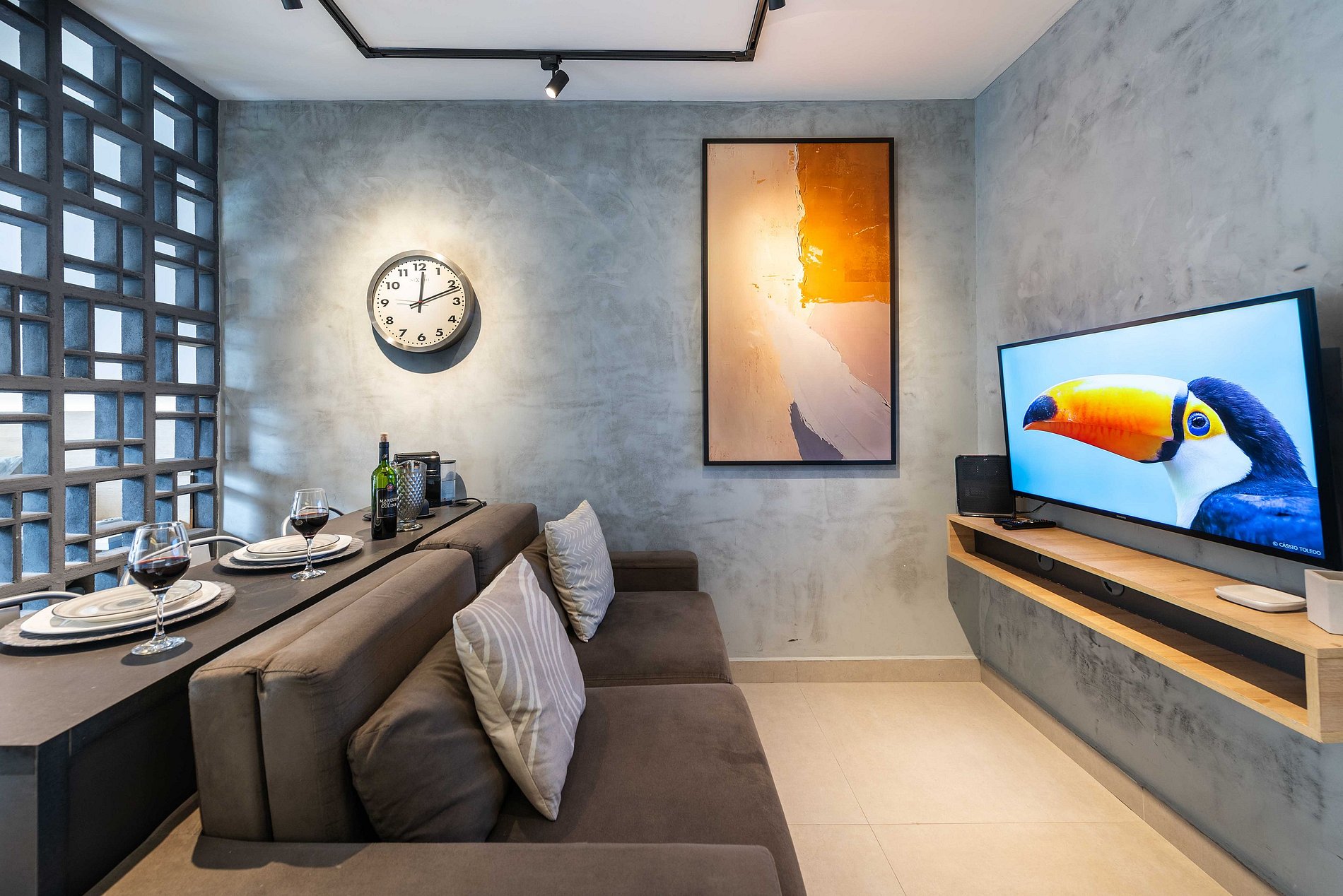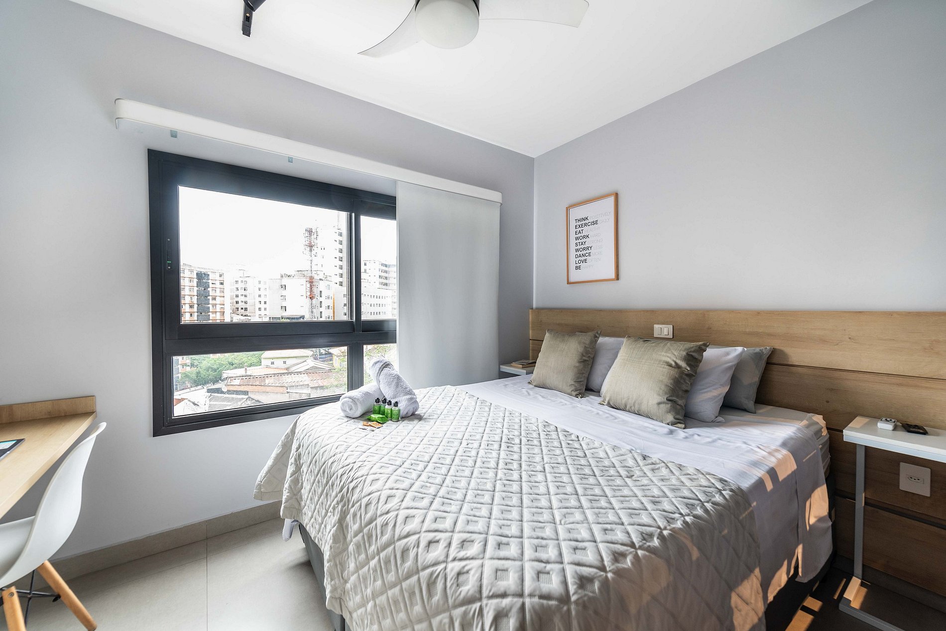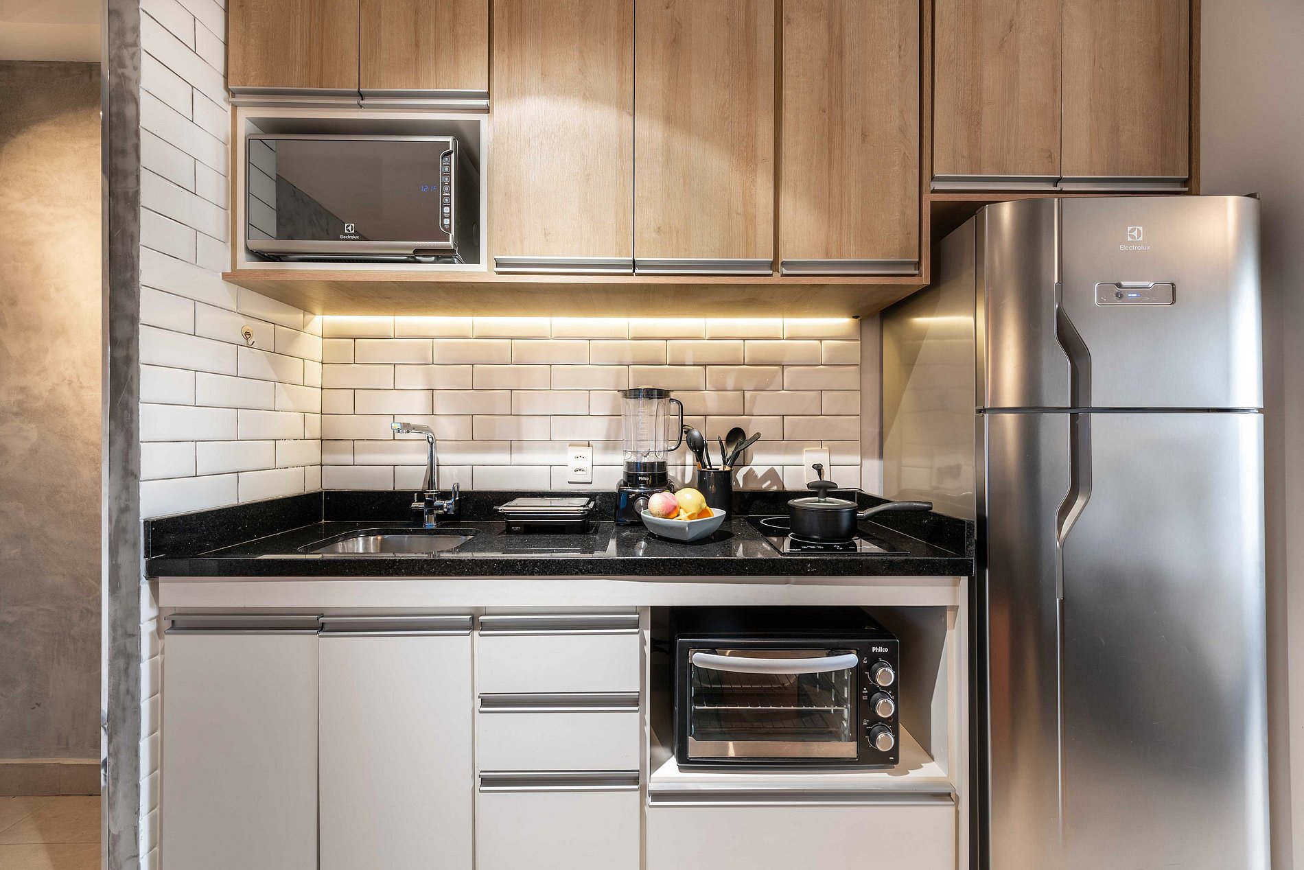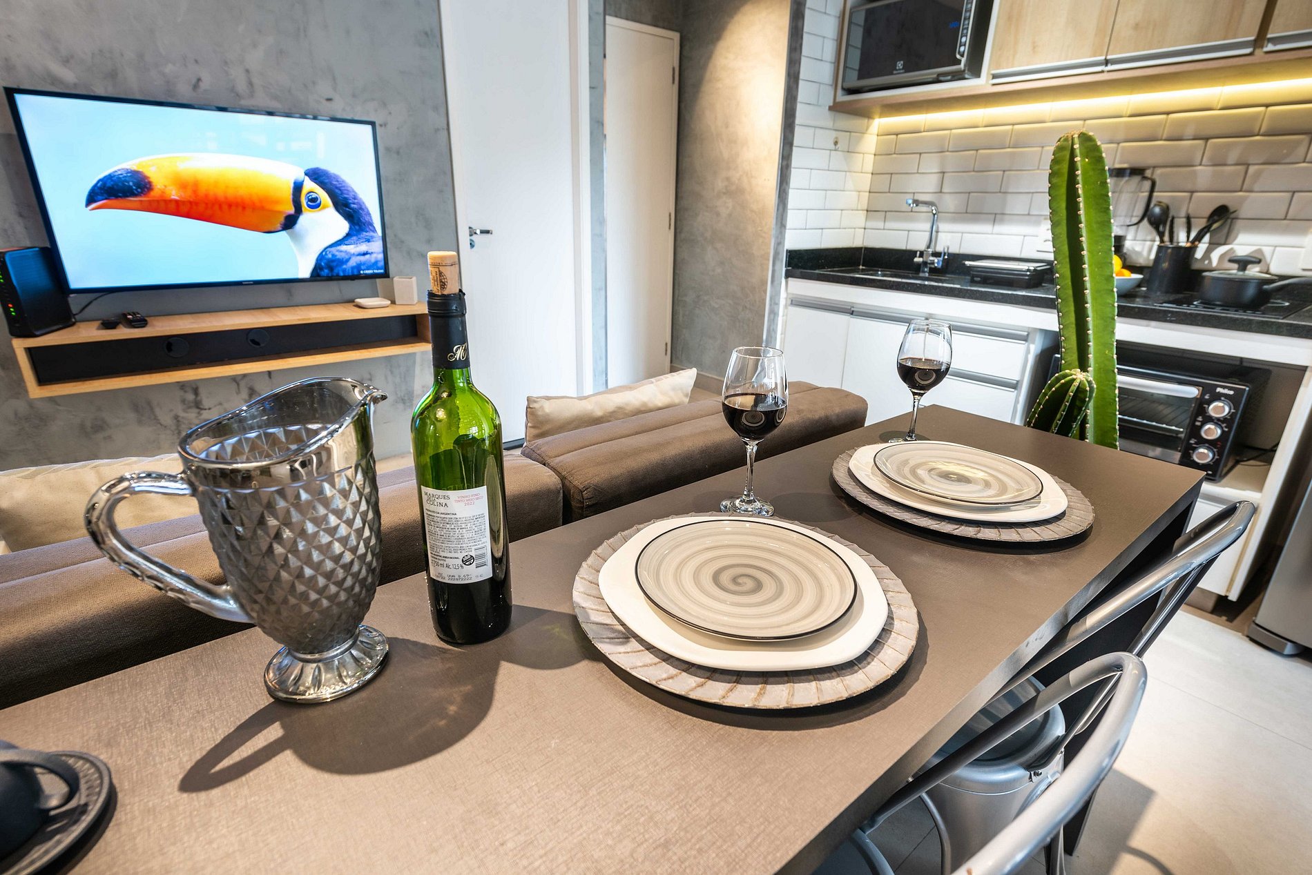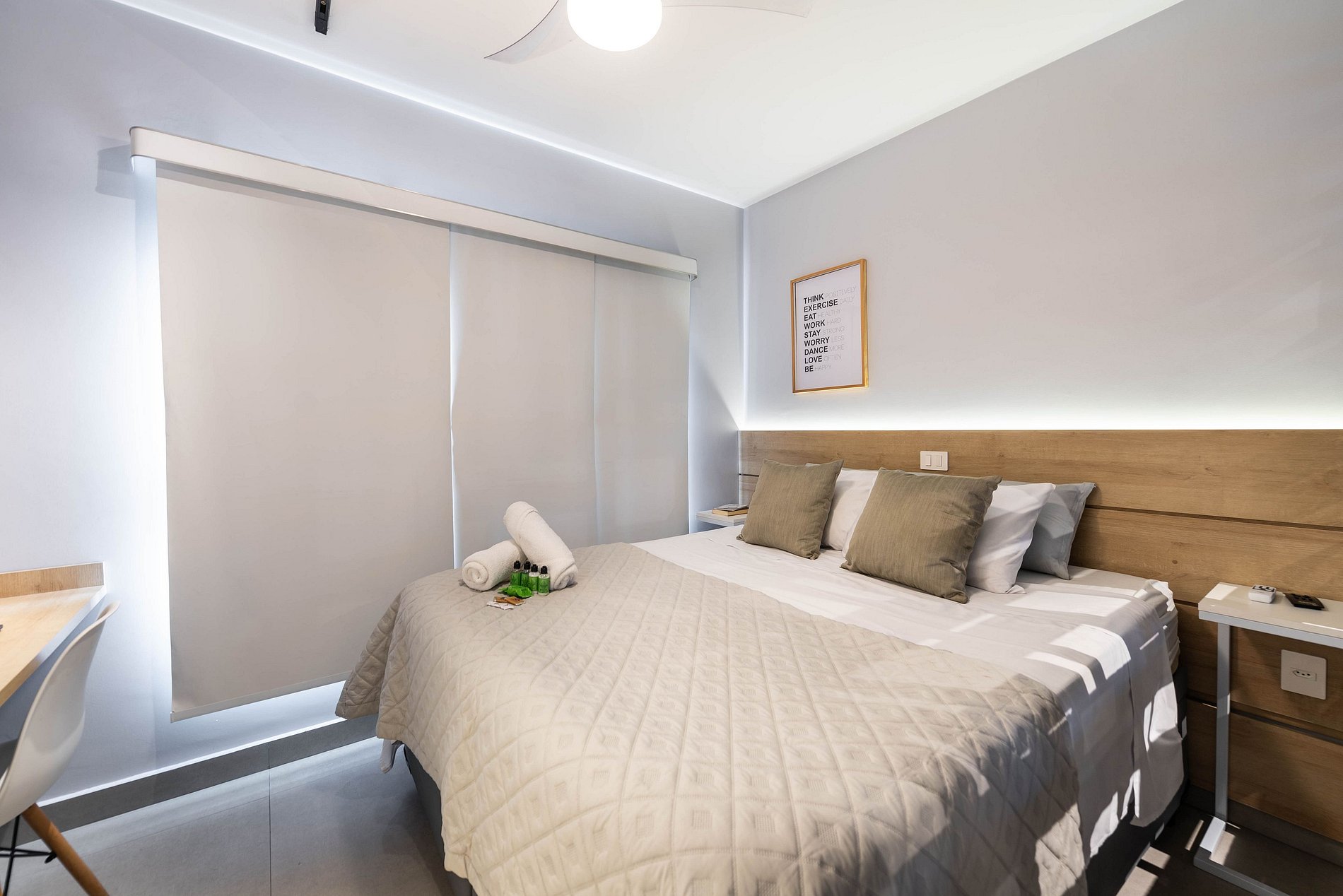 Nosso estúdio funcional acomoda até 4 pessoas. Este espaço inteligente oferece comodidades modernas para uma estadia confortável. Com uma área integrada que inclui uma cozinha completa, área de estar e dormir, este estúdio é perfeito para quem procura praticidade e conforto durante sua estadia na cidade.