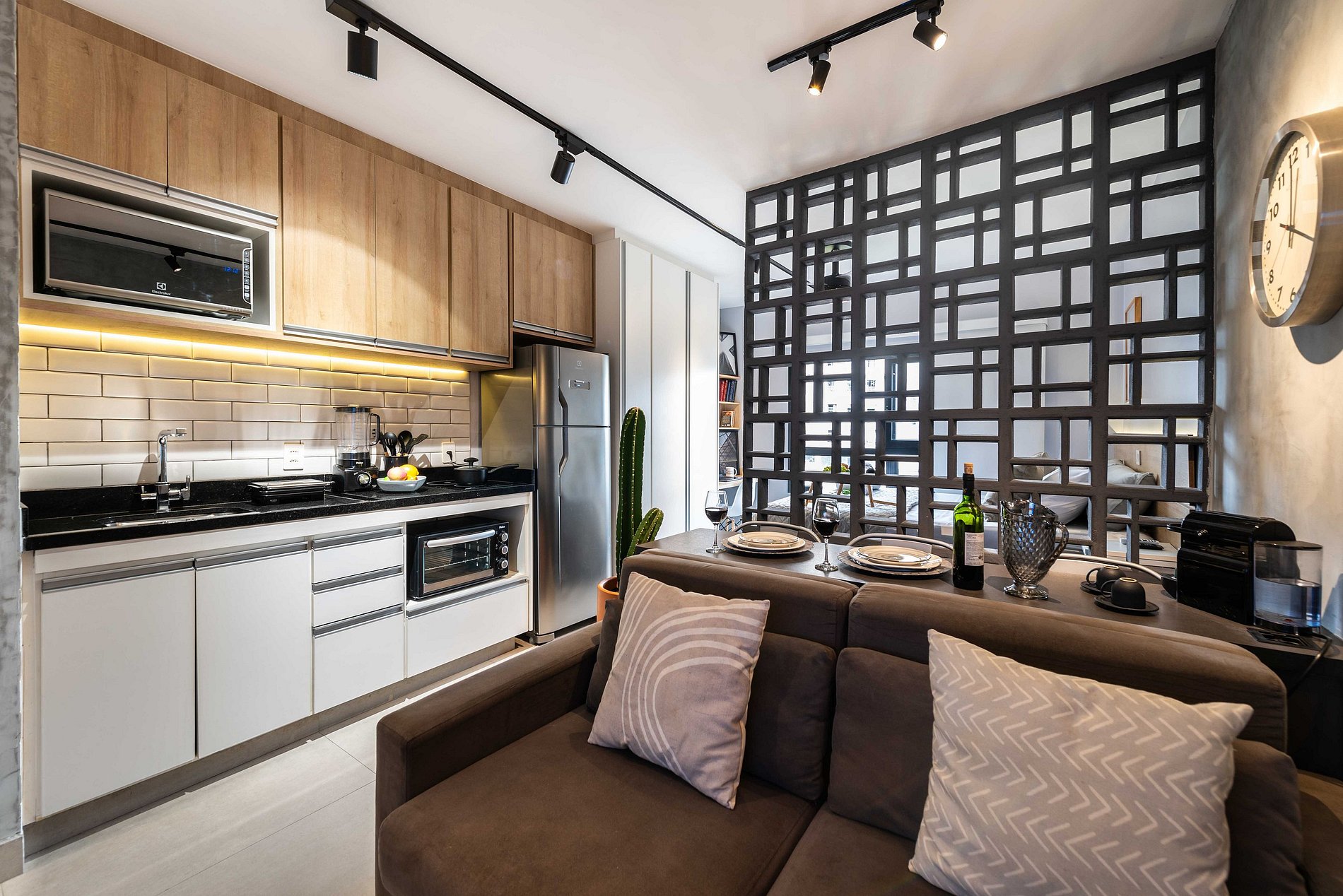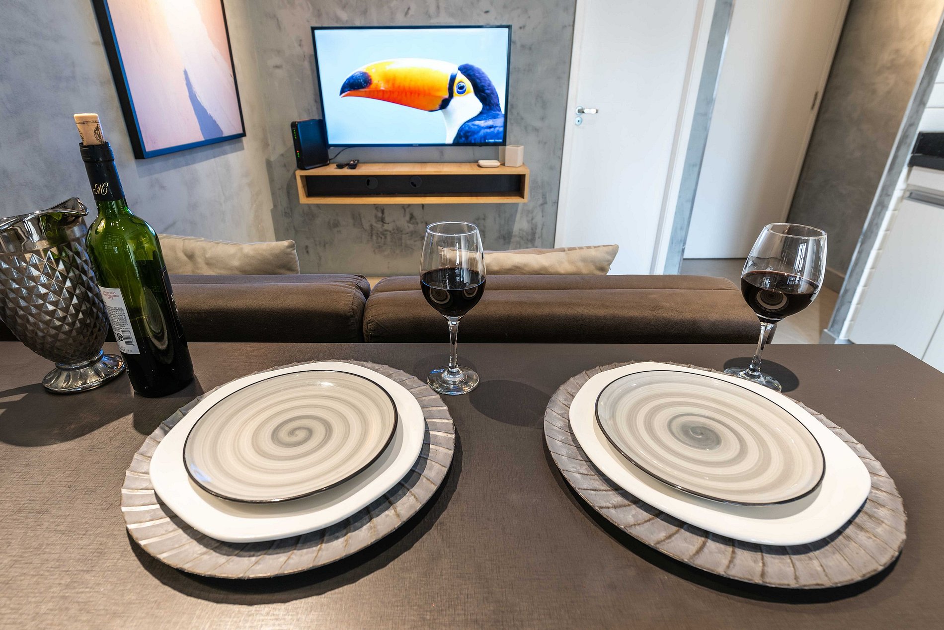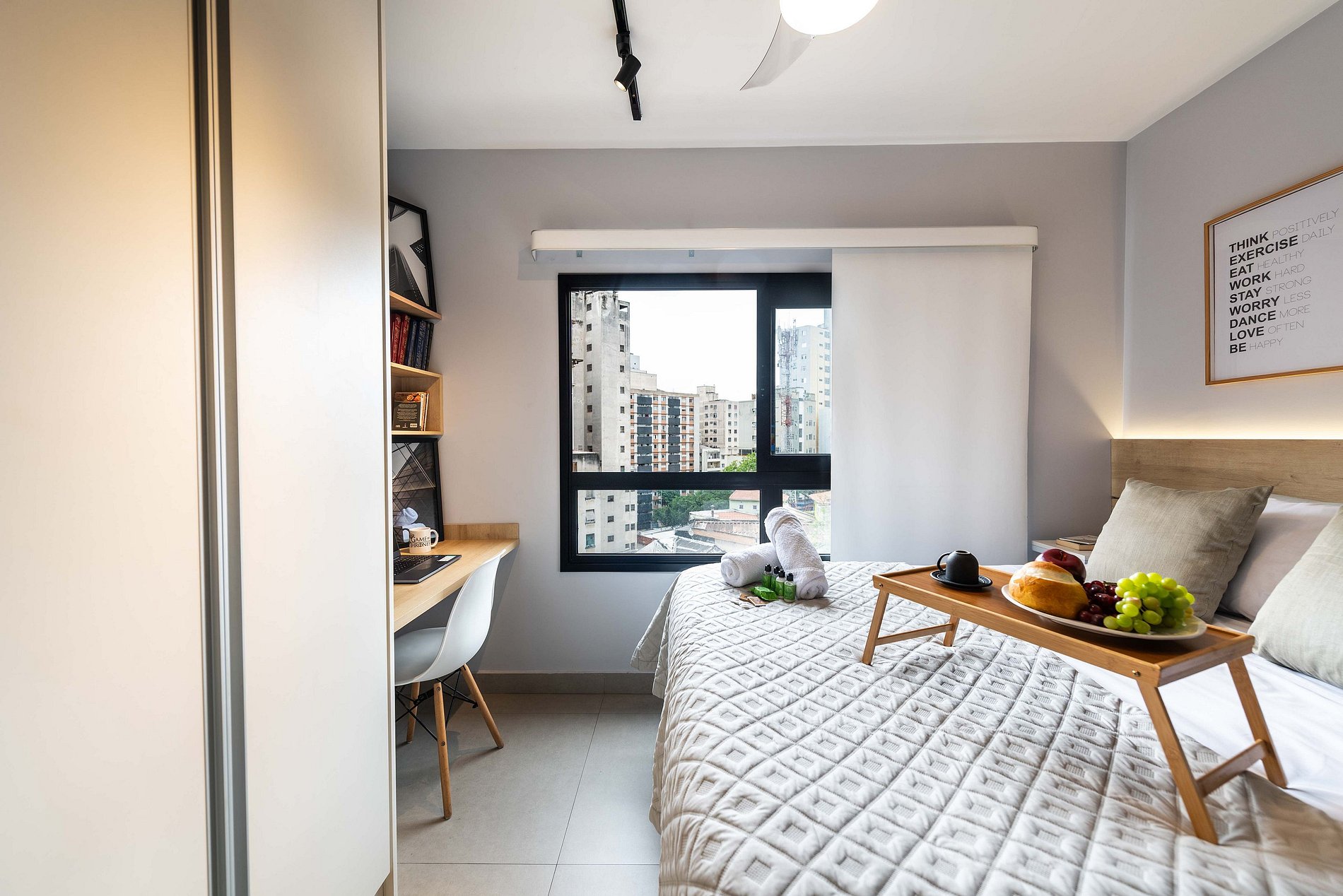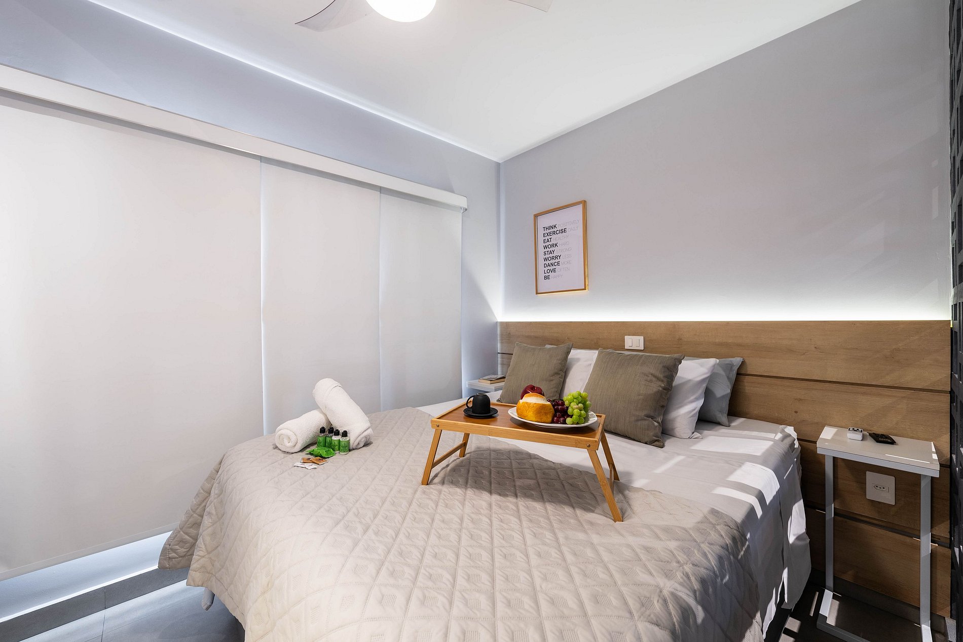 Nosso estúdio funcional acomoda até 4 pessoas. Este espaço inteligente oferece comodidades modernas para uma estadia confortável. Com uma área integrada que inclui uma cozinha completa, área de estar e dormir, este estúdio é perfeito para quem procura praticidade e conforto durante sua estadia na cidade.