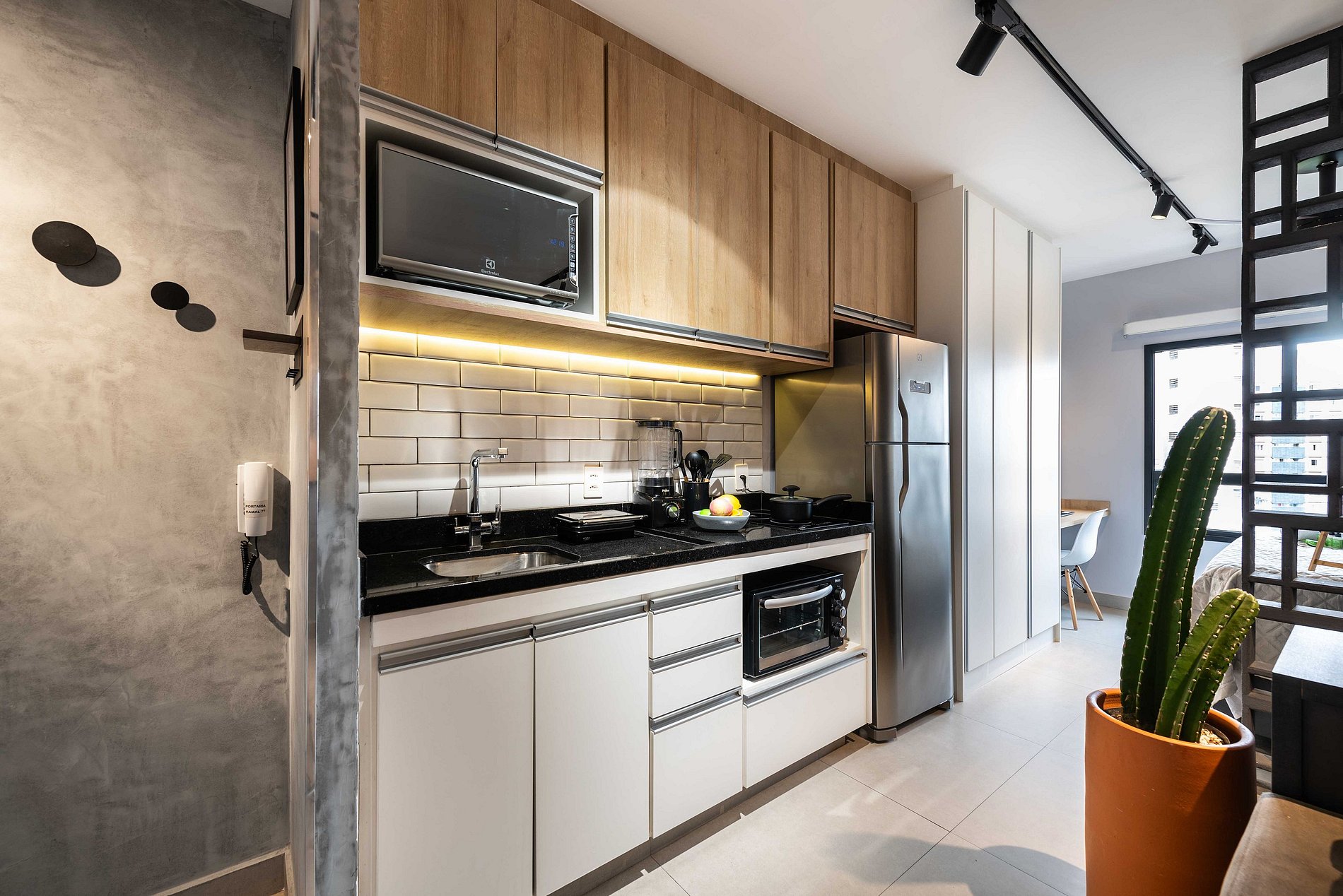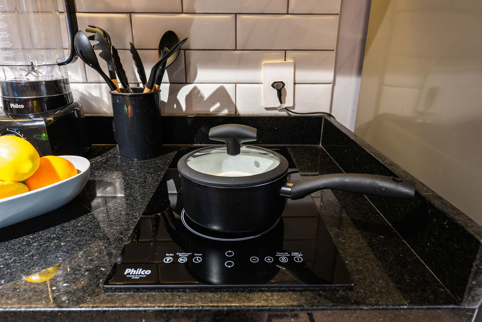 ・Cozinha completa: equipada com geladeira, fogão de indução, micro-ondas etc.