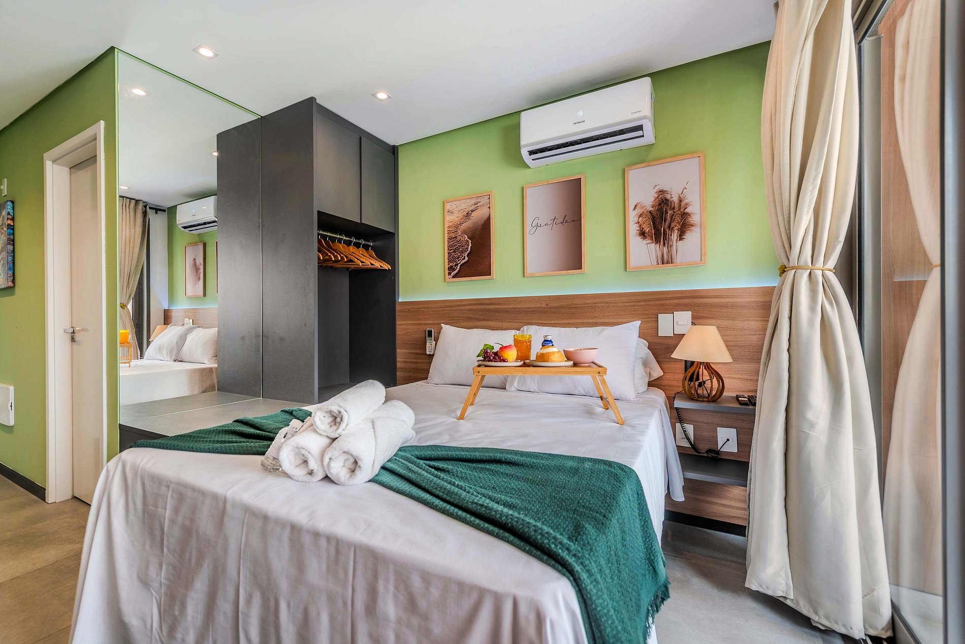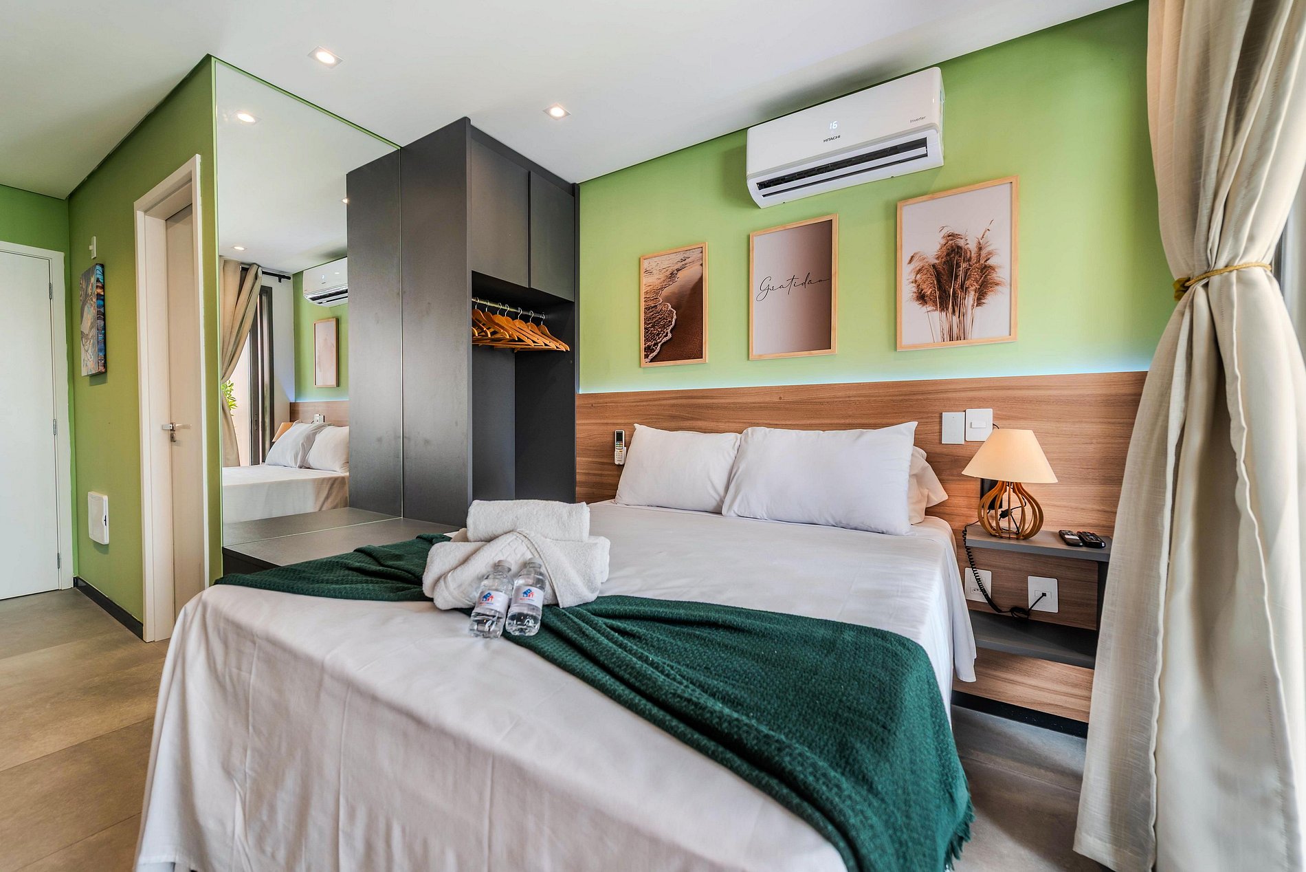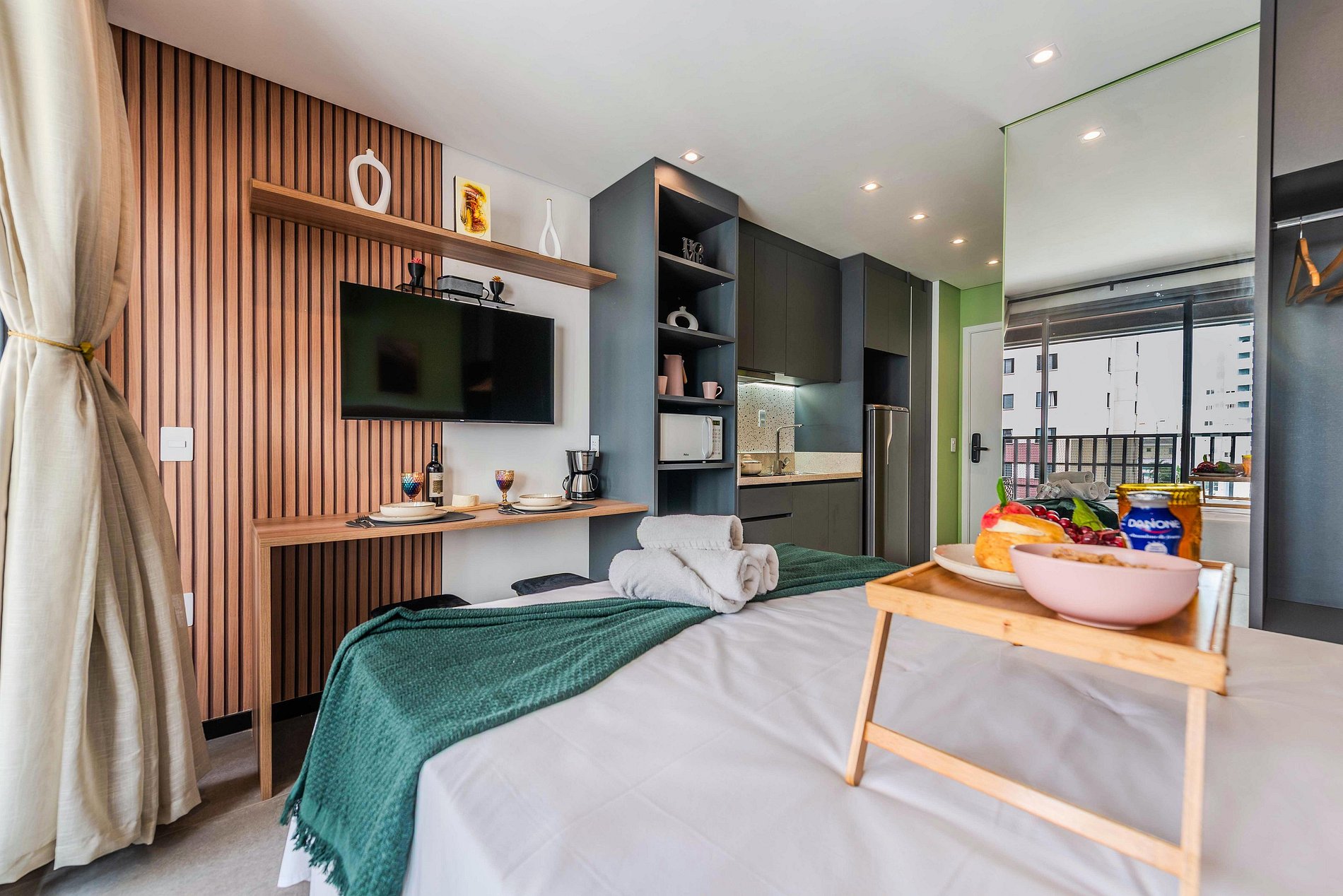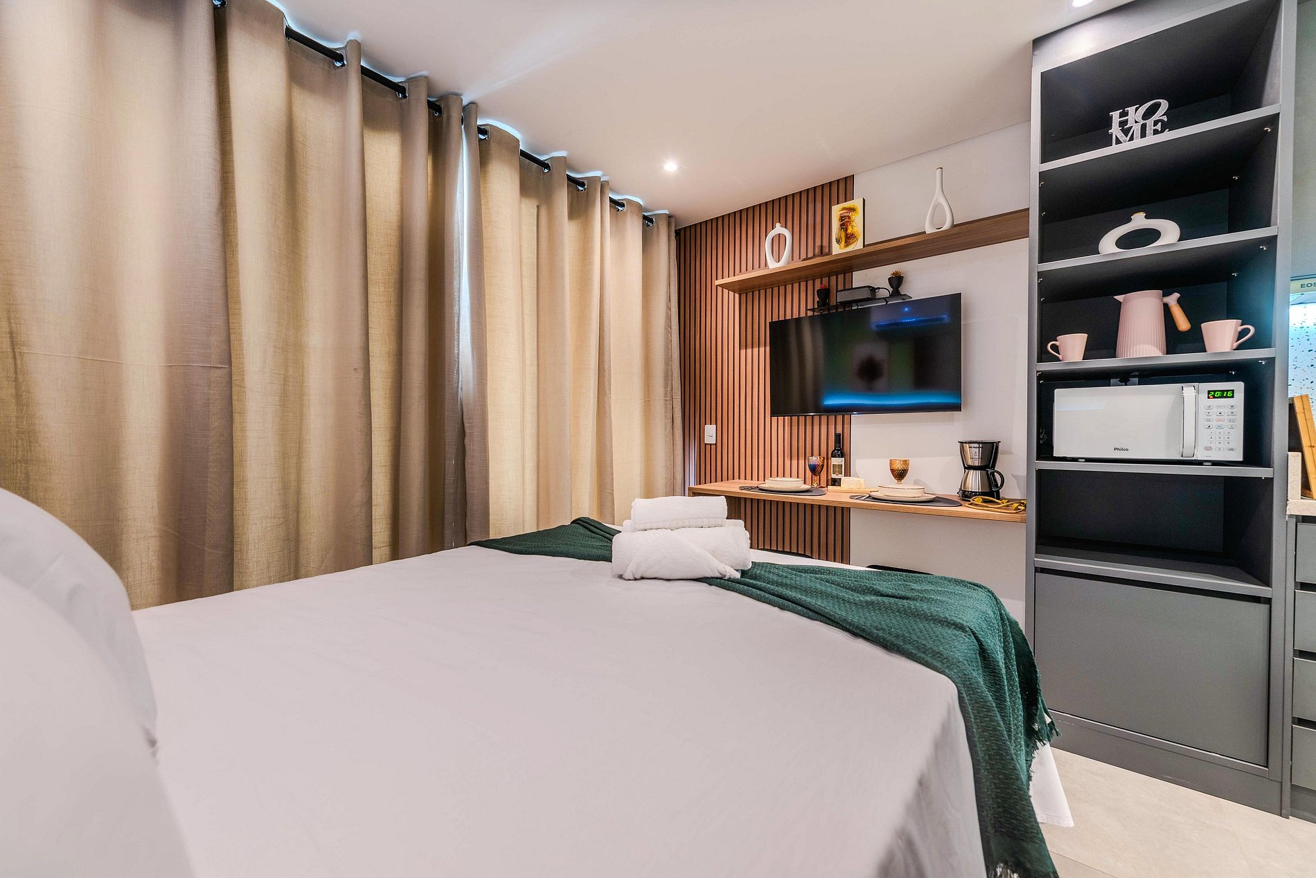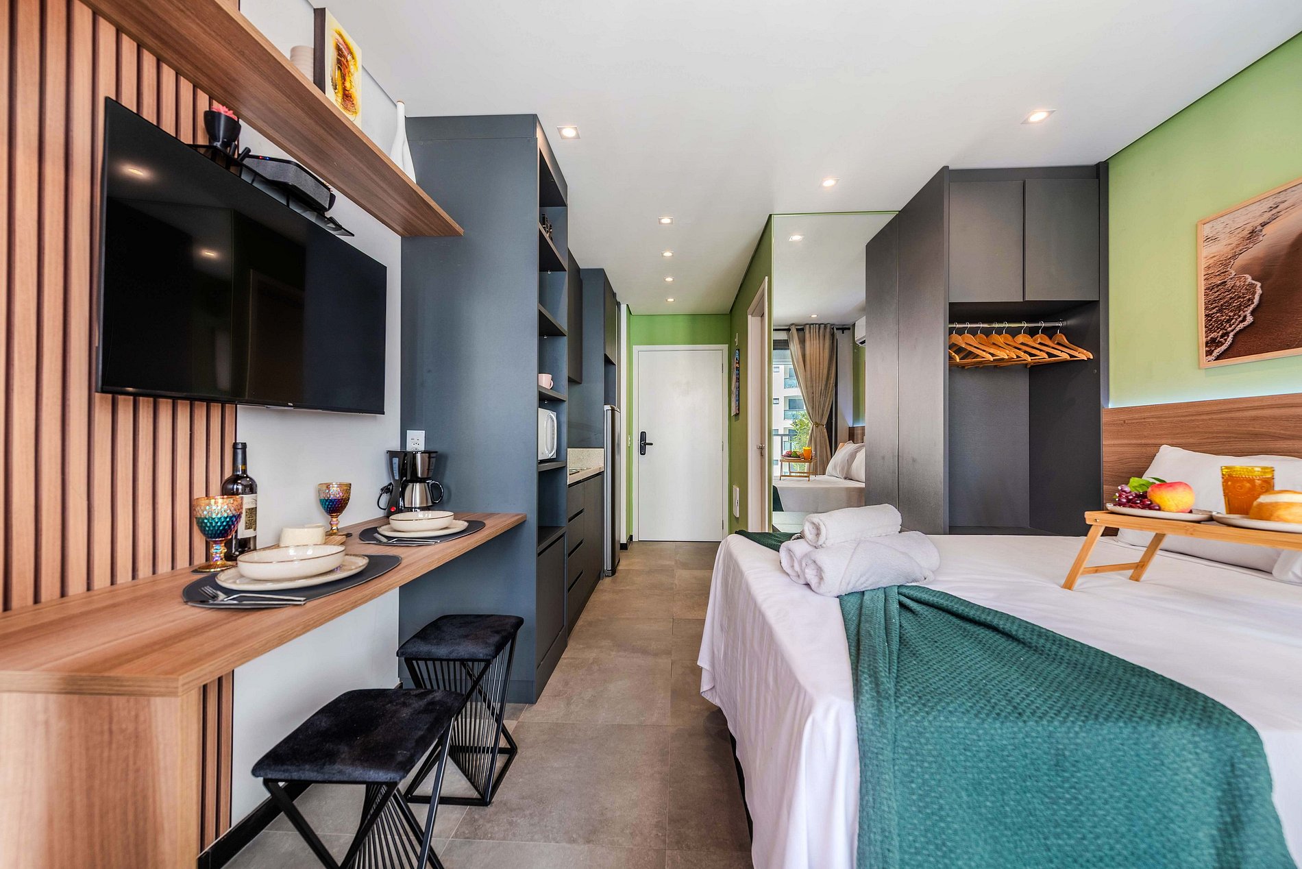 Studio compacto e aconchegante, ideal para duas pessoas. Conta com uma cama confortável, cozinha equipada com utensílios básicos e um banheiro privativo. Ambiente funcional e bem distribuído, perfeito para uma estadia prática e confortável.