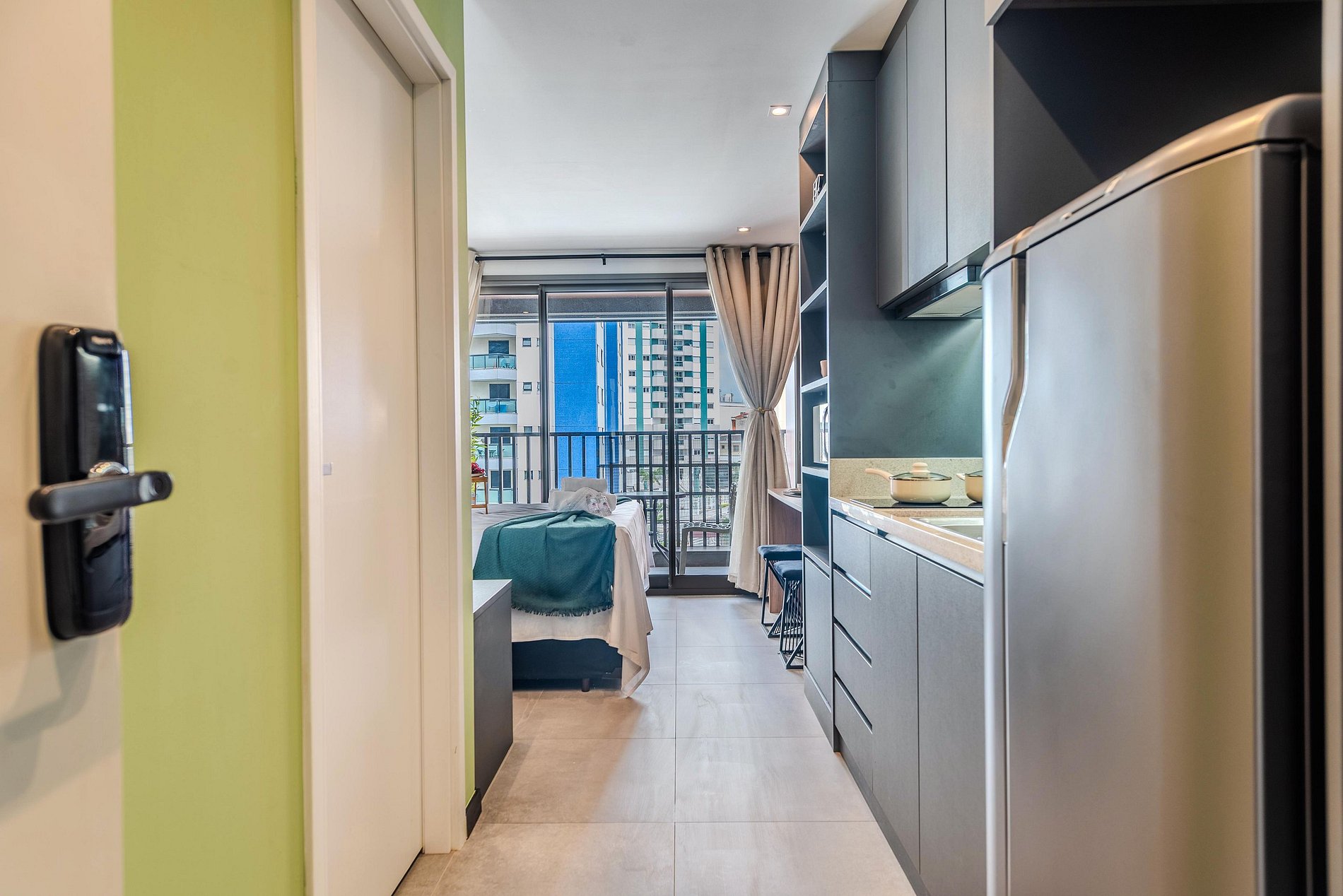 A entrada é realizada através de uma fechadura eletrônica, garantindo acesso total tanto ao apartamento quanto às comodidades do prédio.