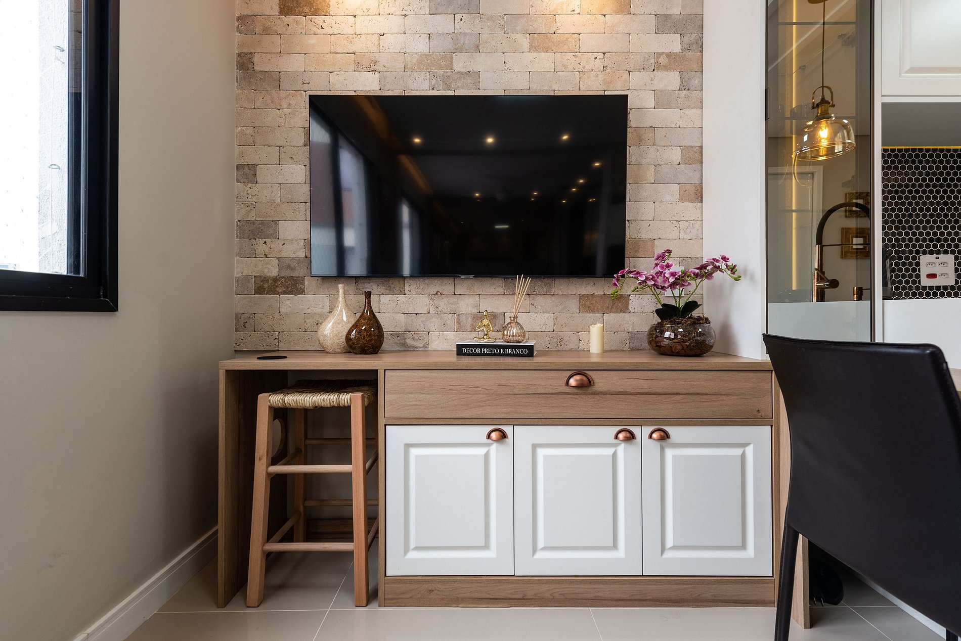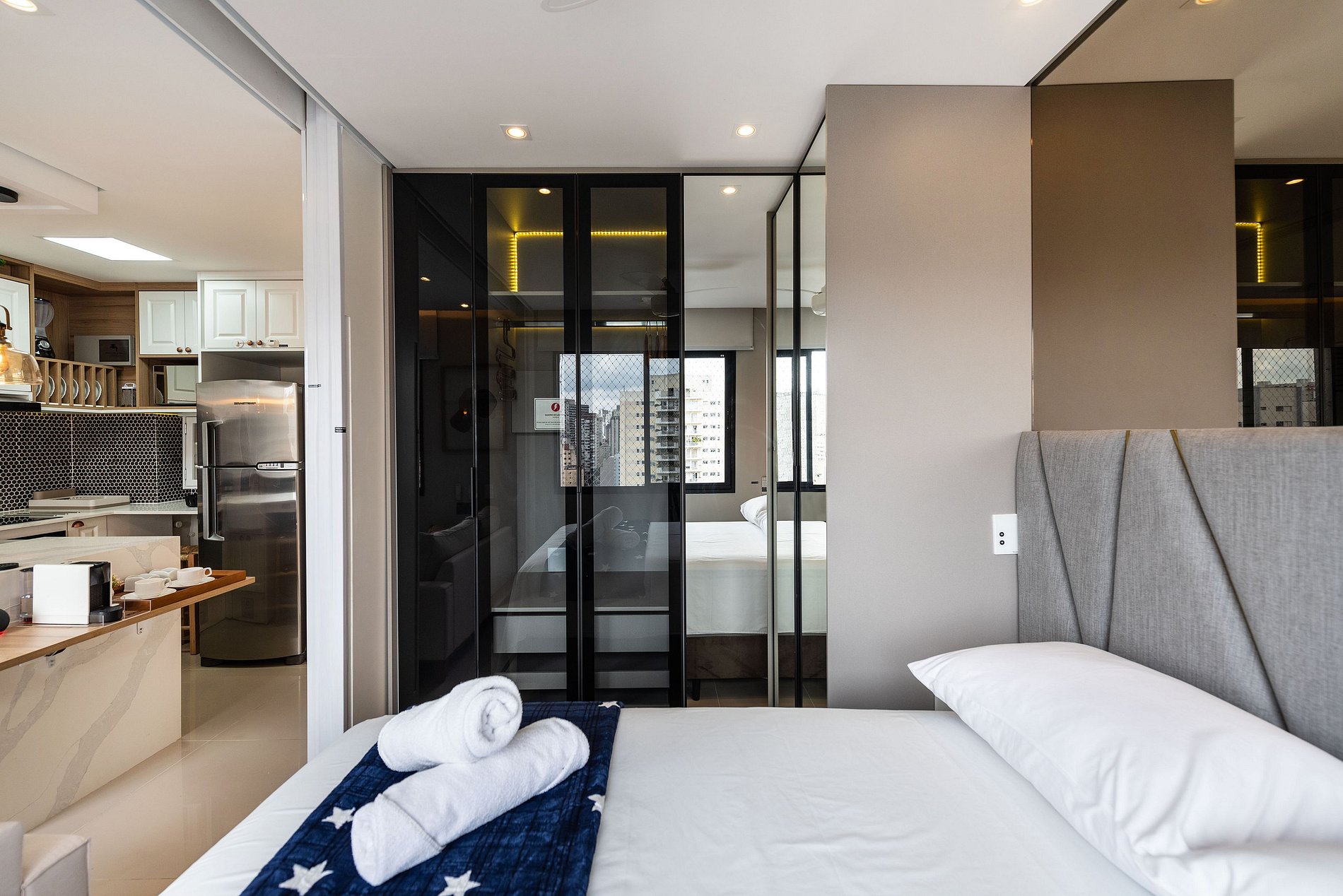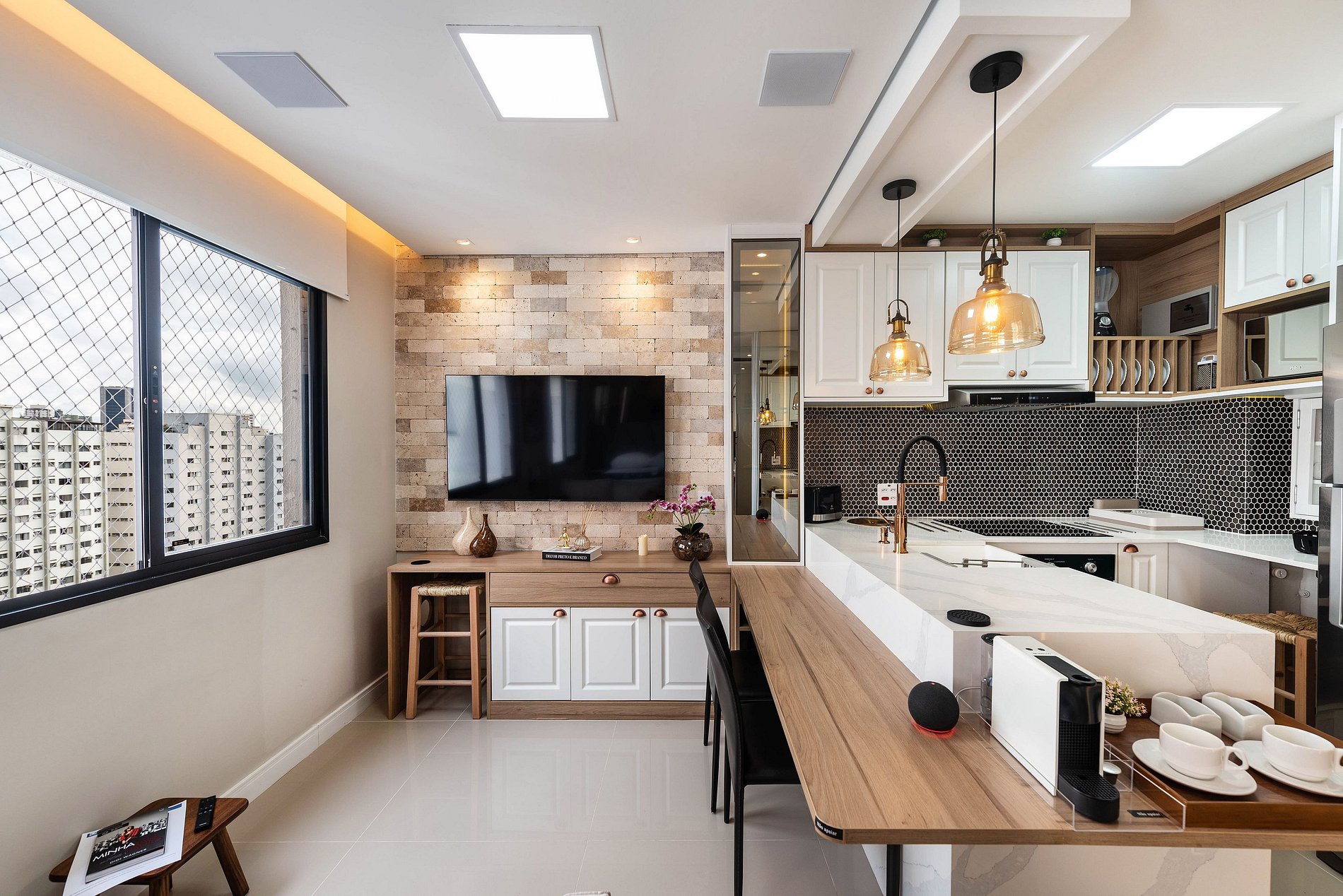 O apartamento conta com Wi-Fi de alta velocidade, ideal para trabalho ou lazer, além de interruptores digitais que trazem mais praticidade ao dia a dia.