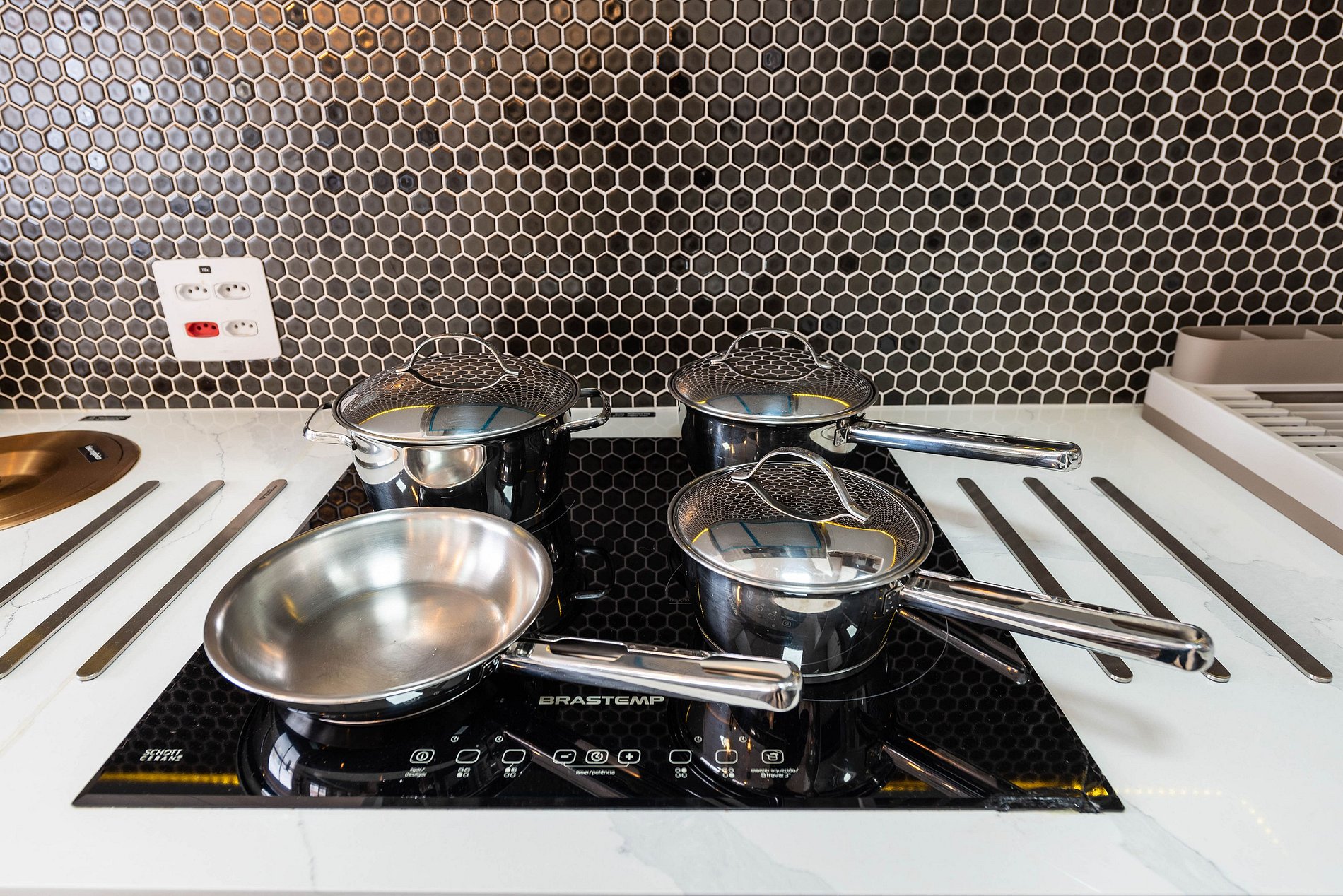 A cozinha dispõe de geladeira, cooktop e cafeteira Nespresso, além de panelas e utensílios, permitindo preparar suas refeições com praticidade durante a estadia.