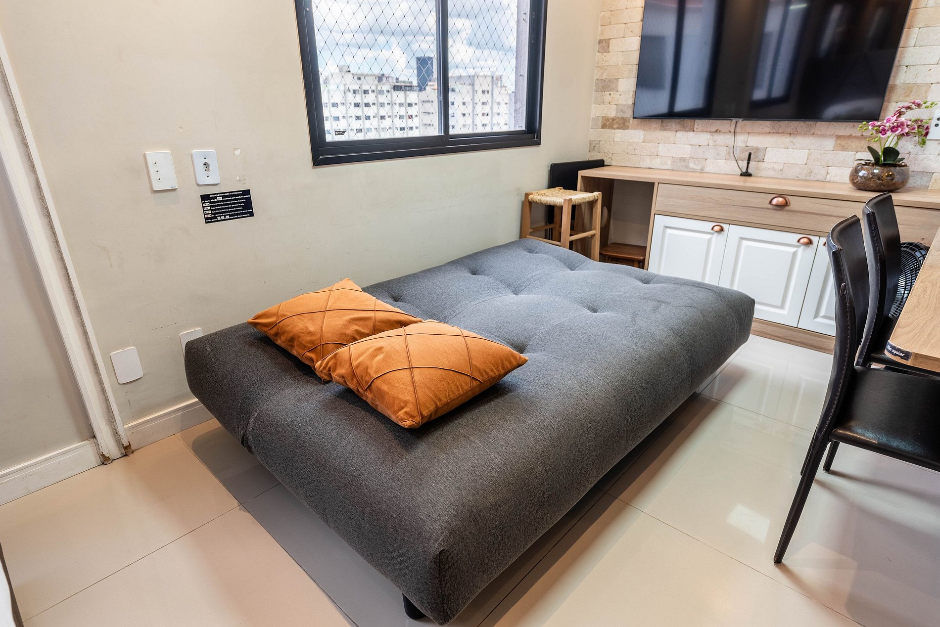 O ambiente conta com sofá-cama, mesa para trabalho ou refeições e armários adicionais, oferecendo praticidade, conforto e flexibilidade durante a estadia.