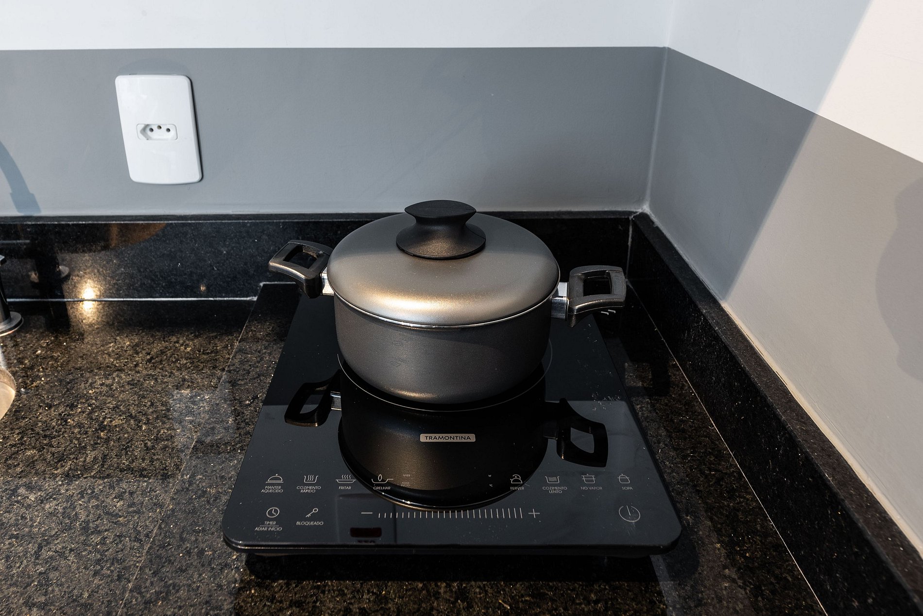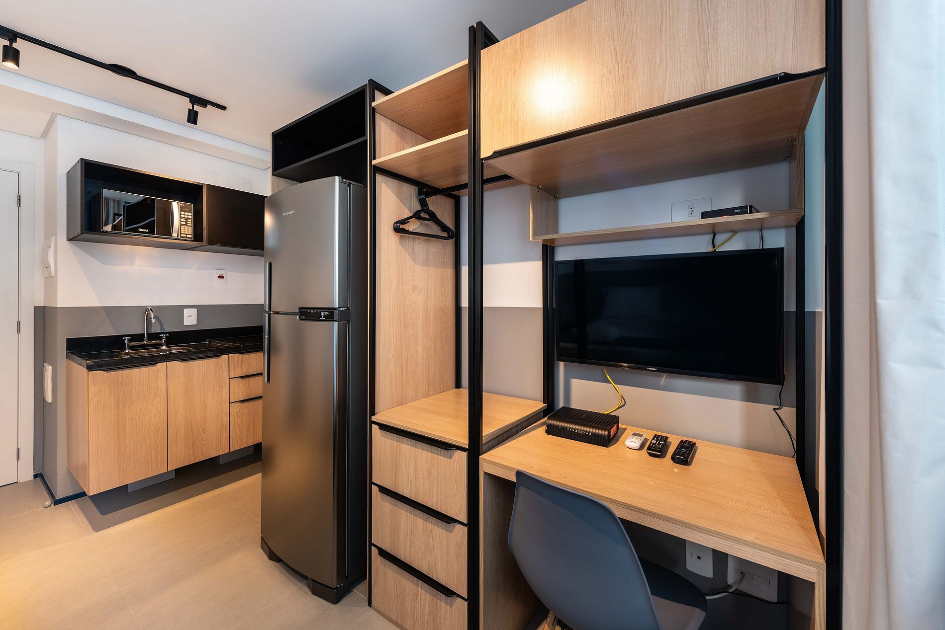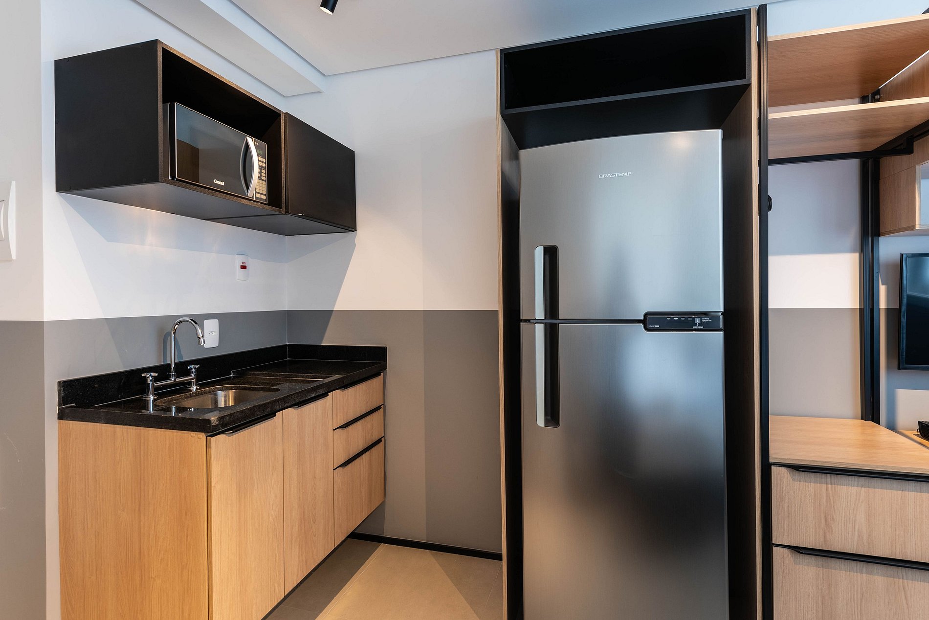 ・Cozinha completa: equipada com frigobar, fogão de indução (uma boca), micro-ondas etc.