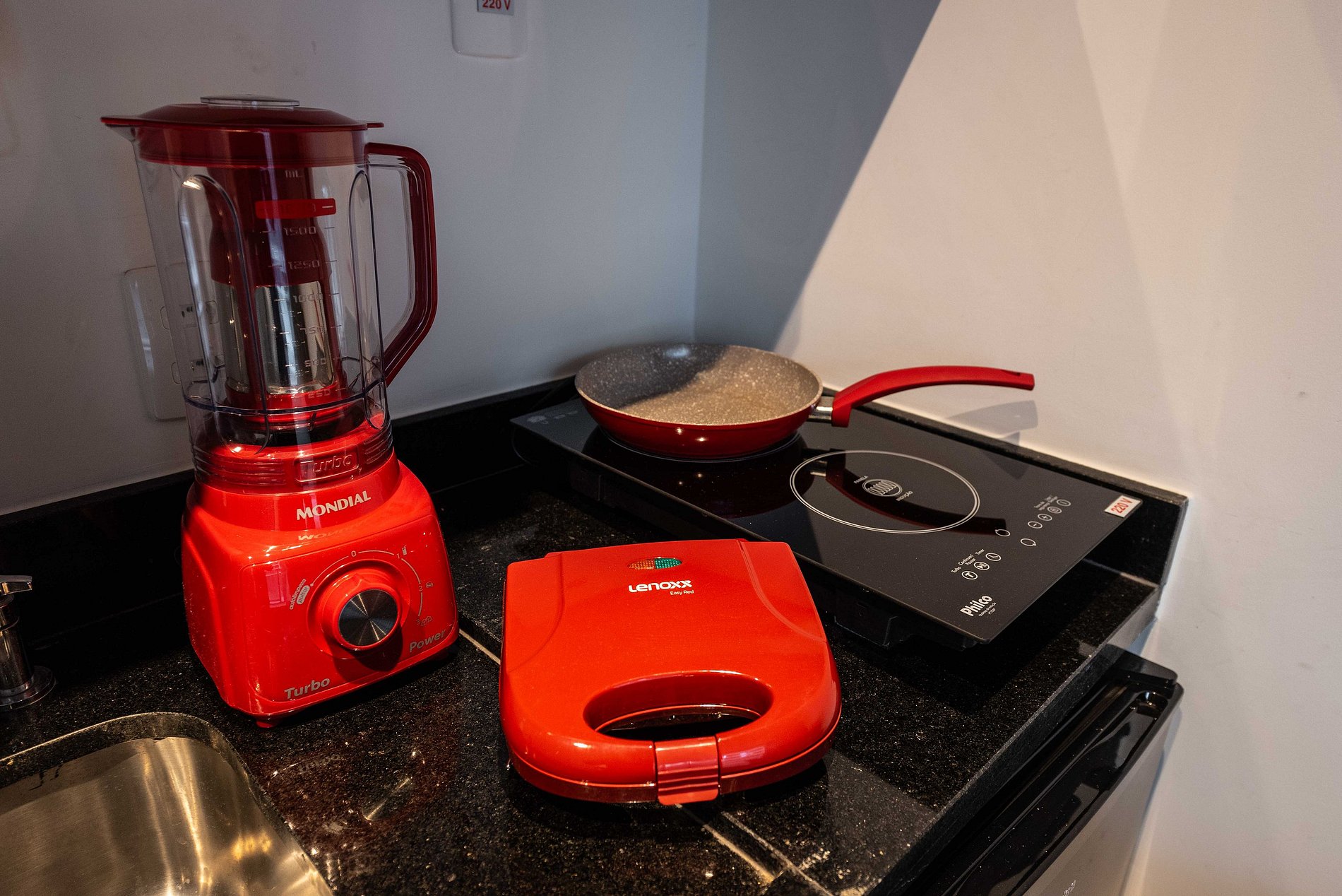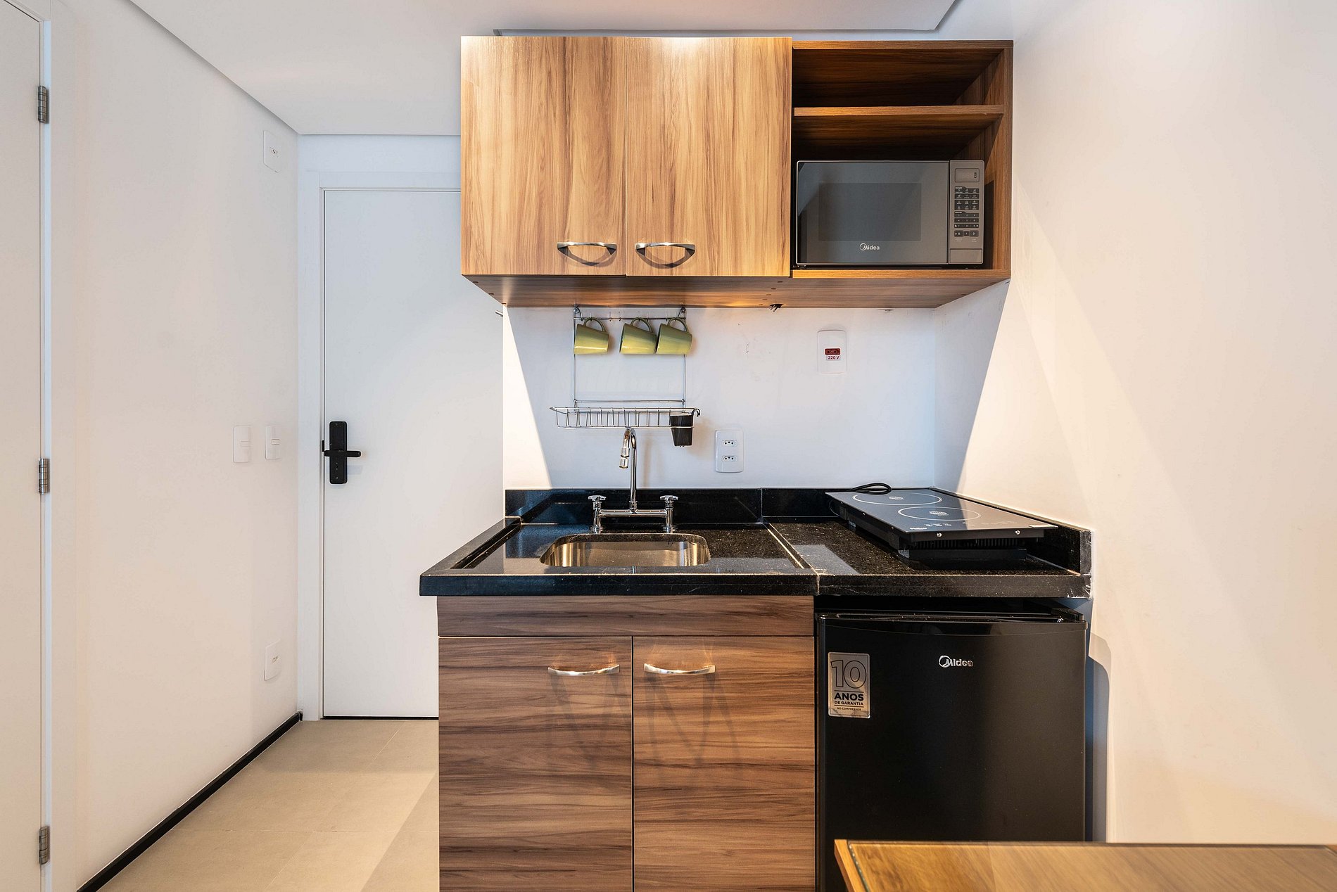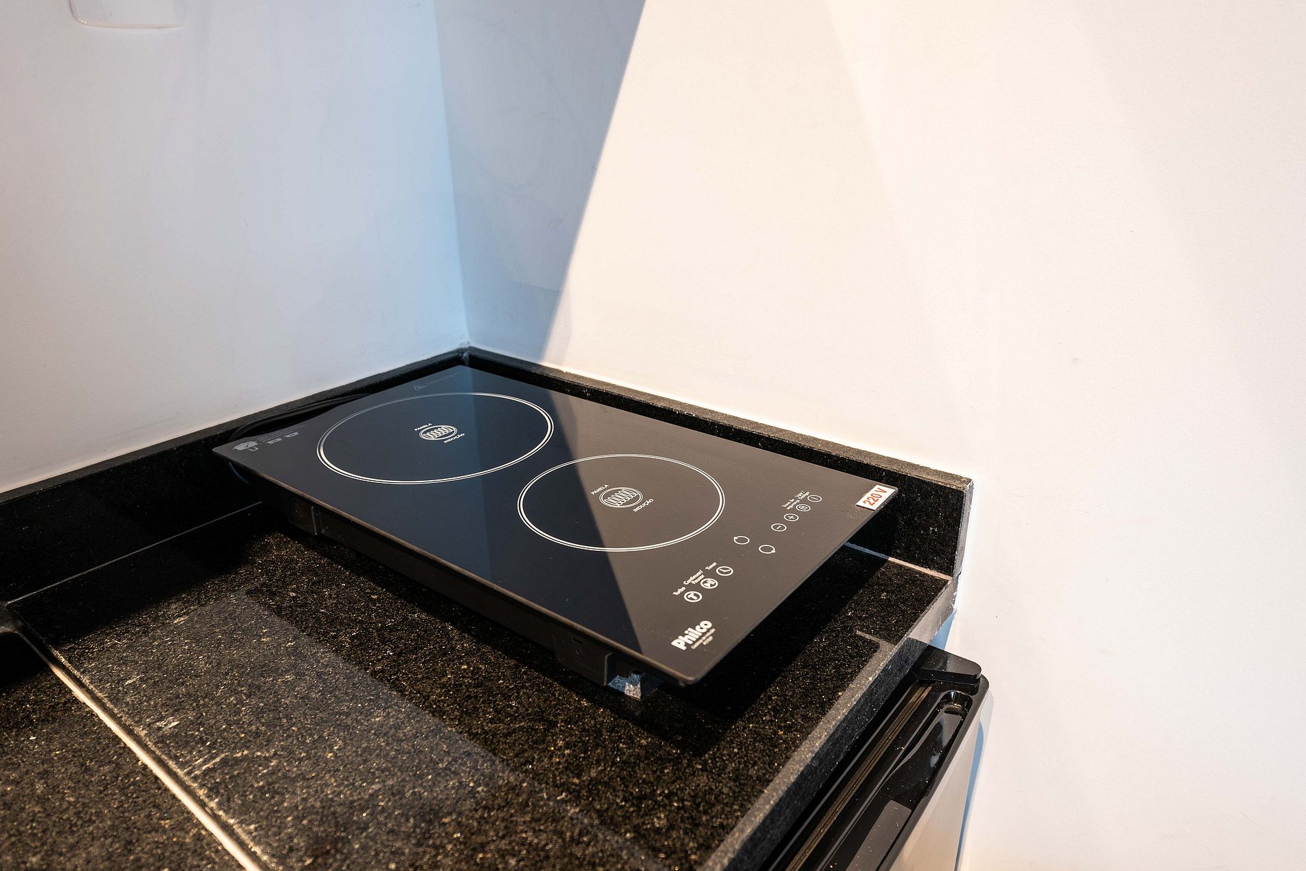 ・Cozinha equipada com frigobar, cooktop por indução (2 boca), micro-ondas e utensílios essenciais