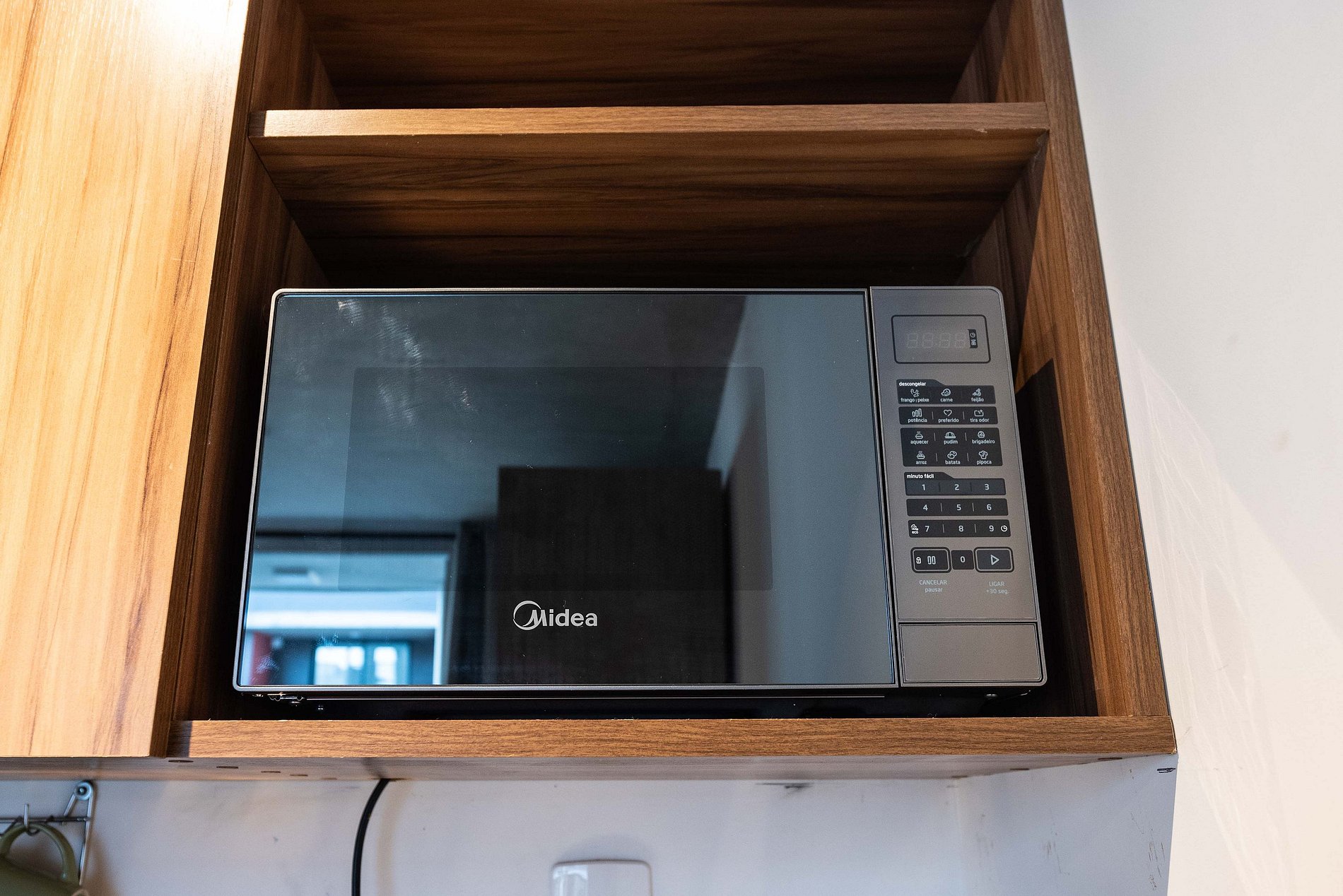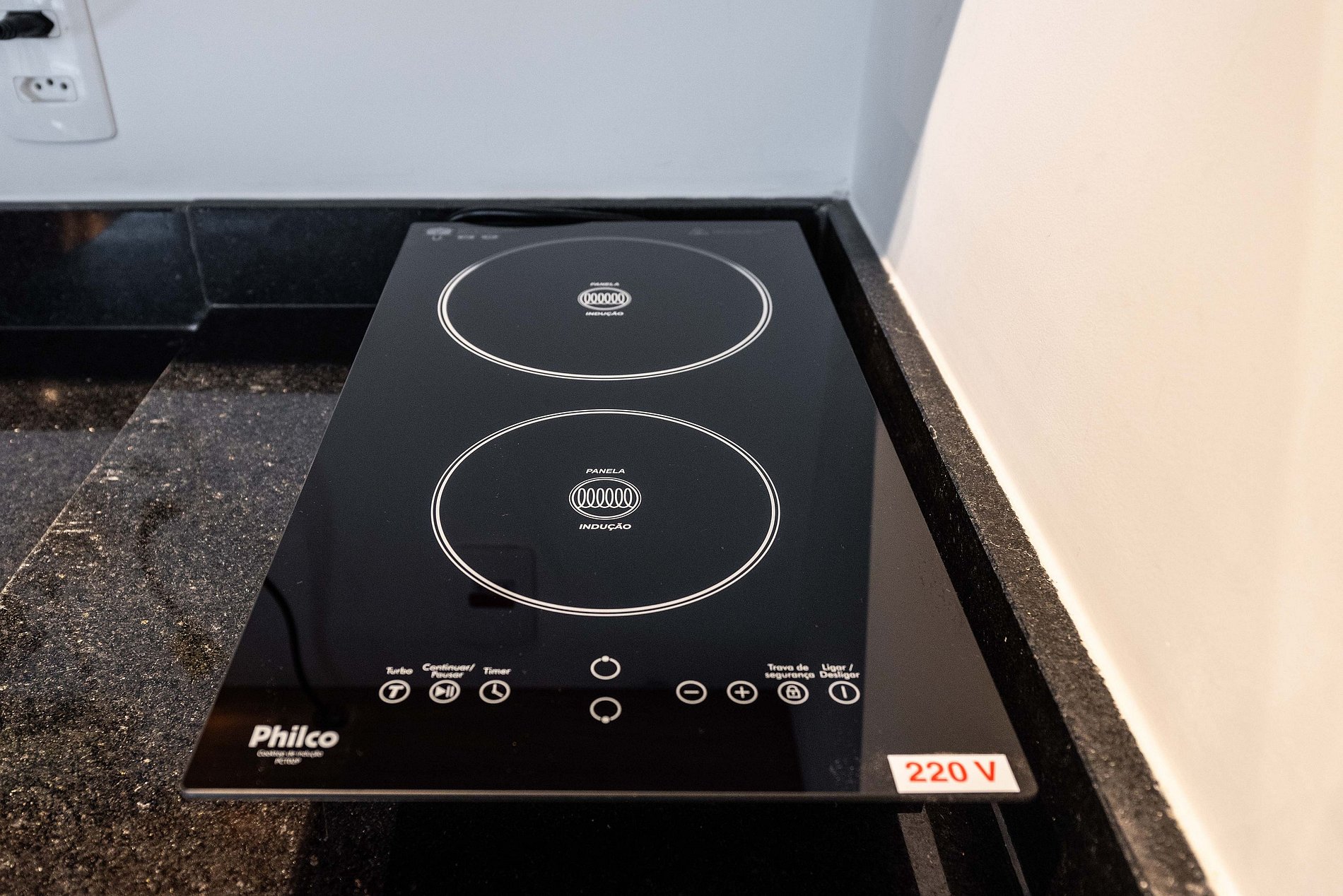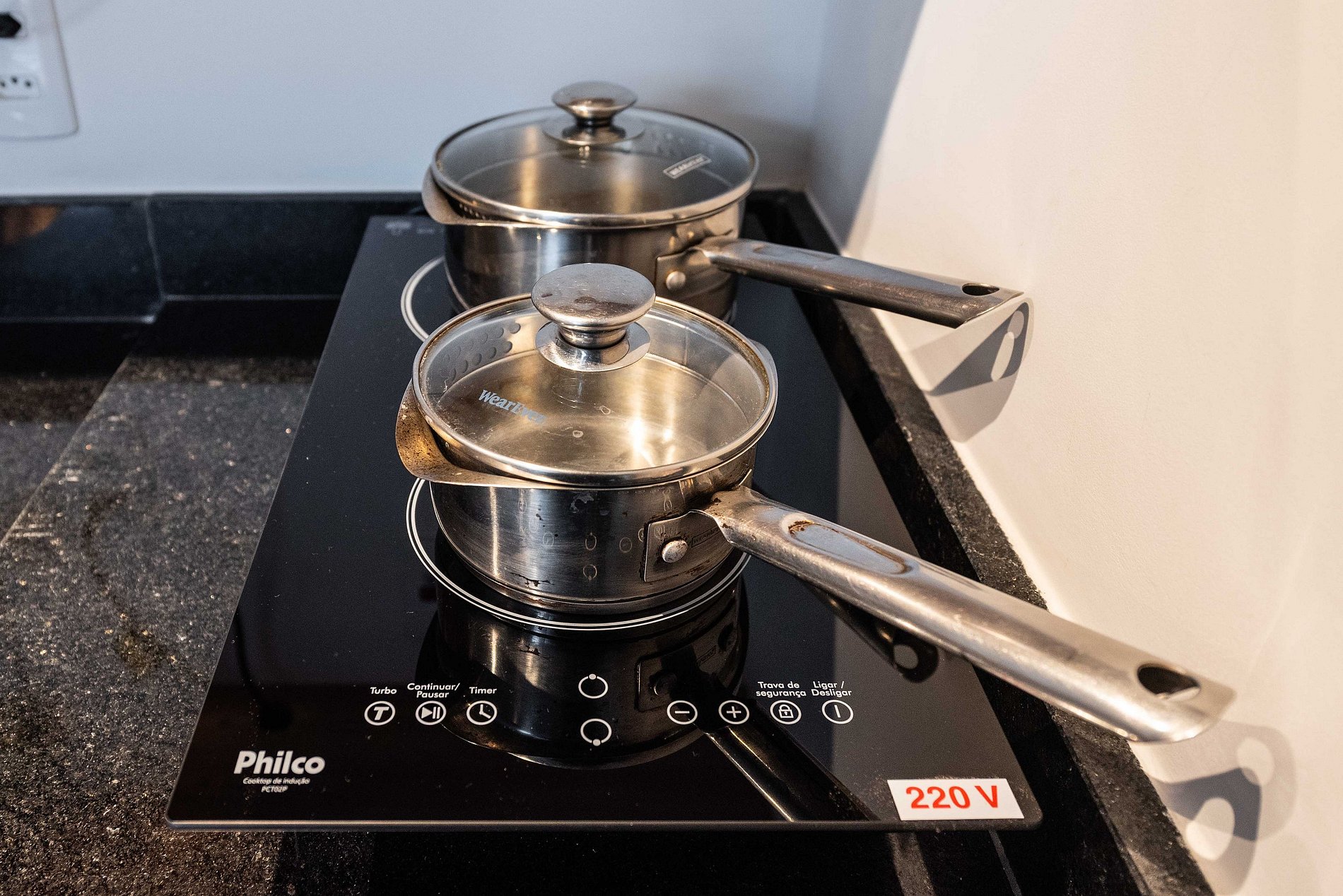 ・Cozinha equipada com frigobar, cooktop por indução (2 boca), micro-ondas e utensílios essenciais
