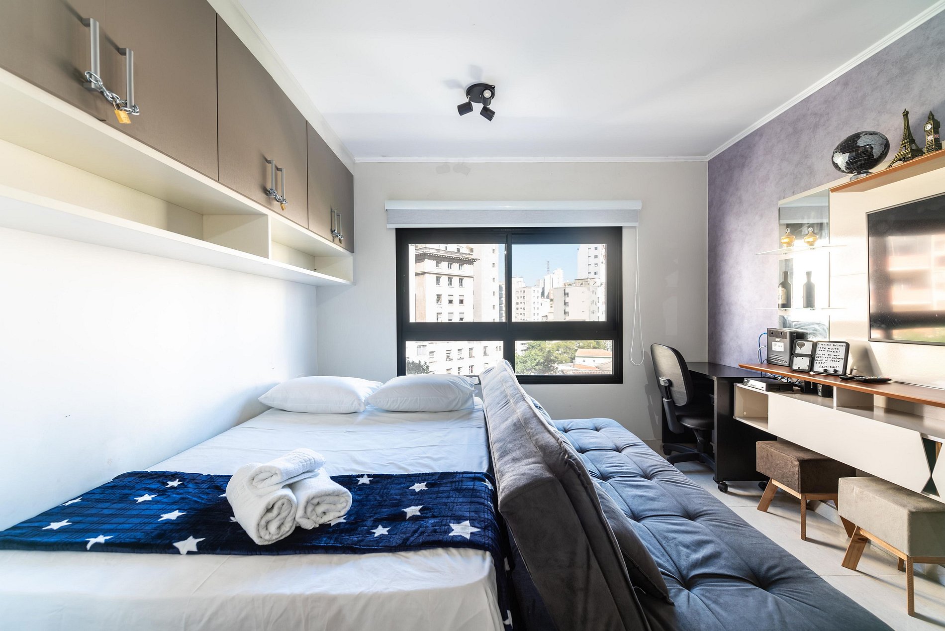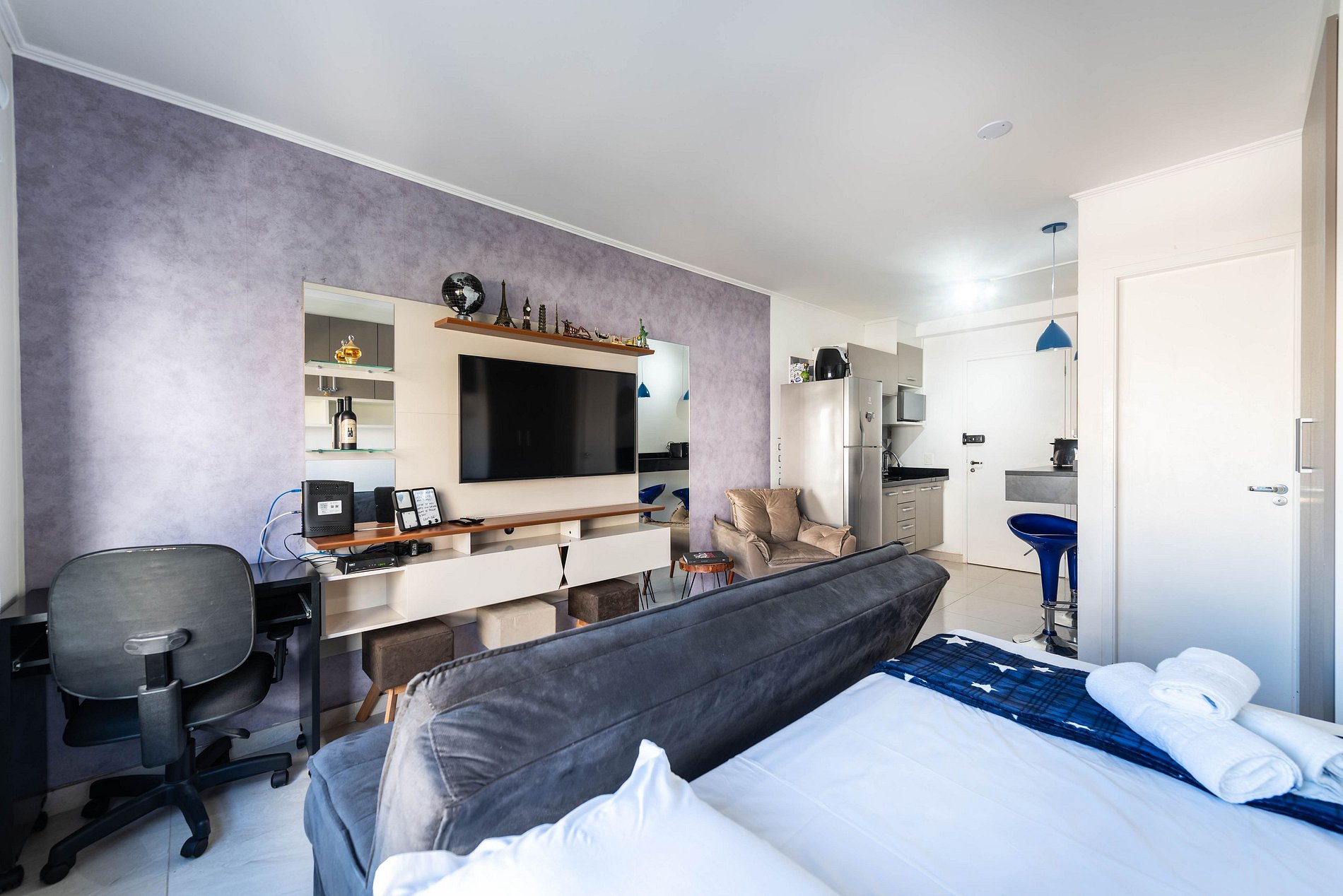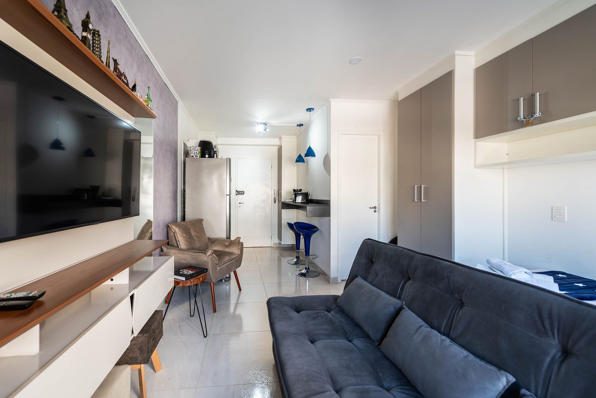 Nosso estúdio funcional acomoda até 4 pessoas. Este espaço inteligente oferece comodidades modernas para uma estadia confortável. Com uma área integrada que inclui uma cozinha completa, área de estar e dormir, este estúdio é perfeito para quem procura praticidade e conforto durante sua estadia na cidade.