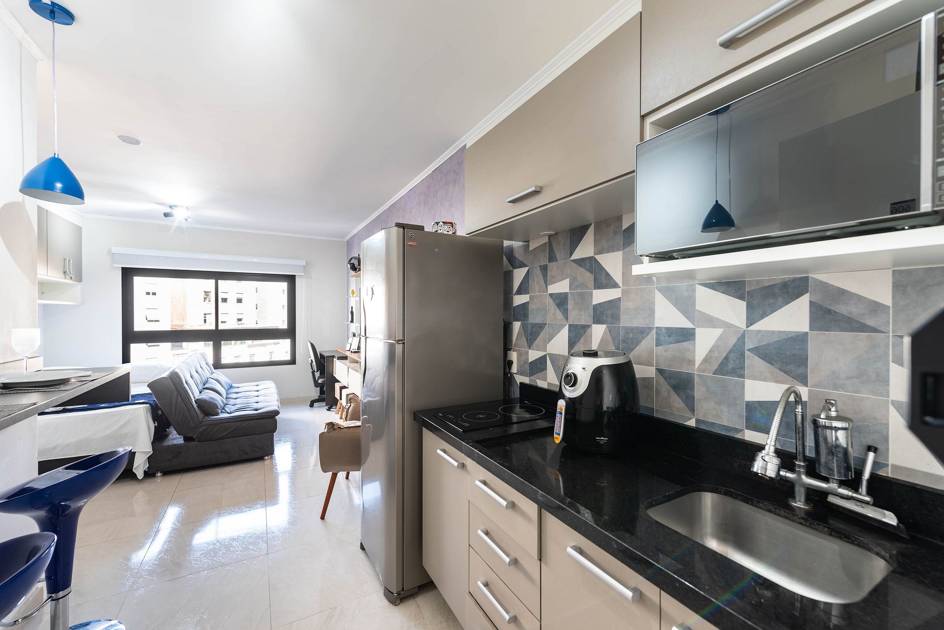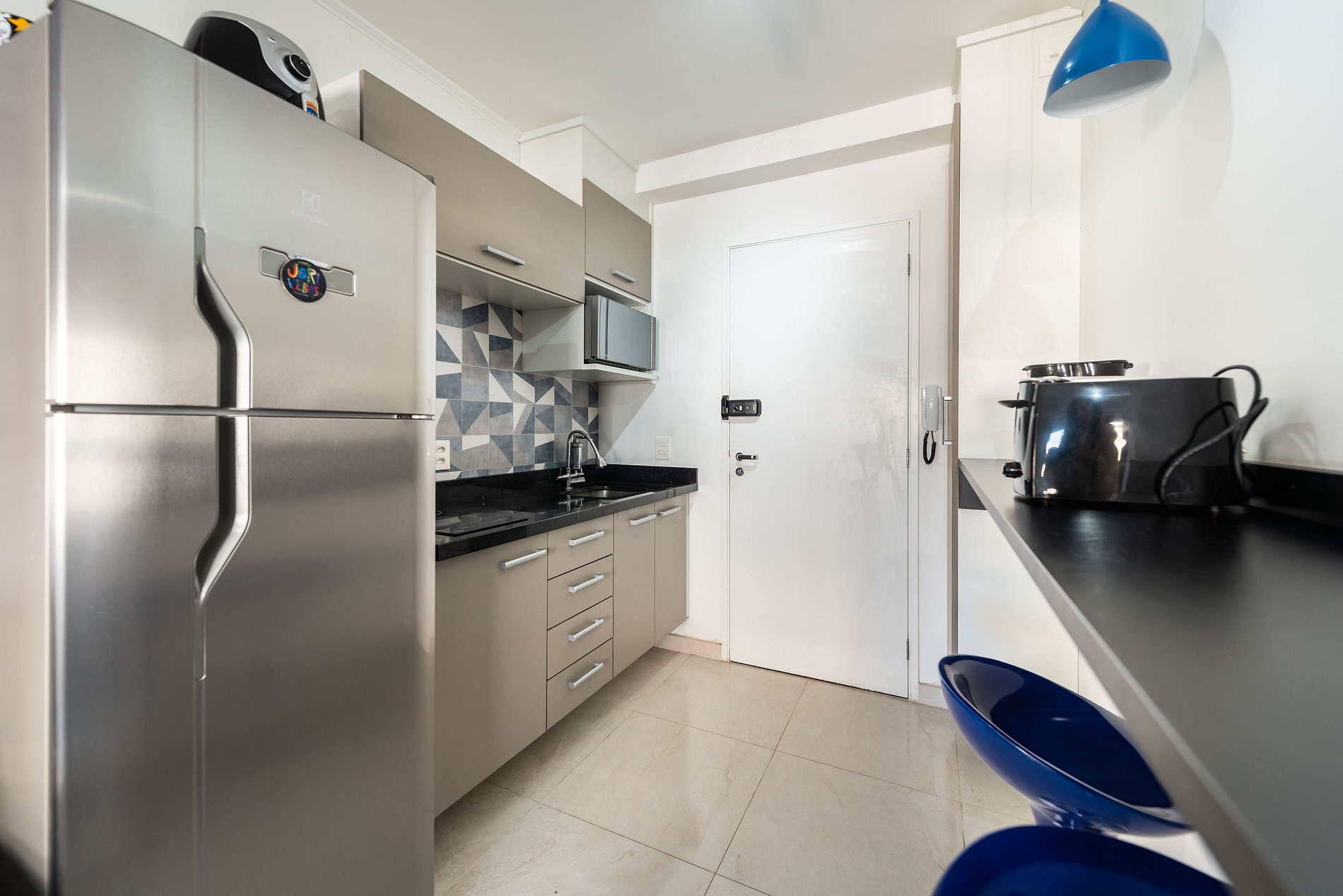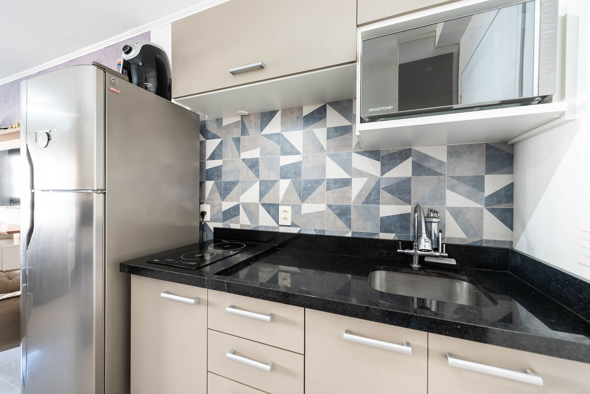 ・Cozinha completa: equipada com geladeira, fogão de indução, micro-ondas etc.